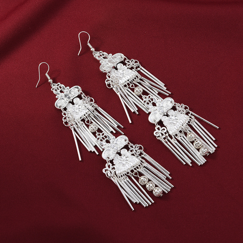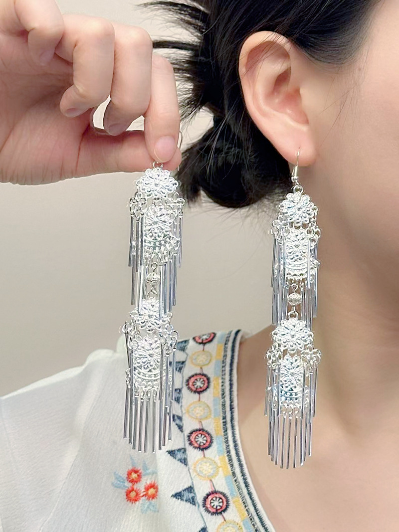 新中式小众双层苗银耳环复古民族风流苏个性长款耳坠女中国风耳饰