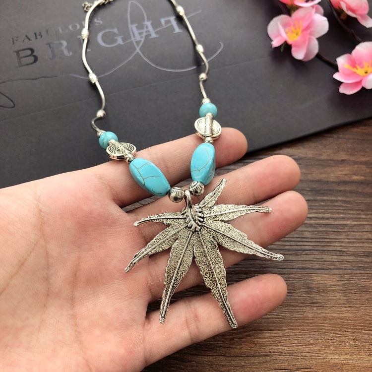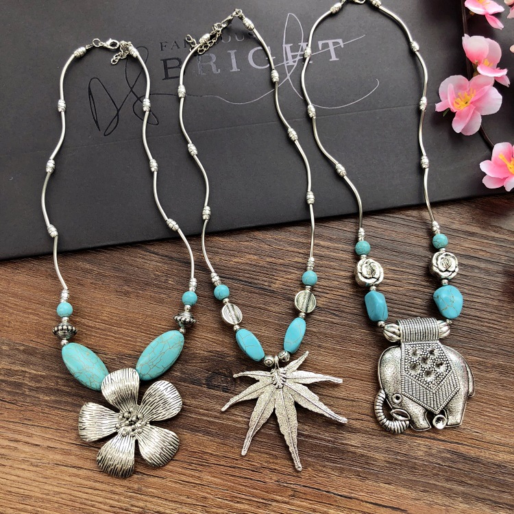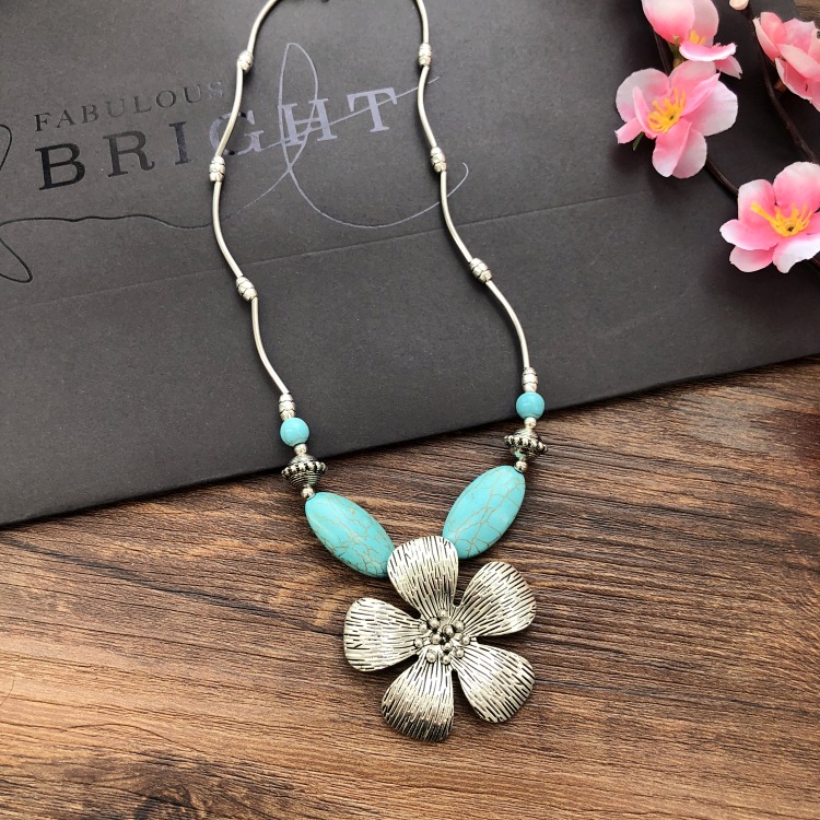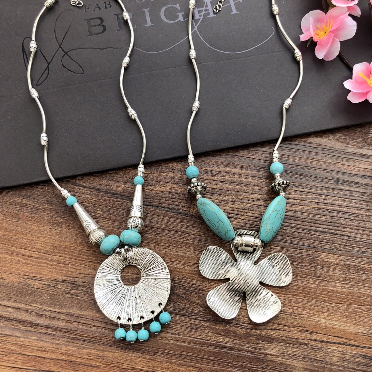 手工欧美民族风藏银松石短款项链 复古气质简约个性吊坠挂件配饰