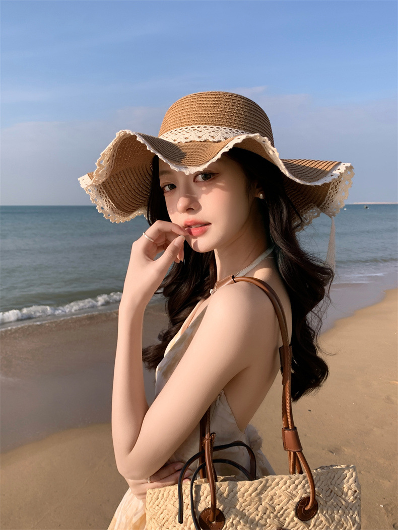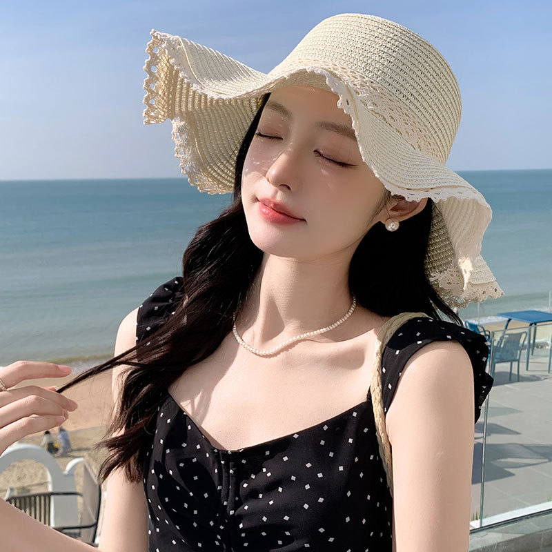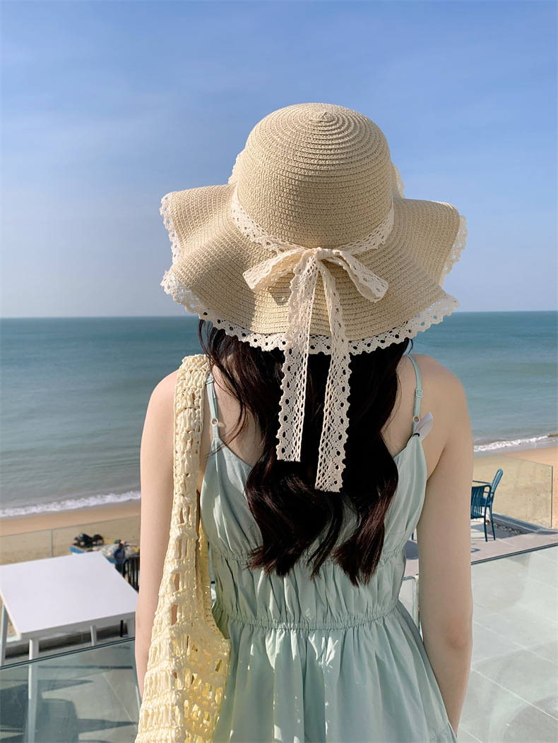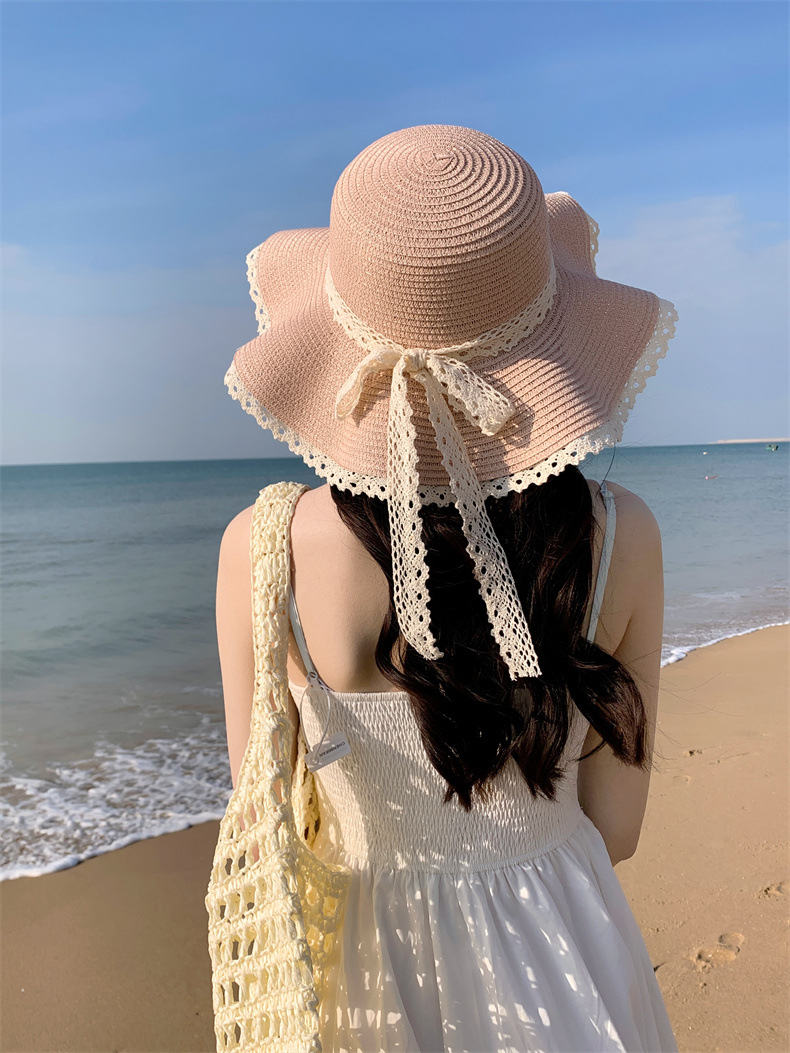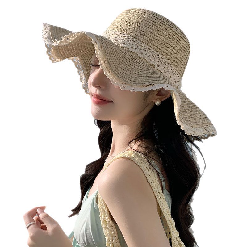 夏季蕾丝花遮阳帽子女士韩版波浪沿草帽显脸小防晒太阳帽草帽现货