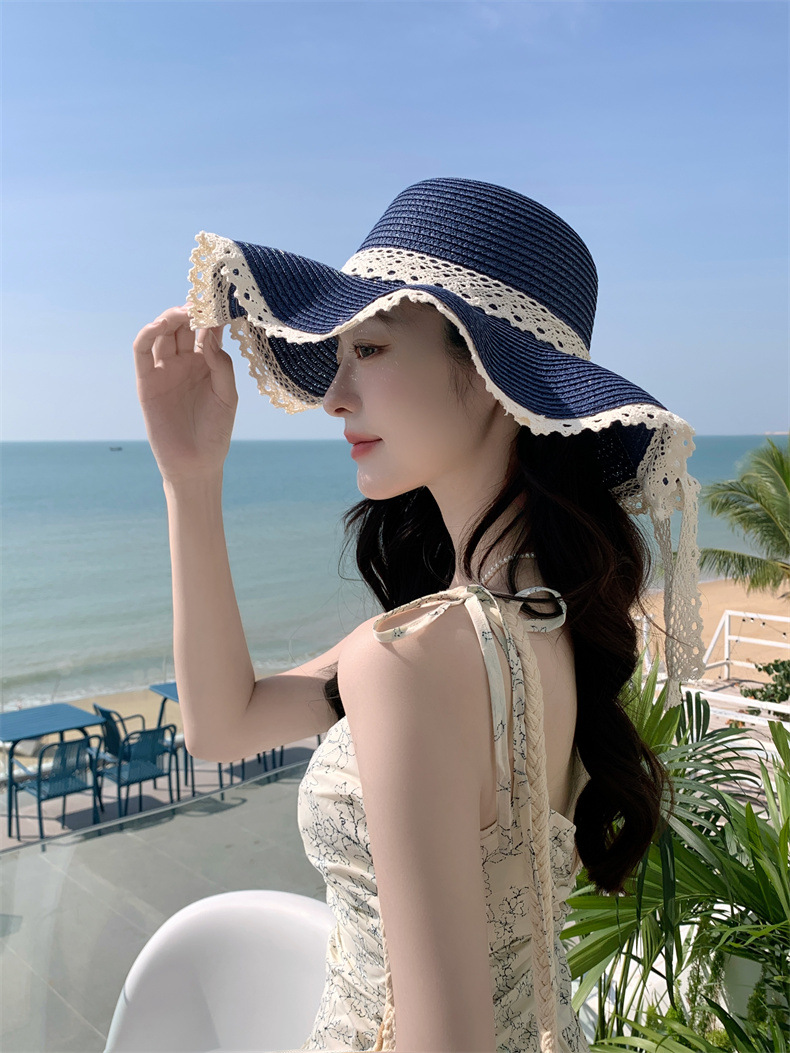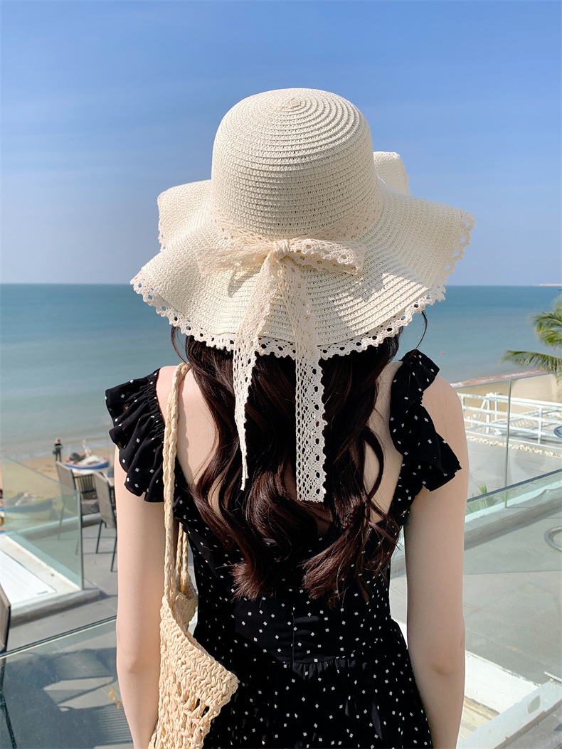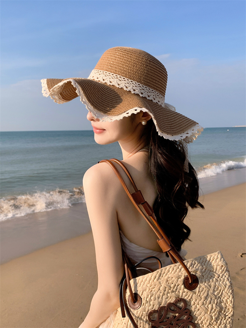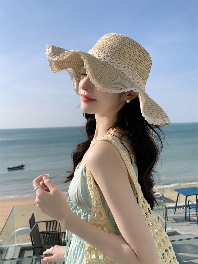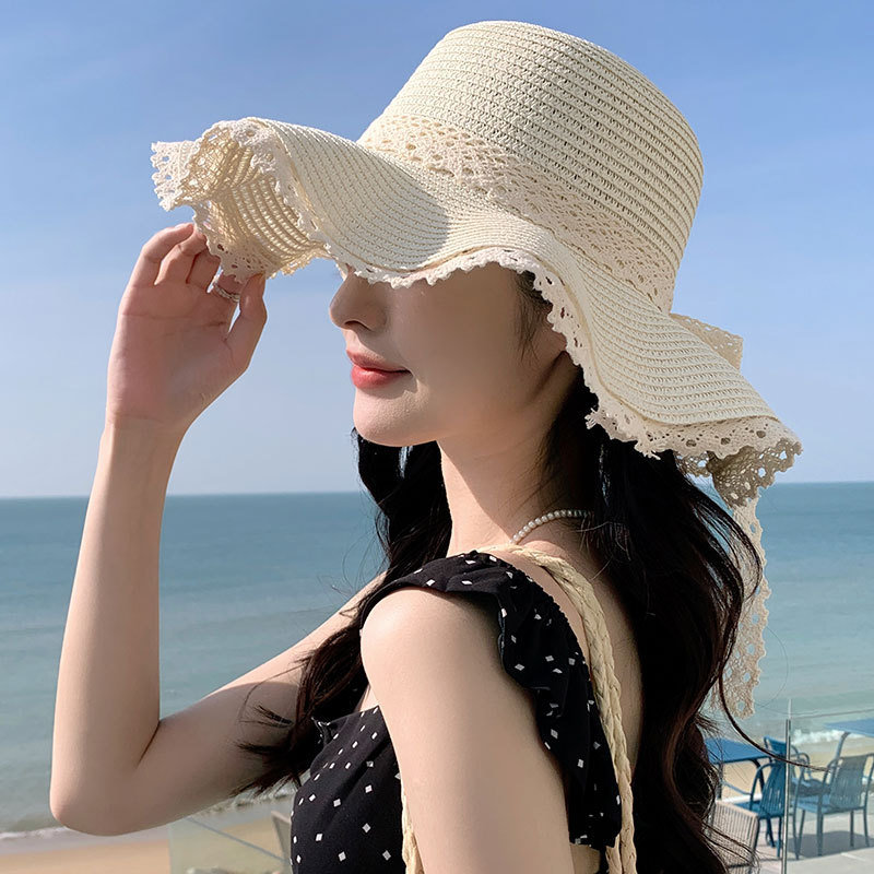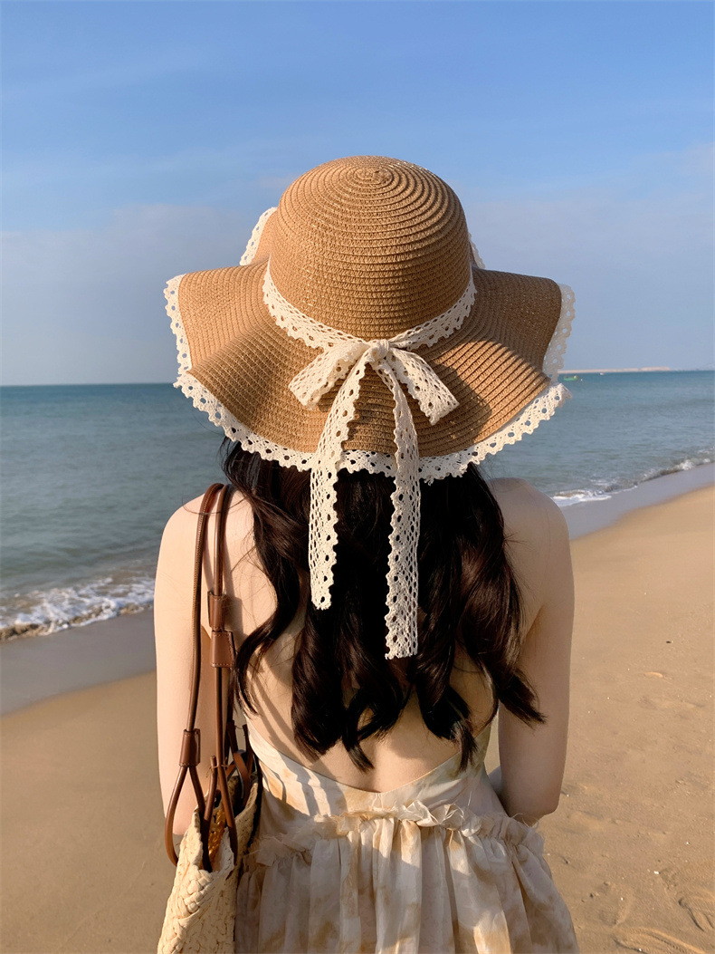 夏季蕾丝花遮阳帽子女士韩版波浪沿草帽显脸小防晒太阳帽草帽现货