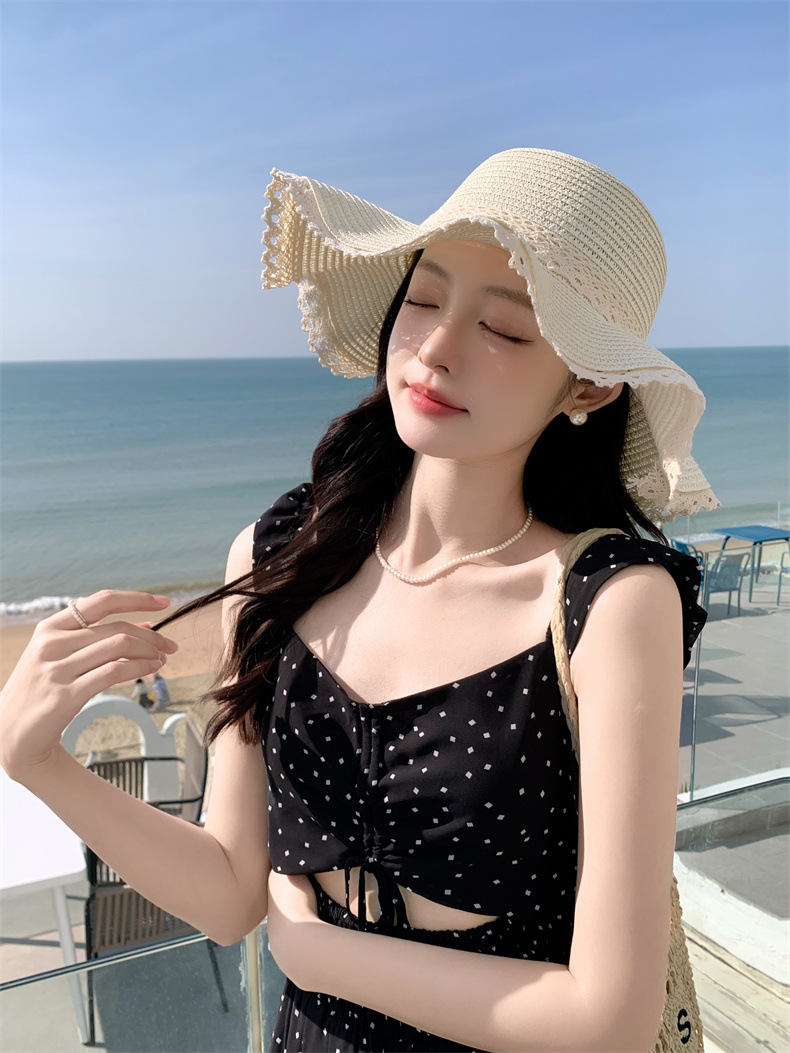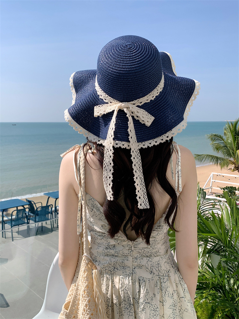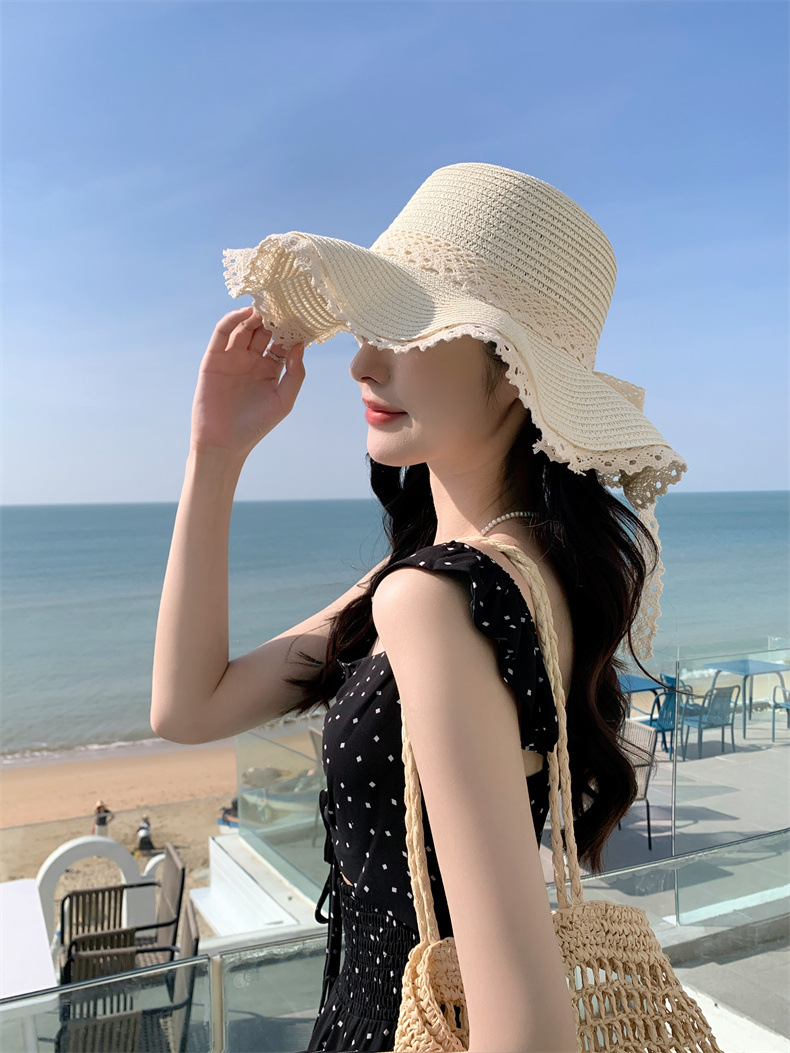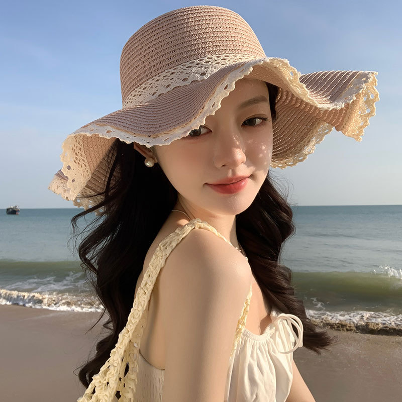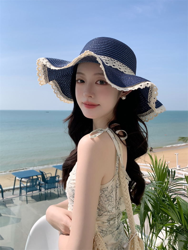 夏季蕾丝花遮阳帽子女士韩版波浪沿草帽显脸小防晒太阳帽草帽现货