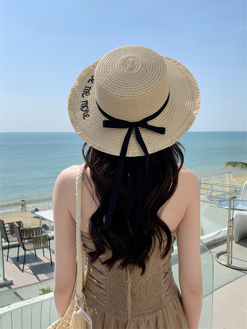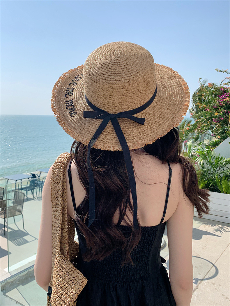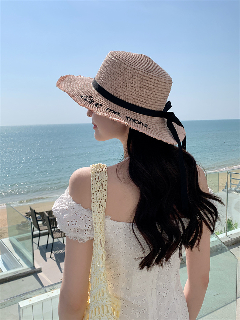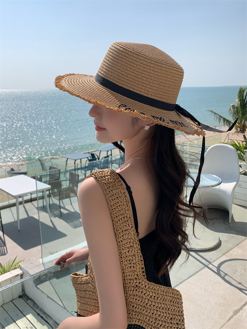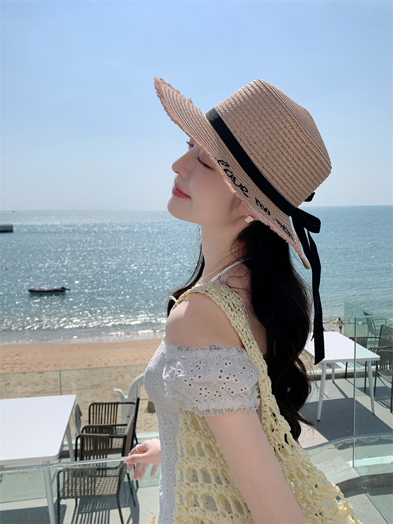海边度假风草帽女夏季大帽檐防晒帽气质百搭沙滩太阳帽飘带遮阳帽