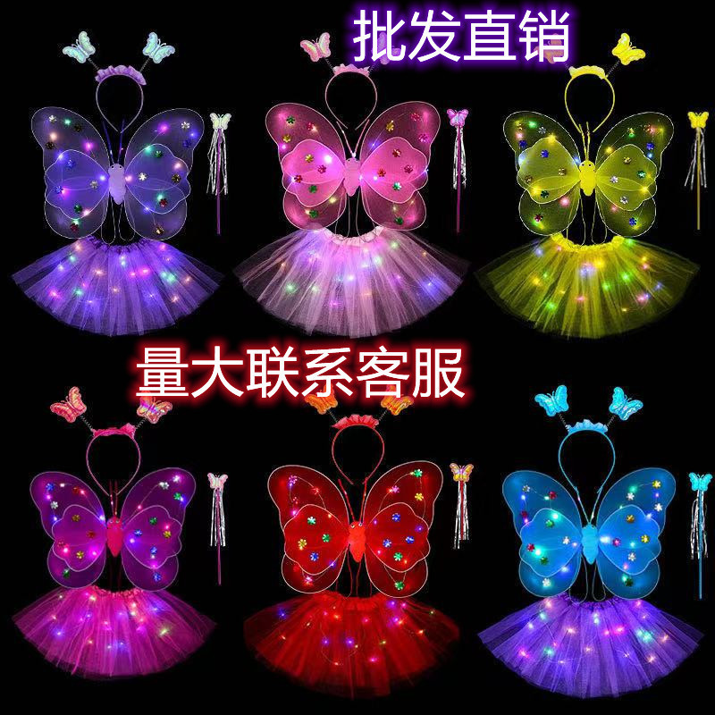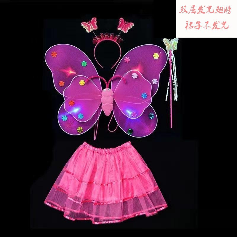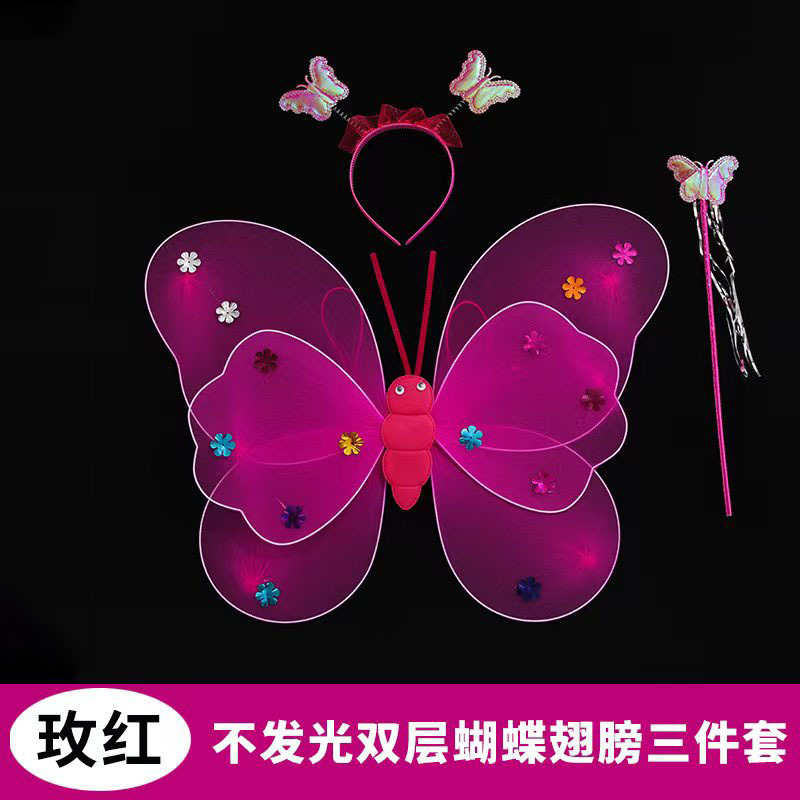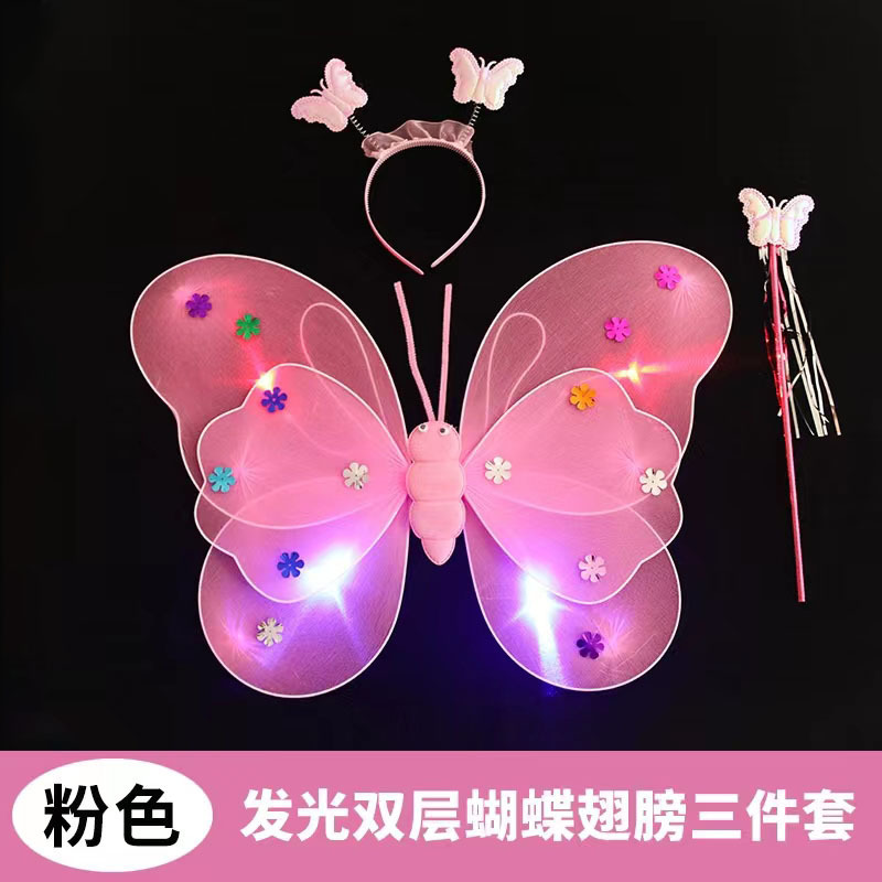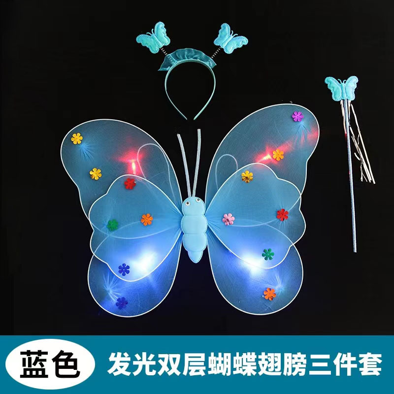 儿童发光蝴蝶翅膀批发双层带灯翅膀三件套背饰演出道具摆摊小玩具