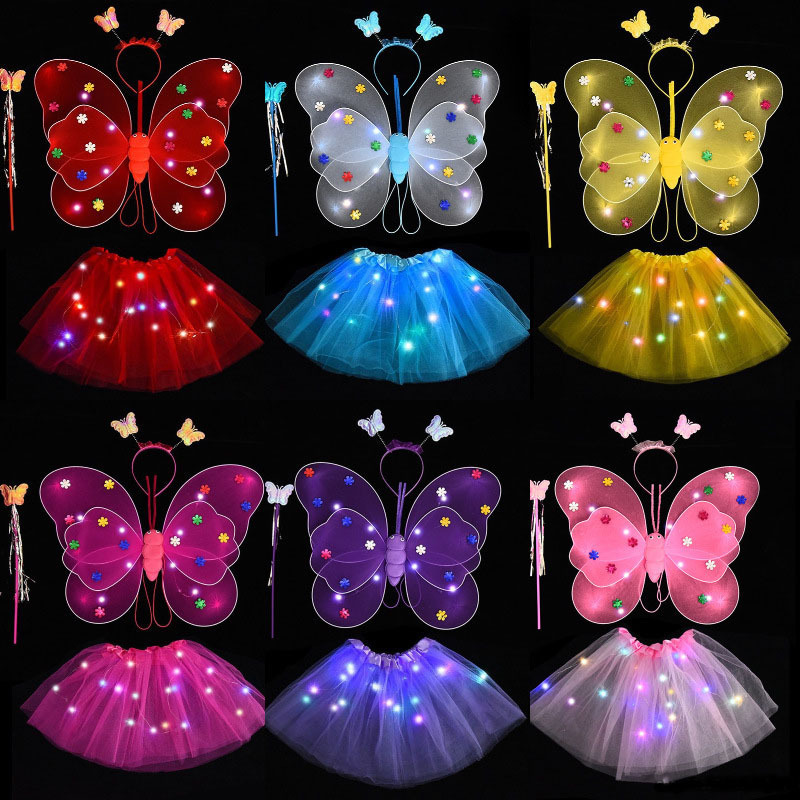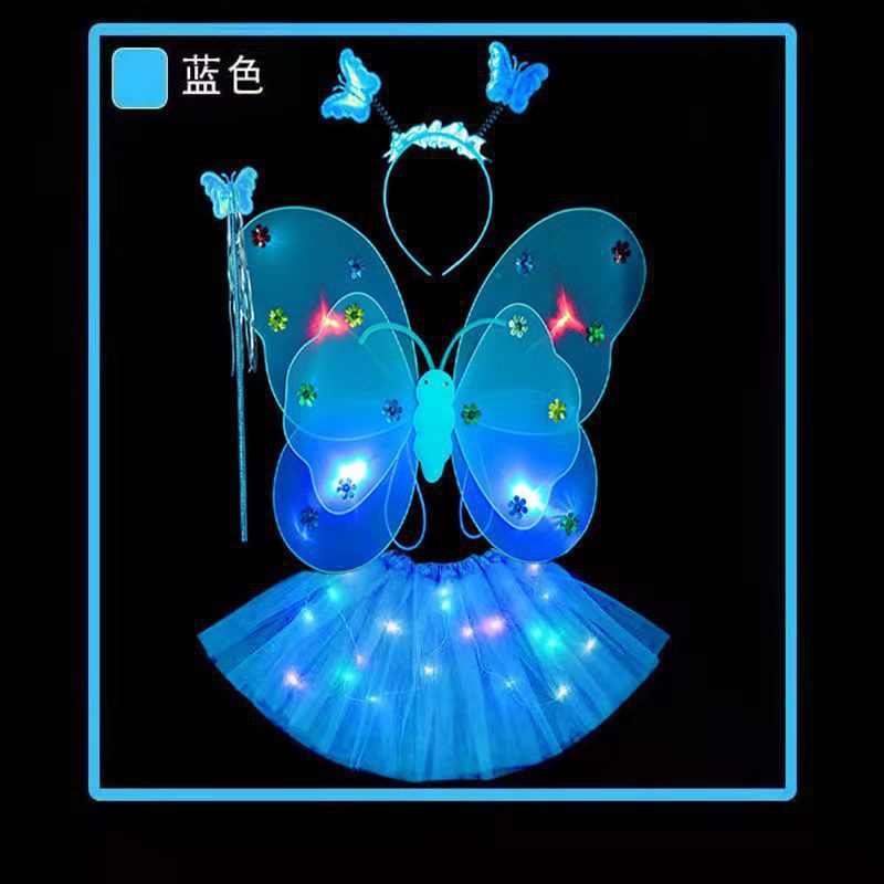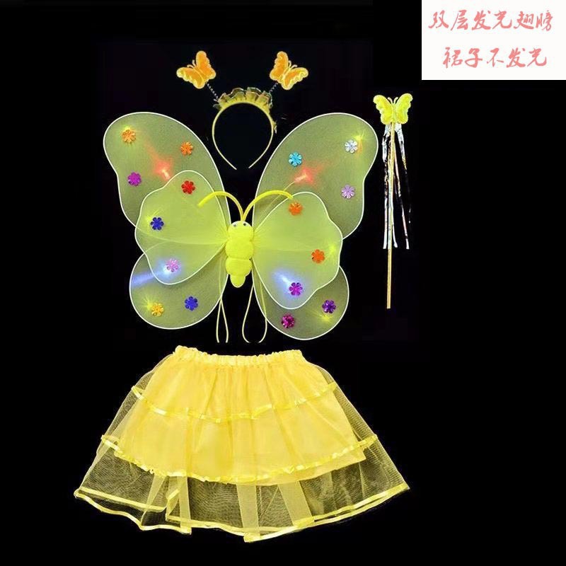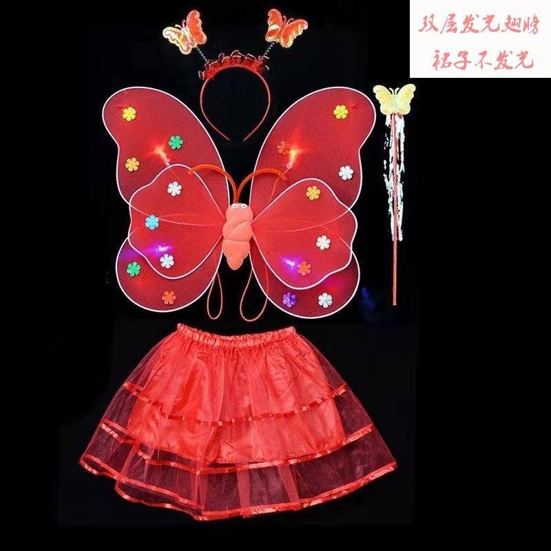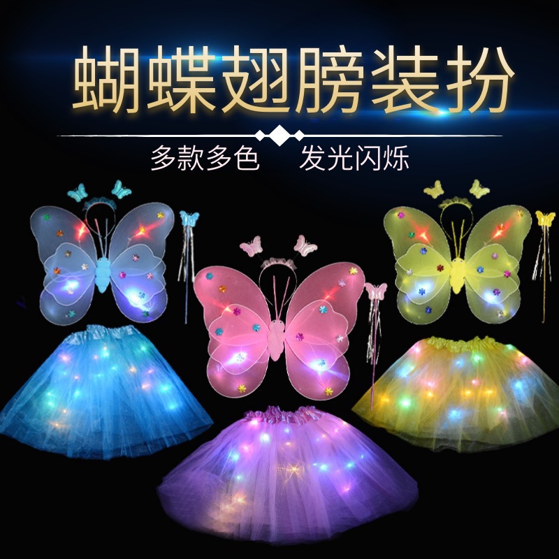 儿童发光蝴蝶翅膀批发双层带灯翅膀三件套背饰演出道具摆摊小玩具