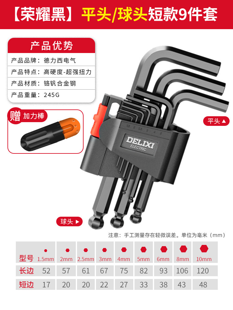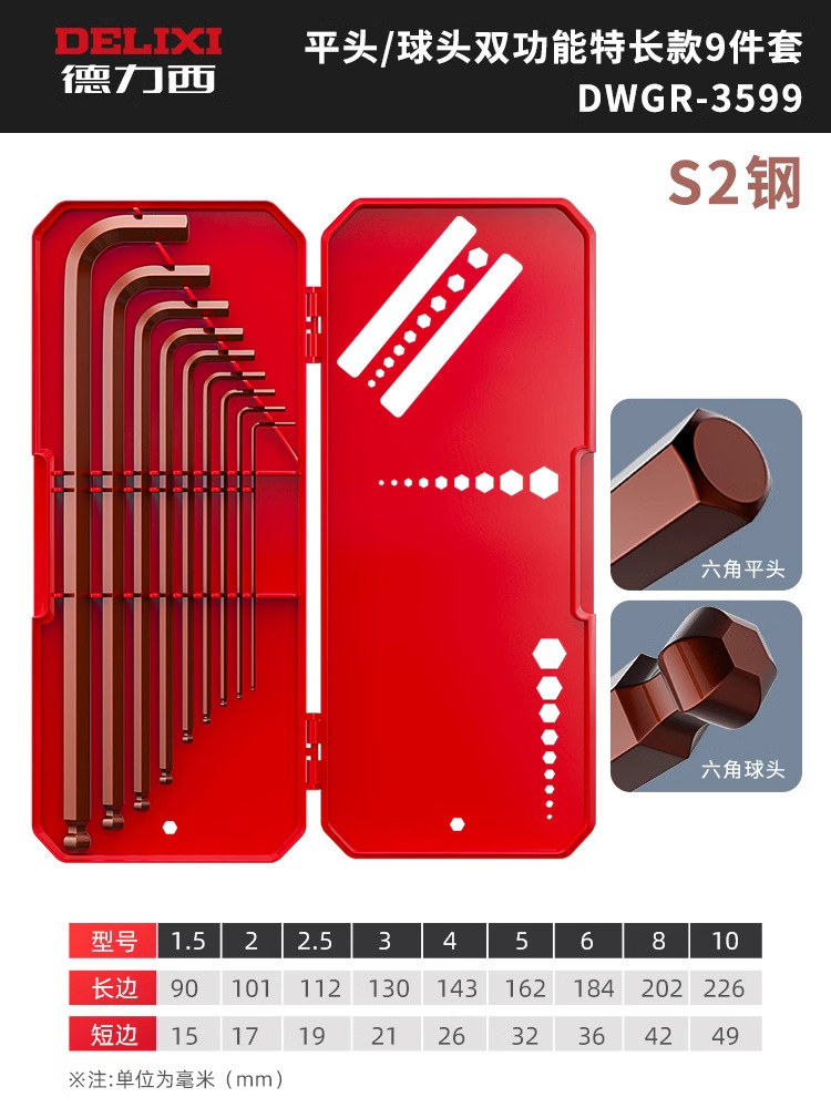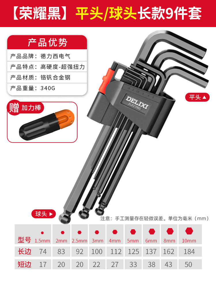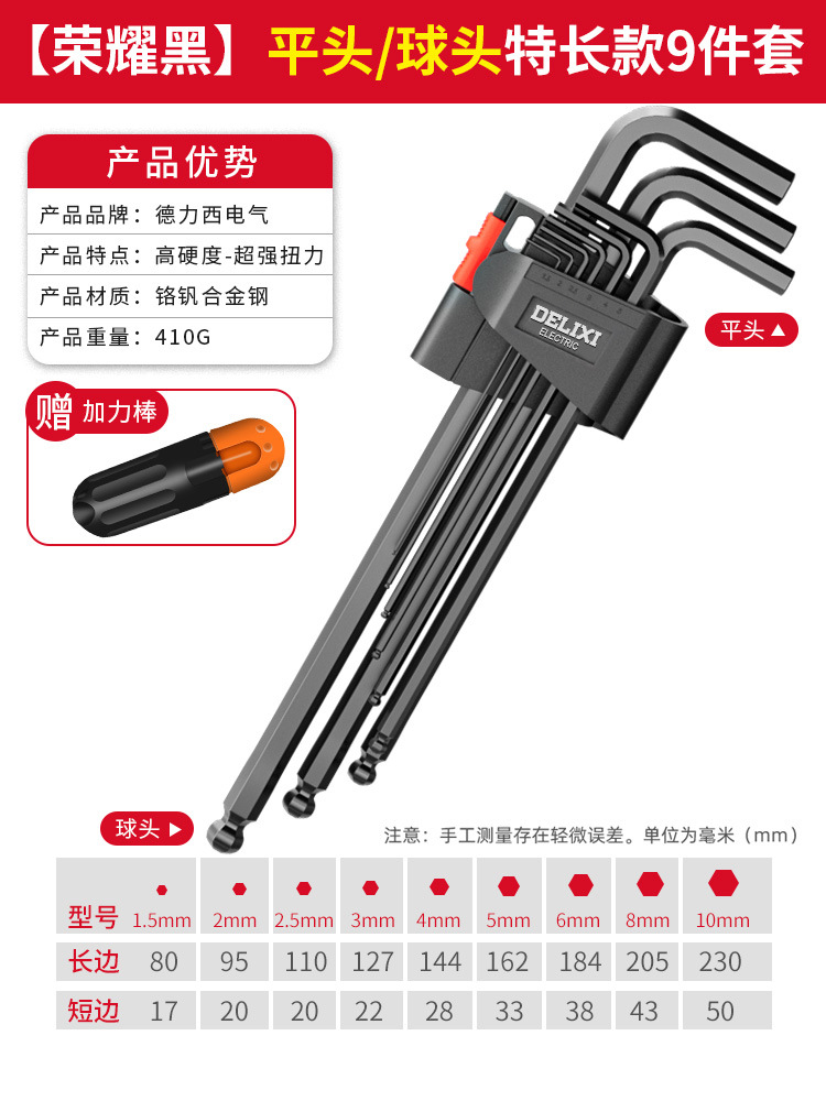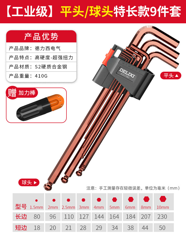 德力西内六角扳手9件套平头六棱内角加长球形L型S2合金内六角扳手