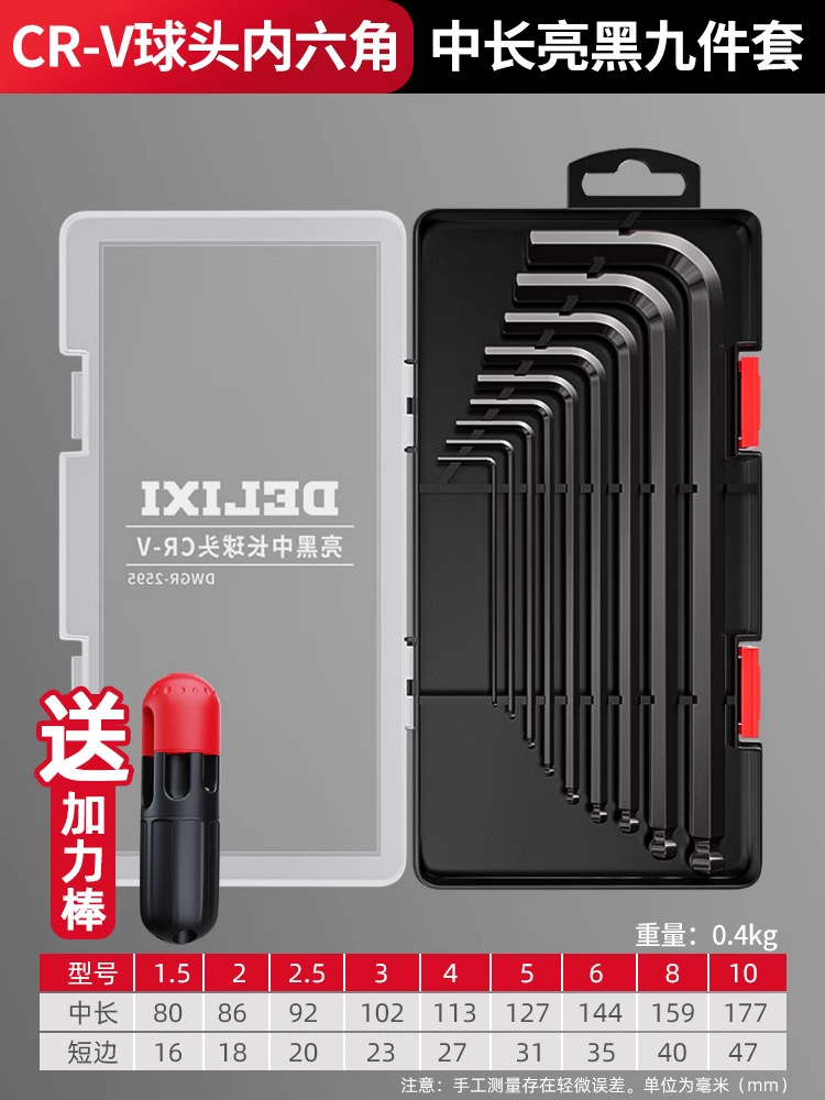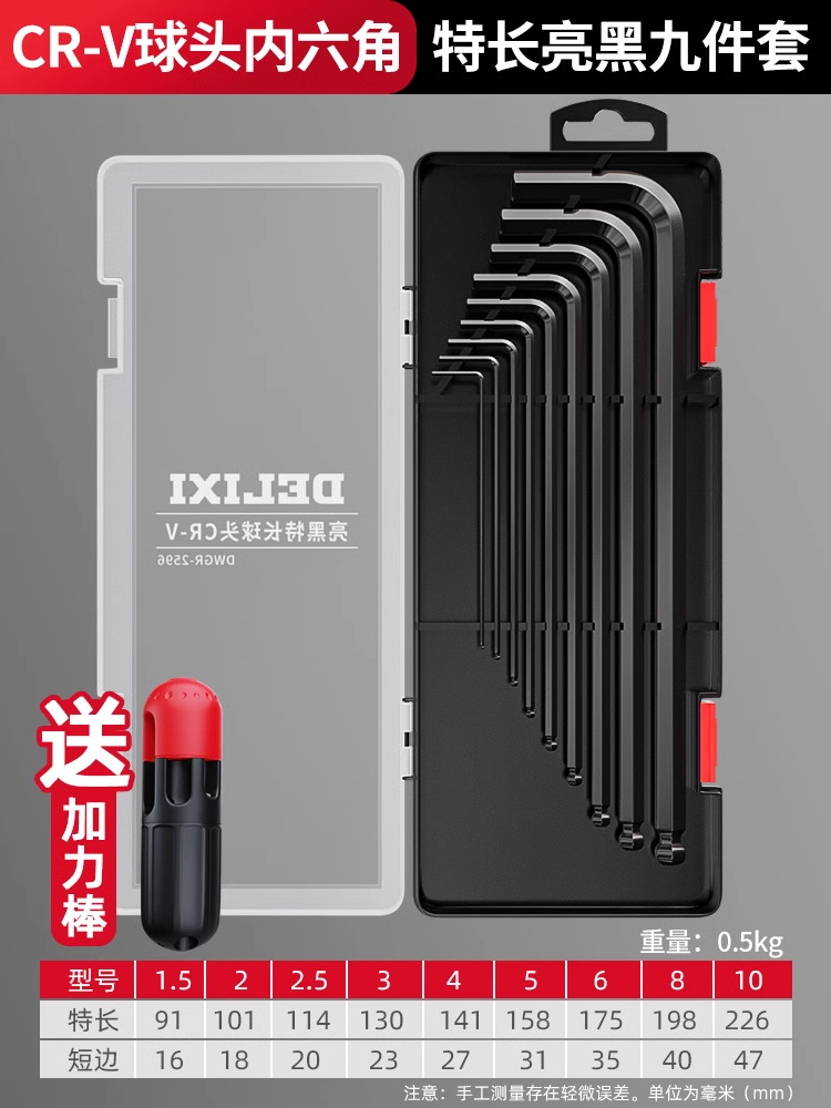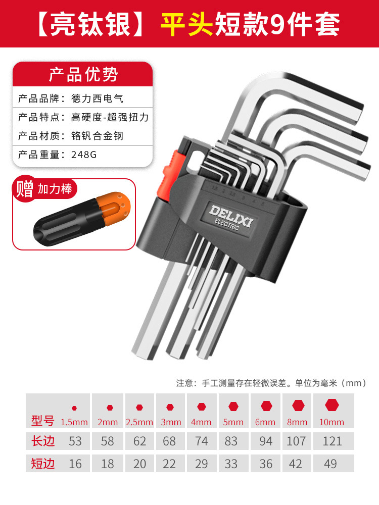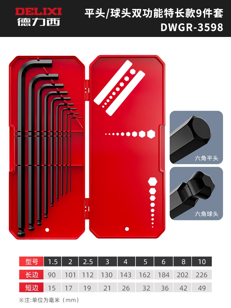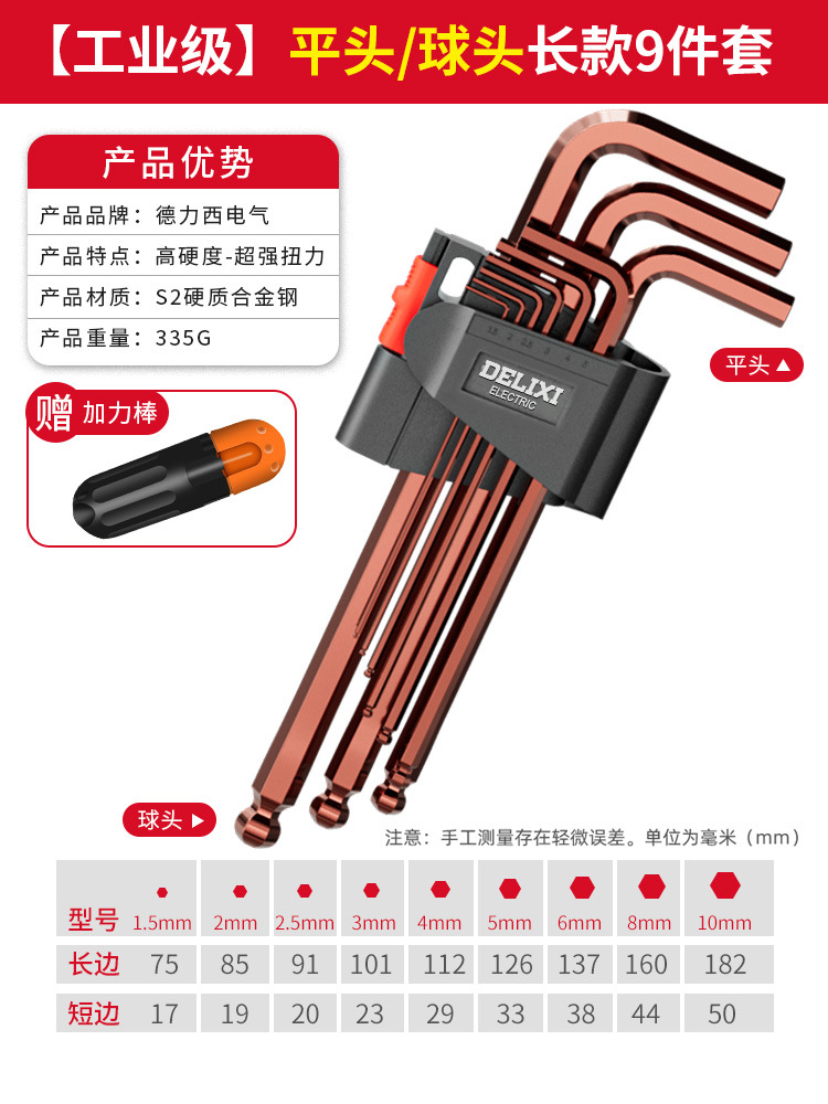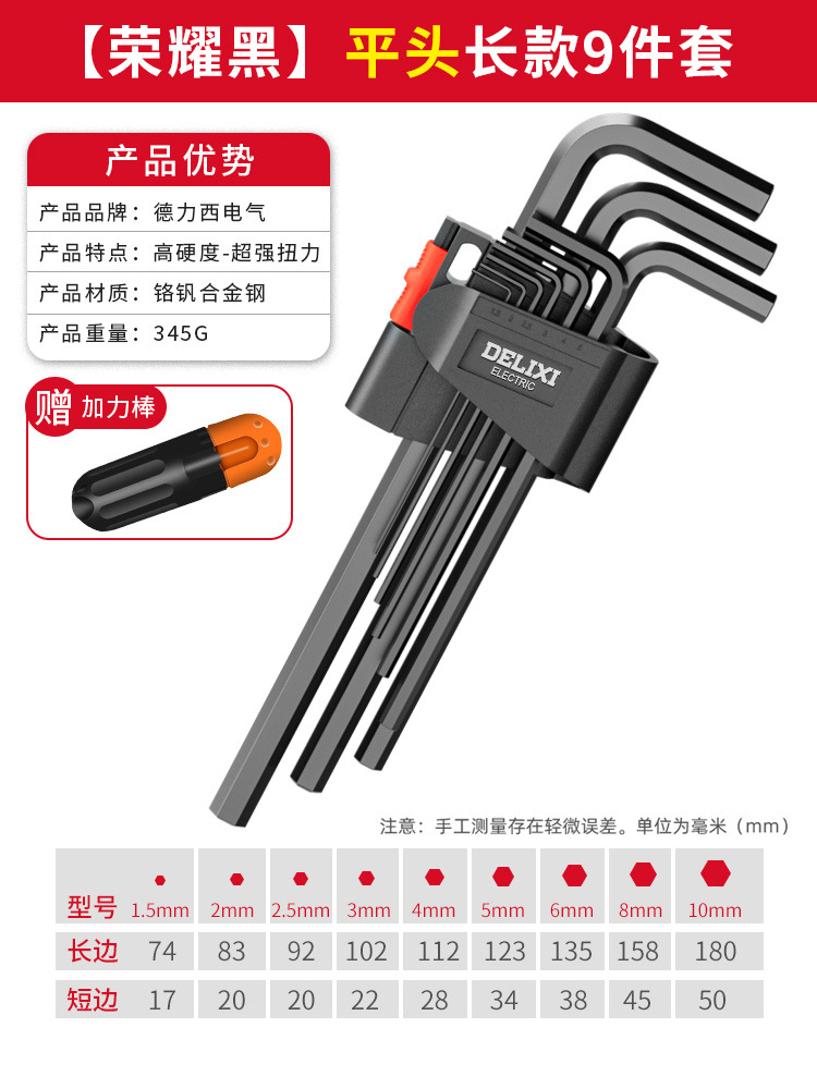 德力西内六角扳手9件套平头六棱内角加长球形L型S2合金内六角扳手