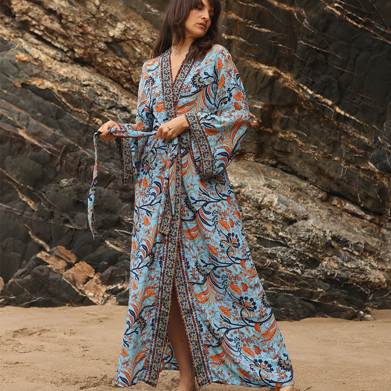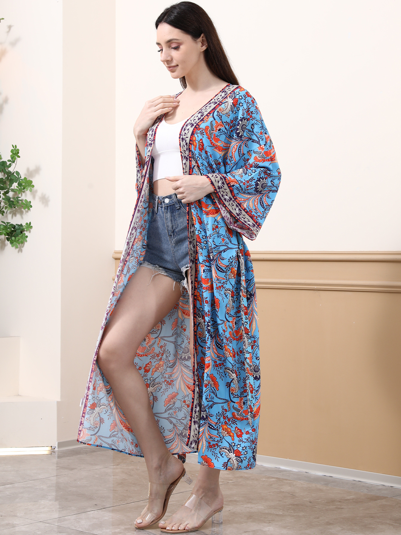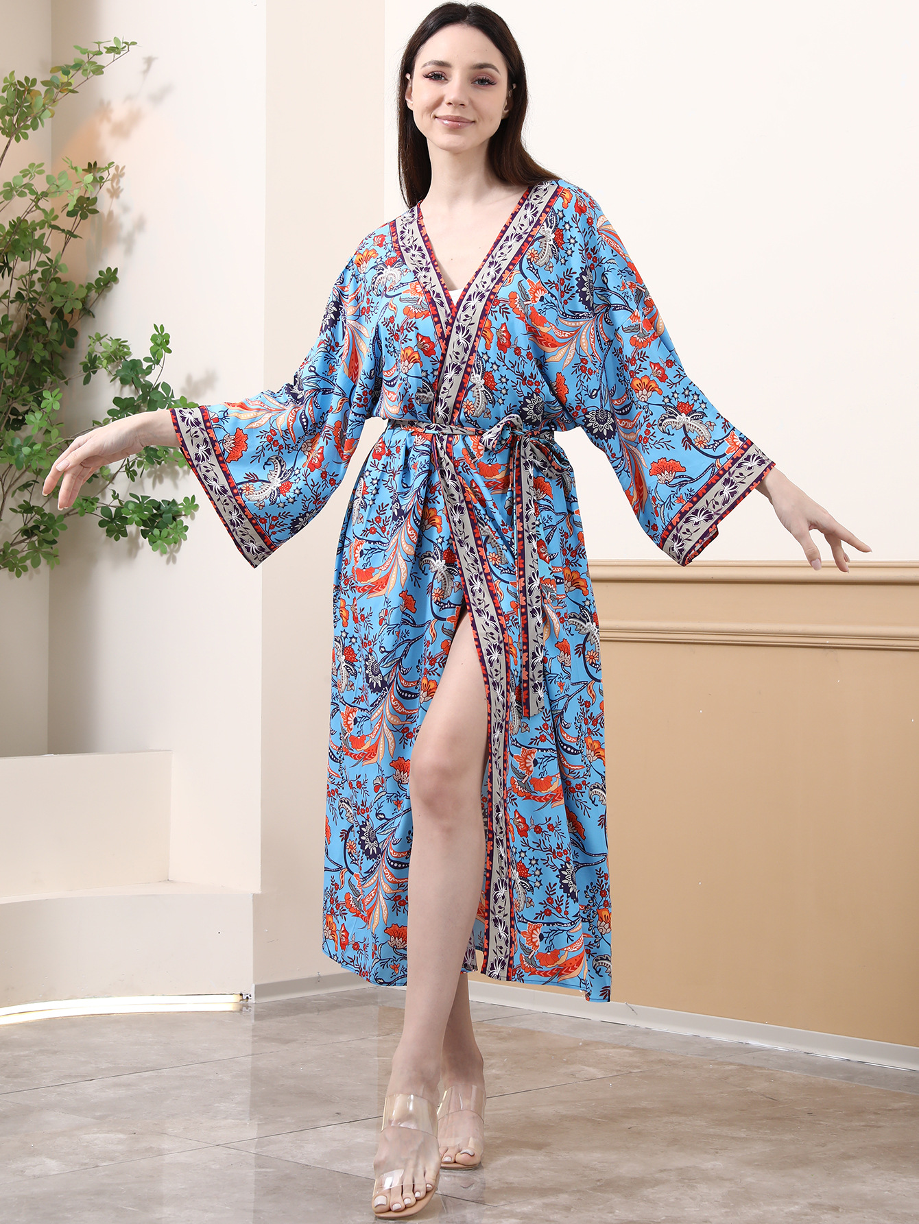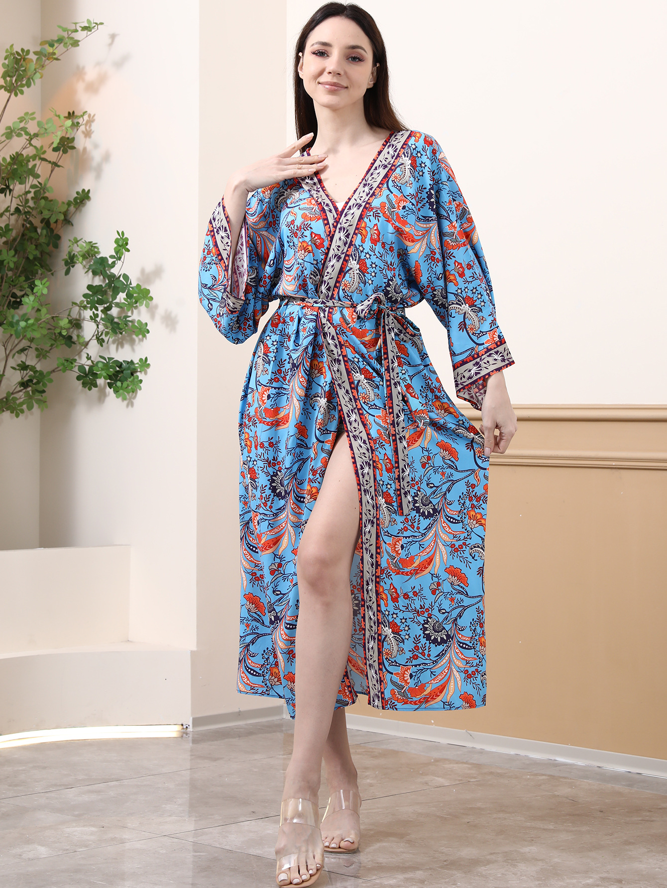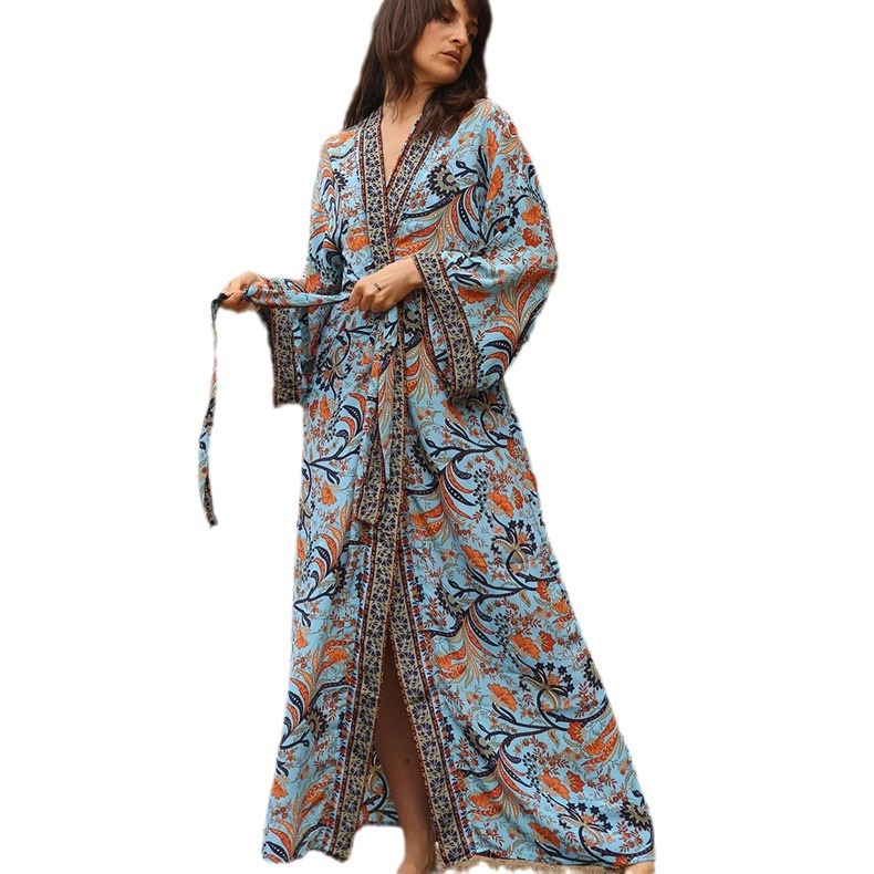 欧美度假KIMONO沙滩罩衫人棉印花防晒开衫比基尼外罩衫跨境亚马逊