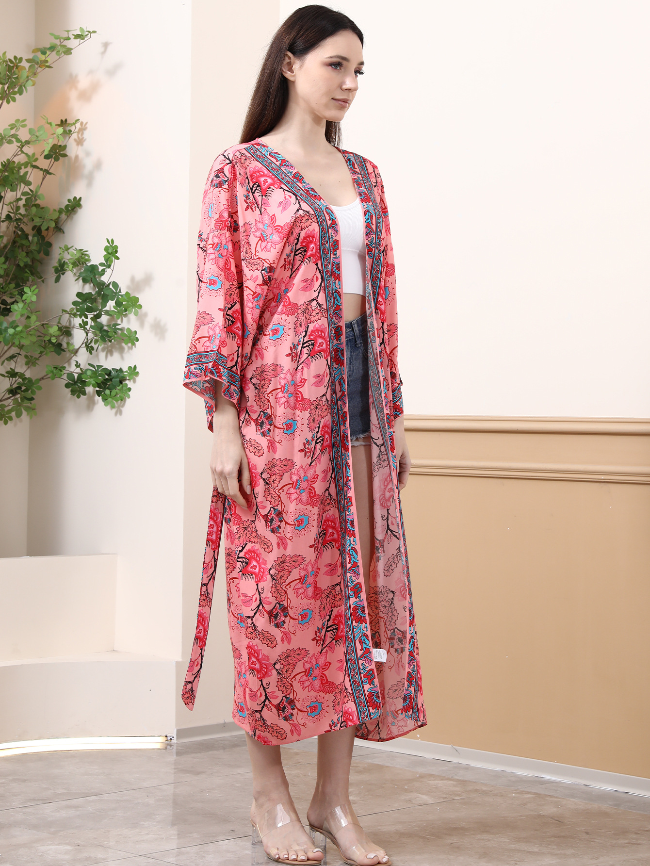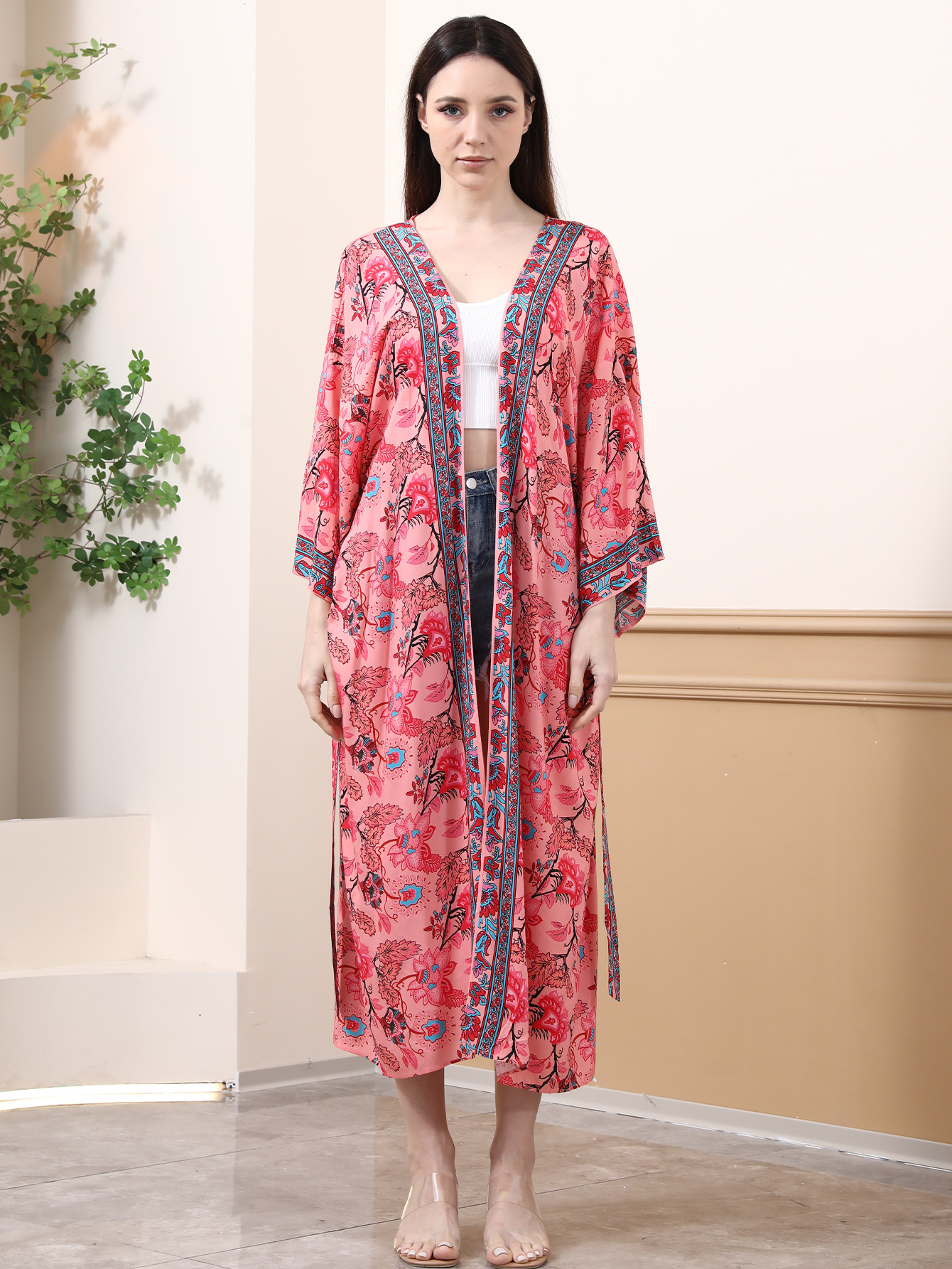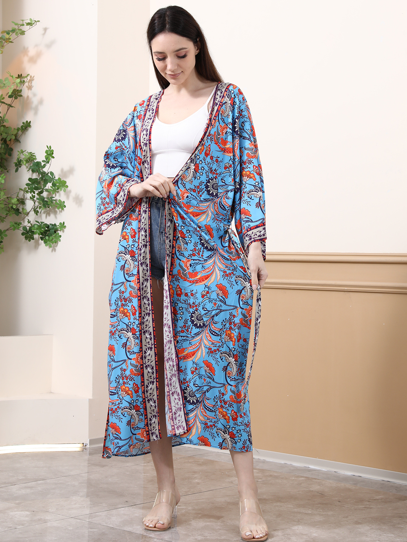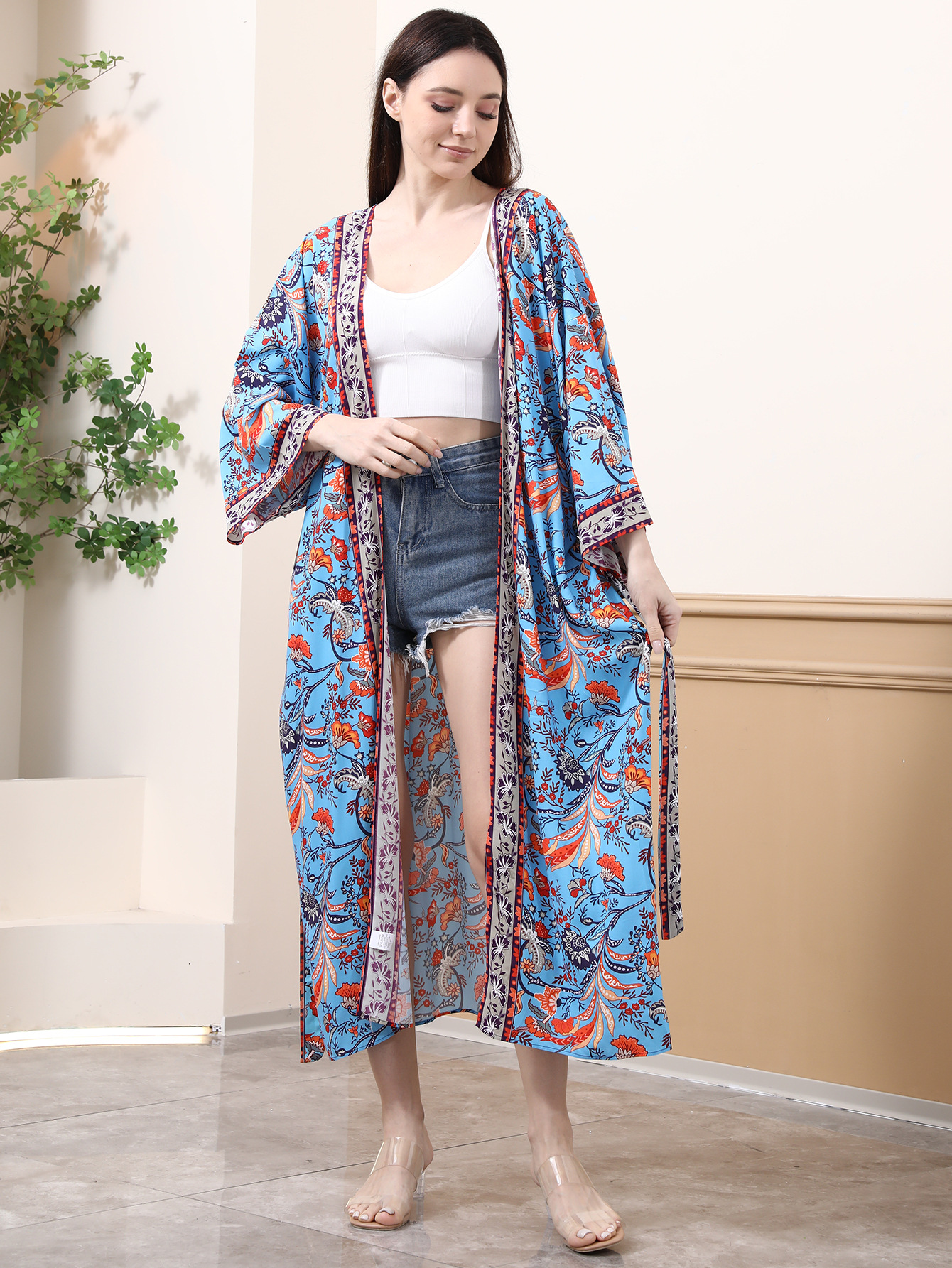 欧美度假KIMONO沙滩罩衫人棉印花防晒开衫比基尼外罩衫跨境亚马逊