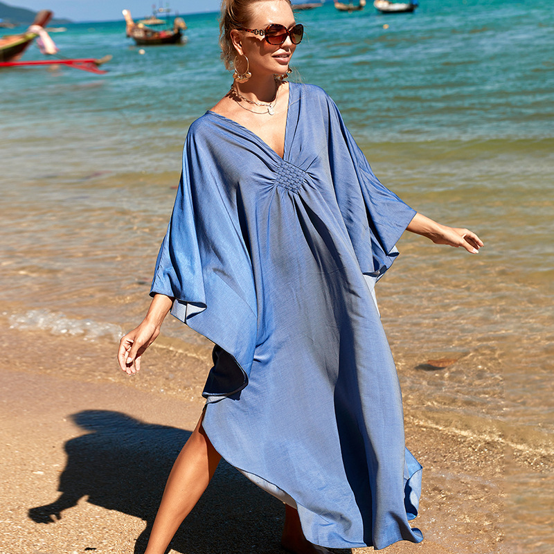 新款欧美纯色中间编织长袍沙滩长裙宽松比基尼罩衫泳衣防晒外搭女