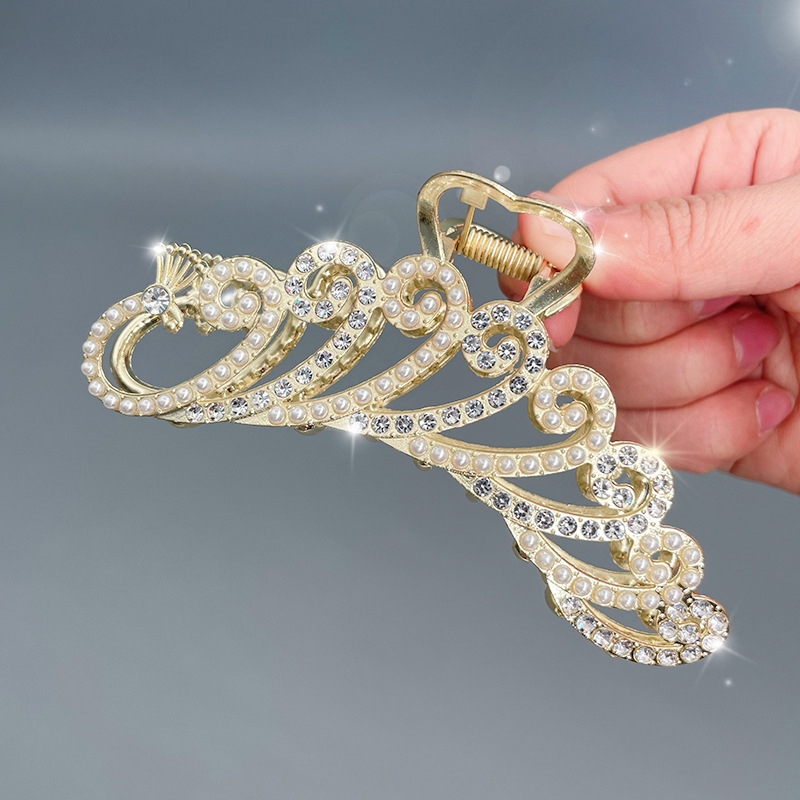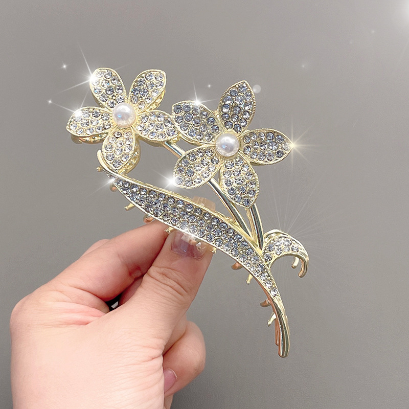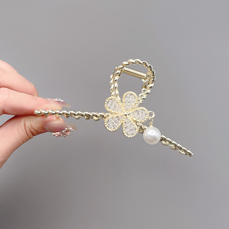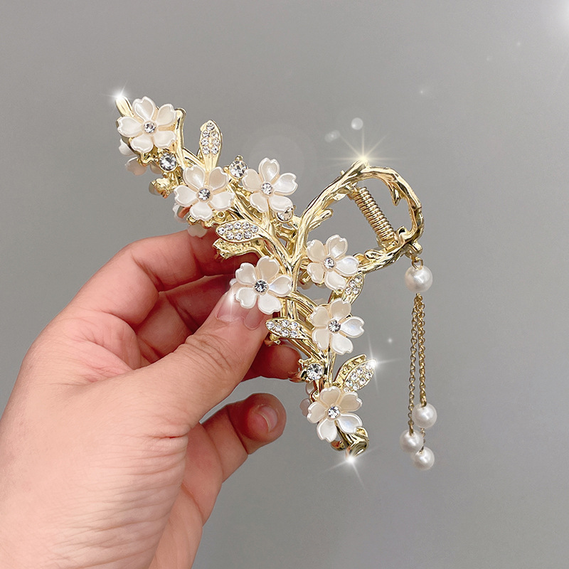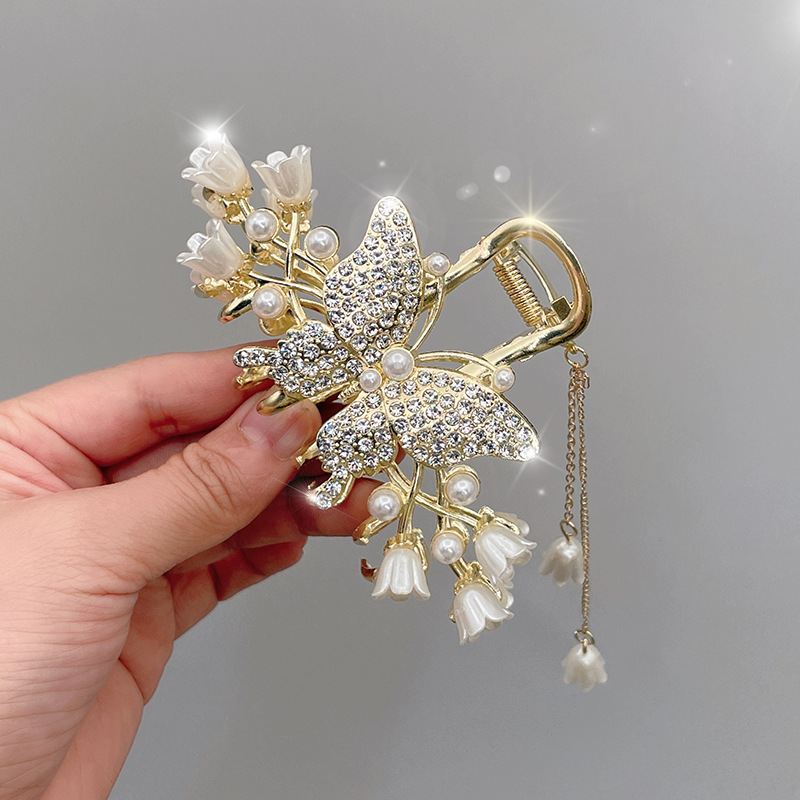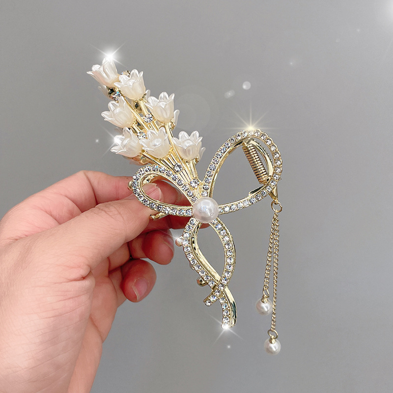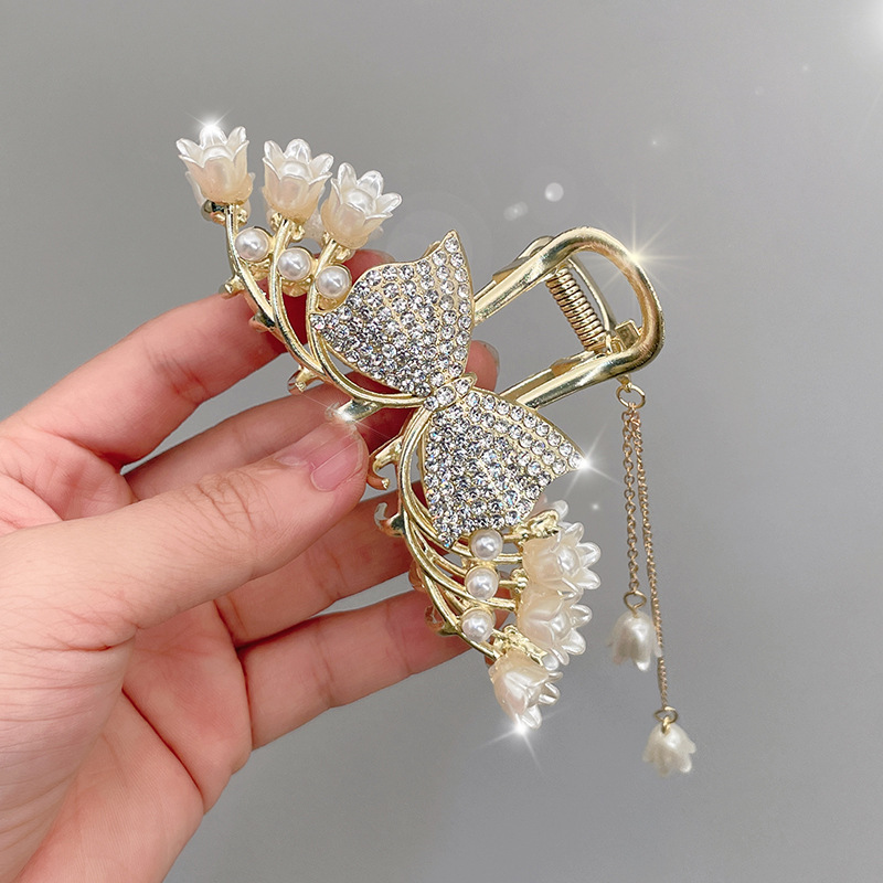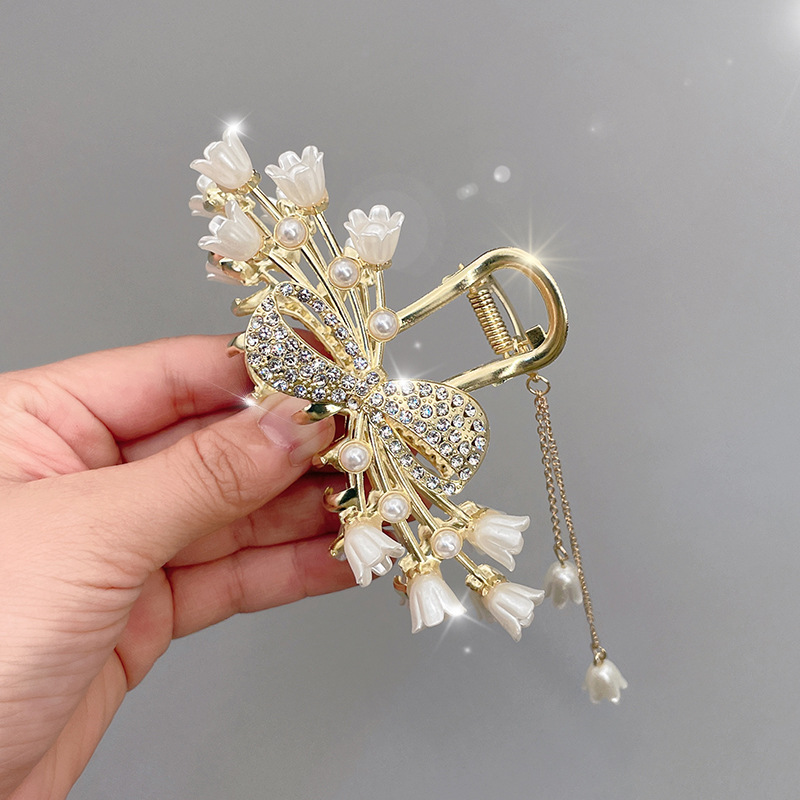 珍珠水钻铃兰花金属大号抓夹珍珠流苏盘发麦穗发夹气质盘发鲨鱼夹