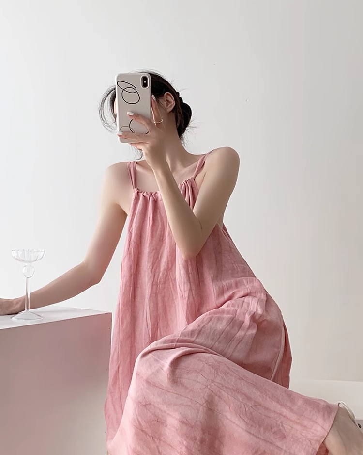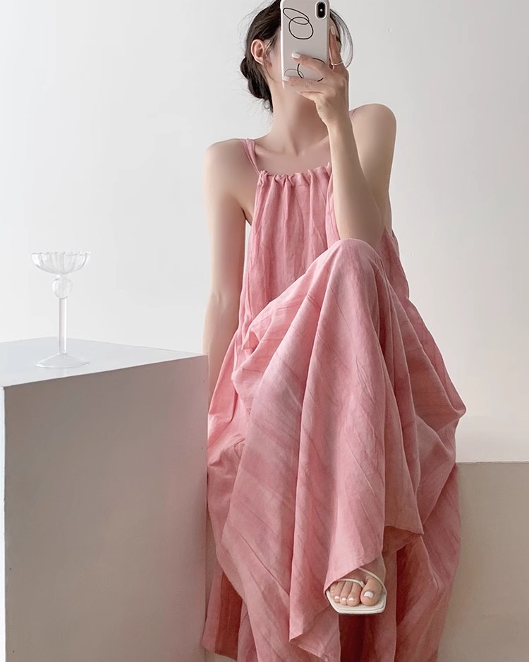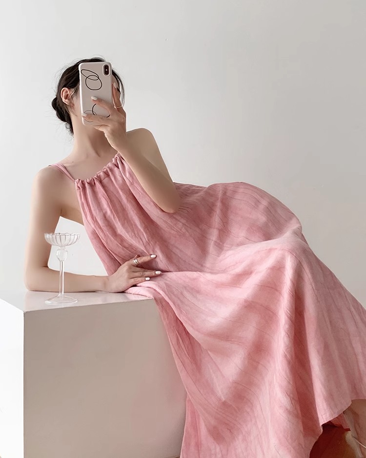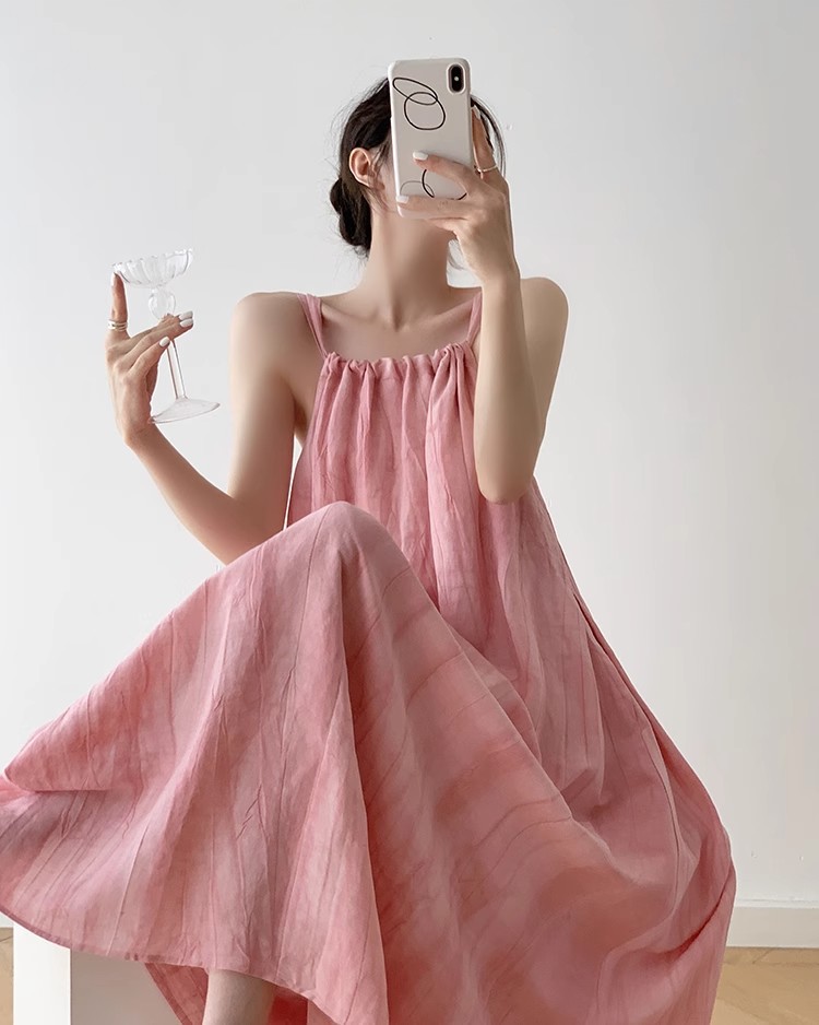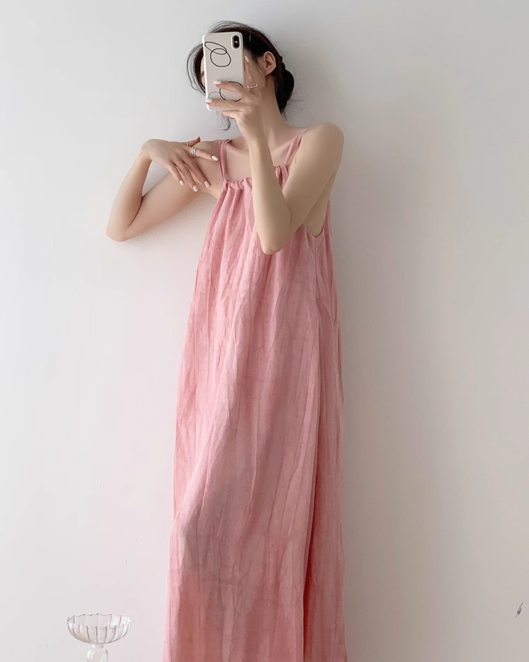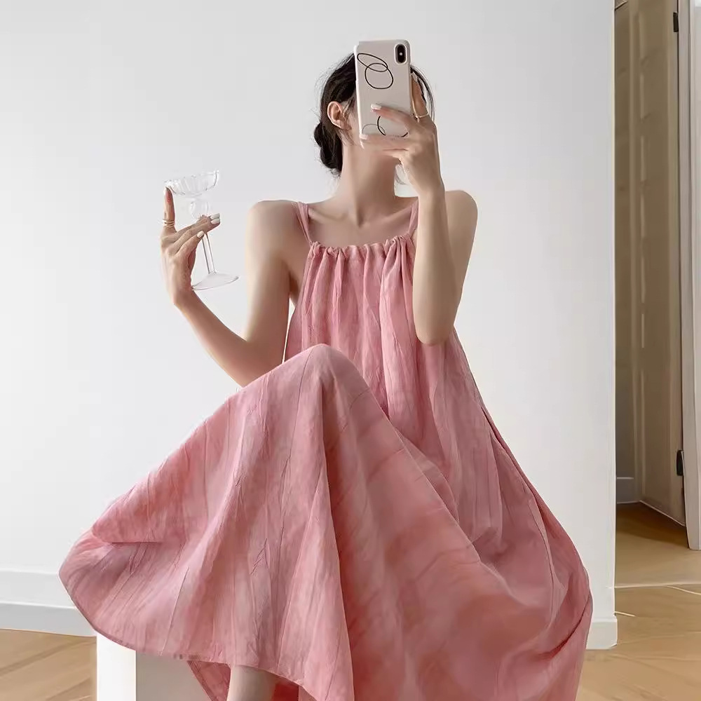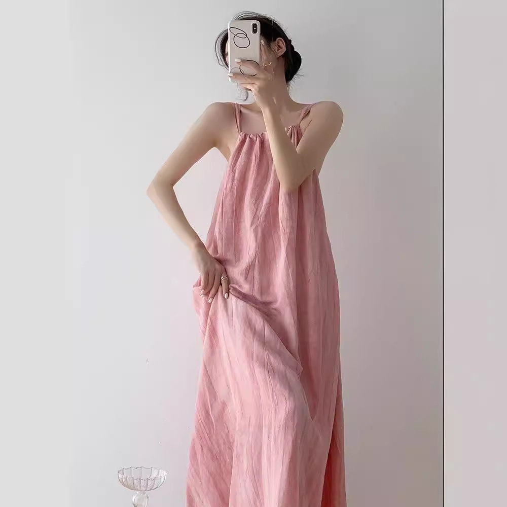 粉色晕染连衣裙女夏显瘦气质大摆裙无袖沙滩长裙度假吊带裙