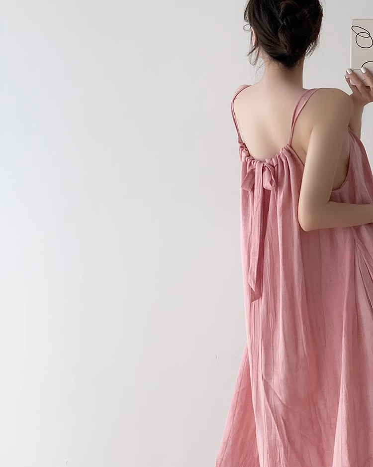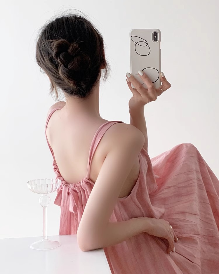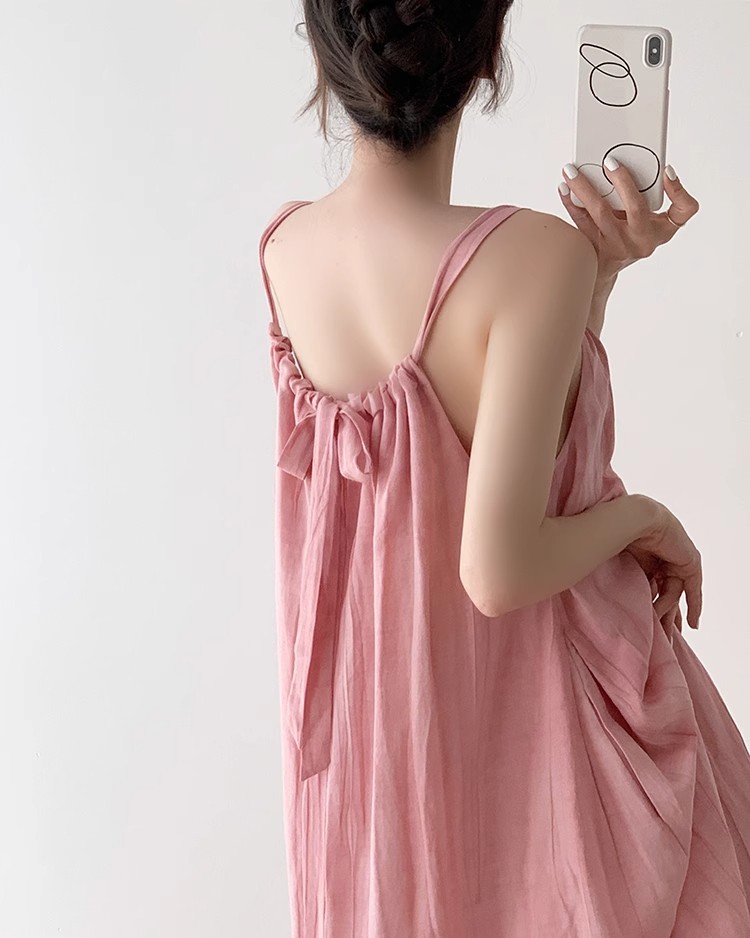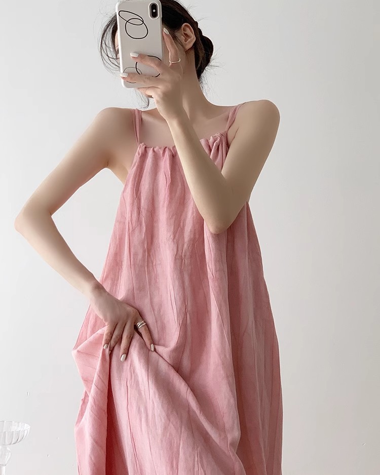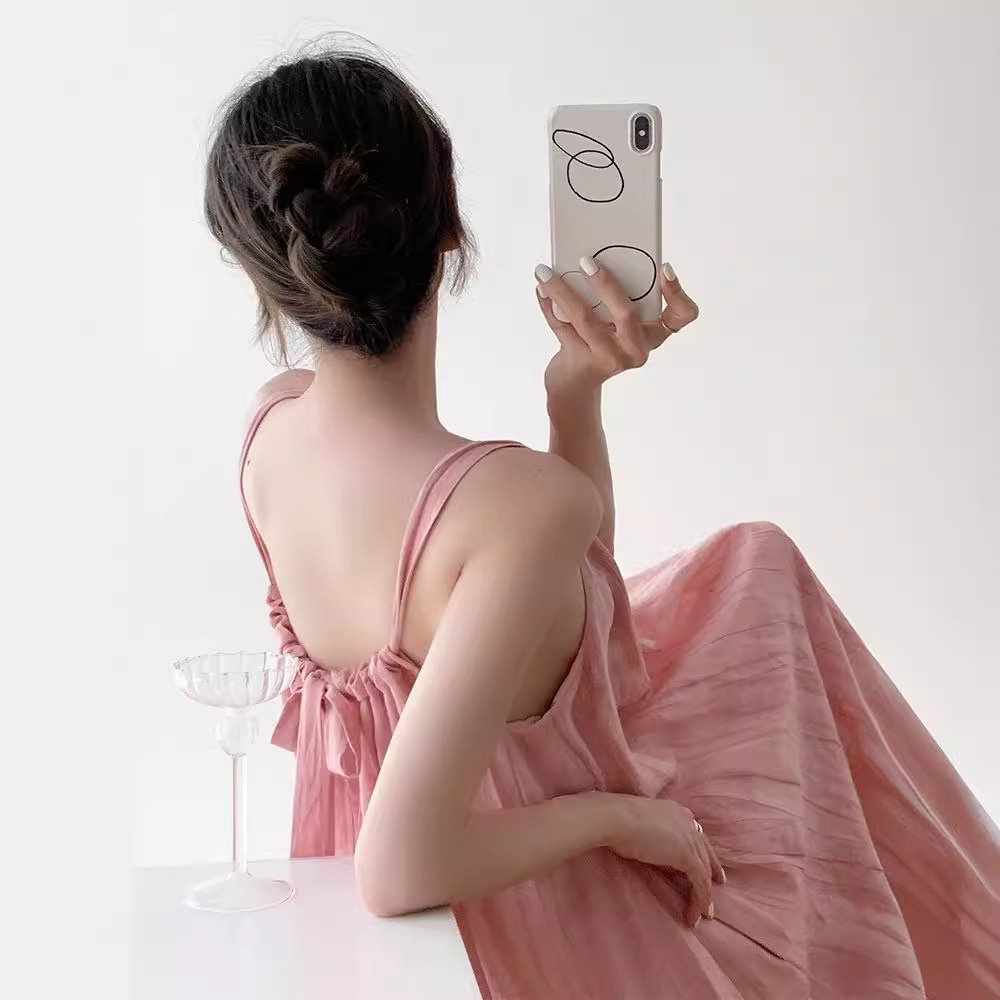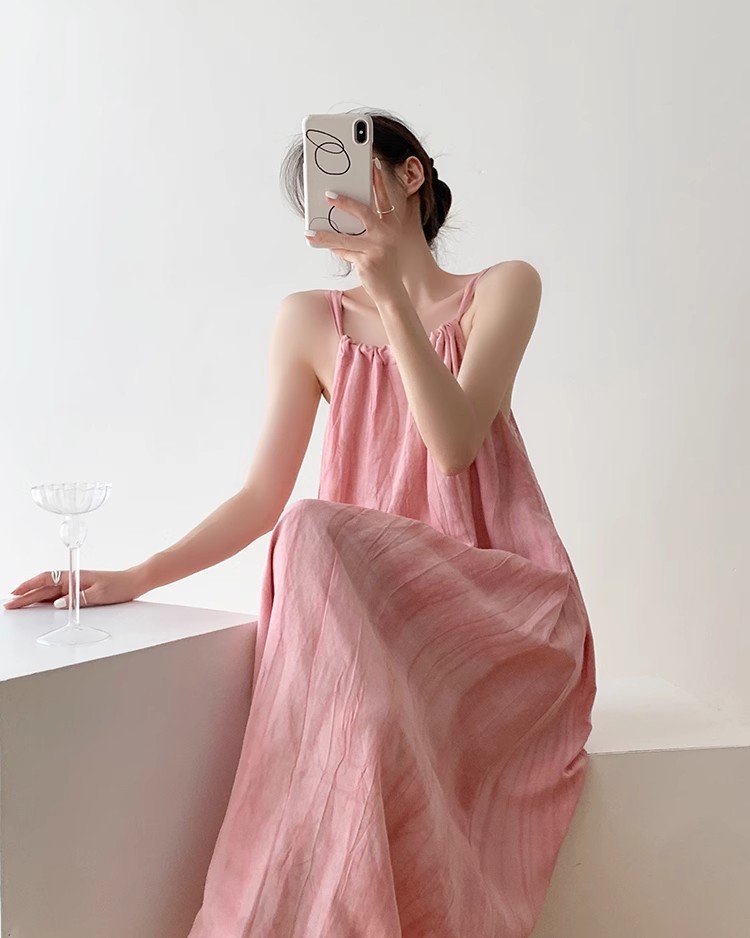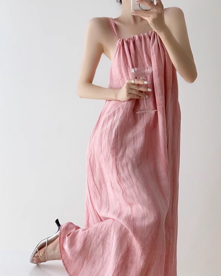 粉色晕染连衣裙女夏显瘦气质大摆裙无袖沙滩长裙度假吊带裙