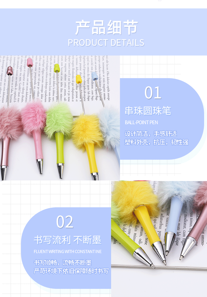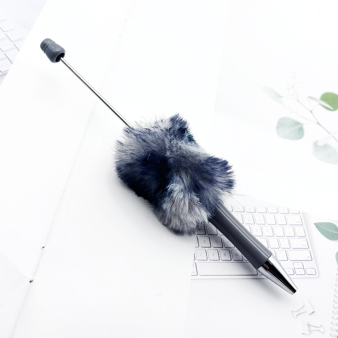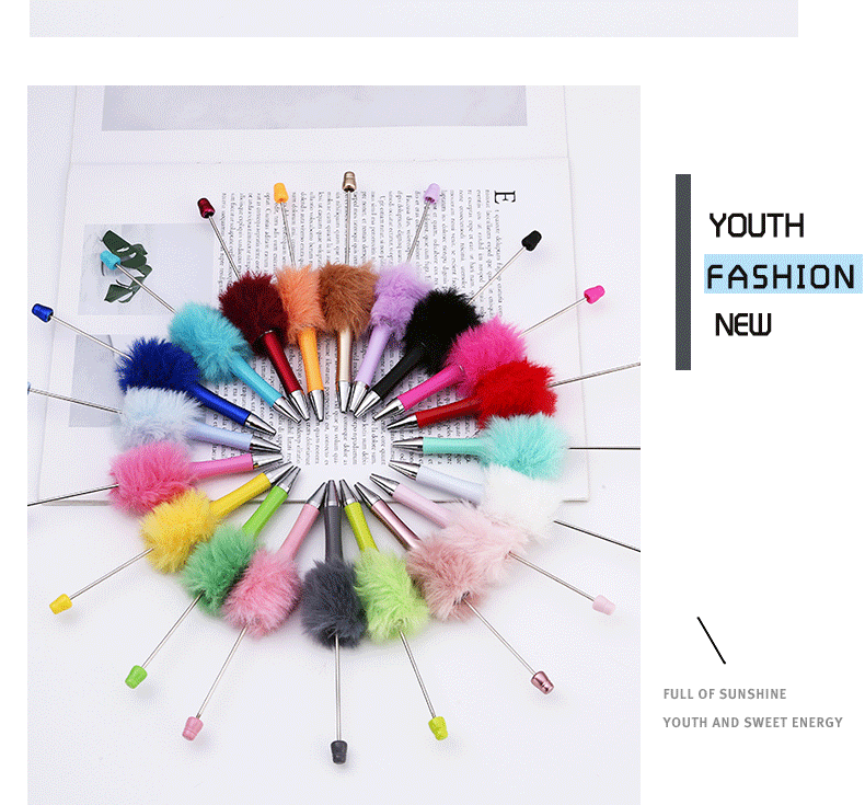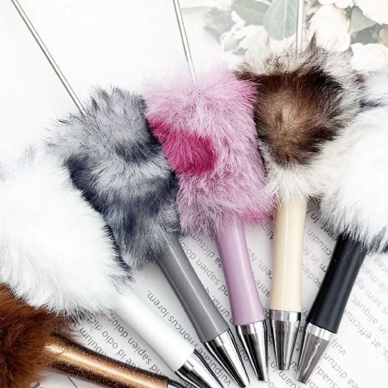 跨境创新款豹纹毛球串珠笔 diy手工毛球圆珠笔可爱学生礼品笔现货