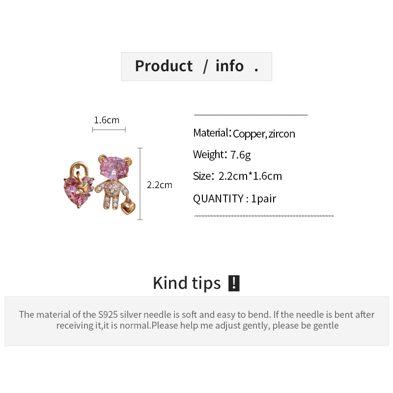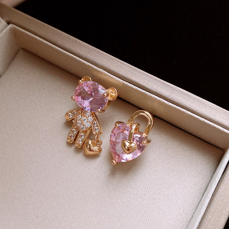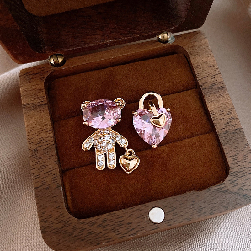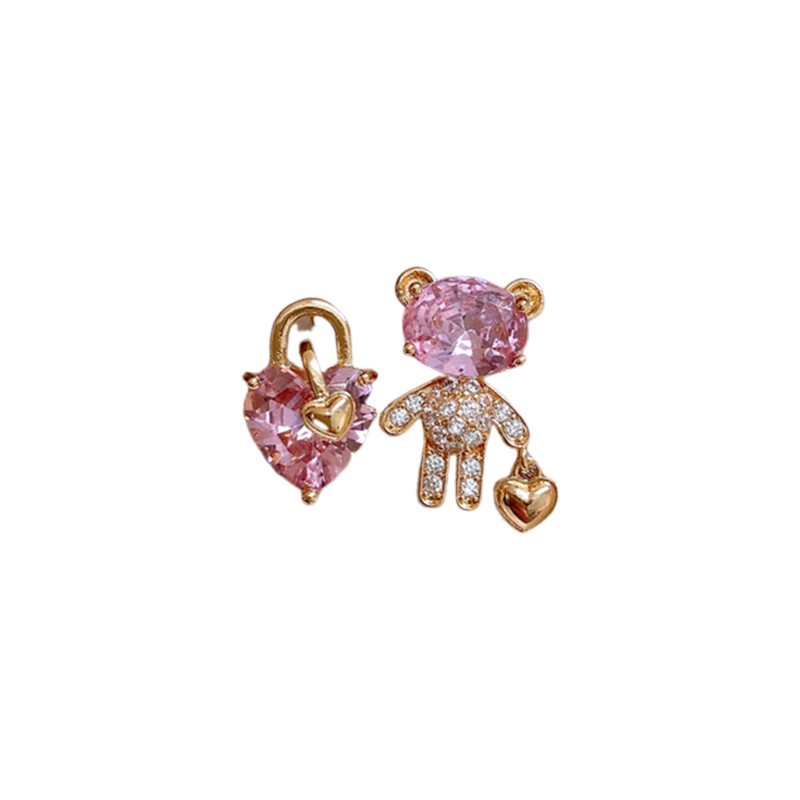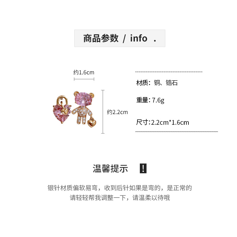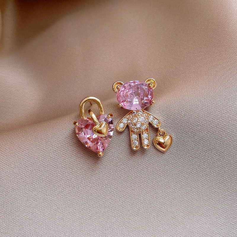 银针不对称锆石小熊爱心耳环时尚百搭可爱耳钉轻奢高级感耳饰批发