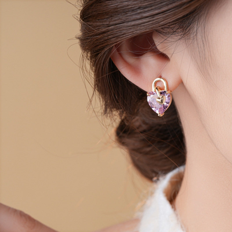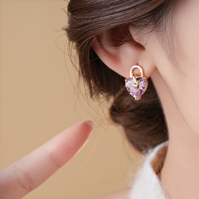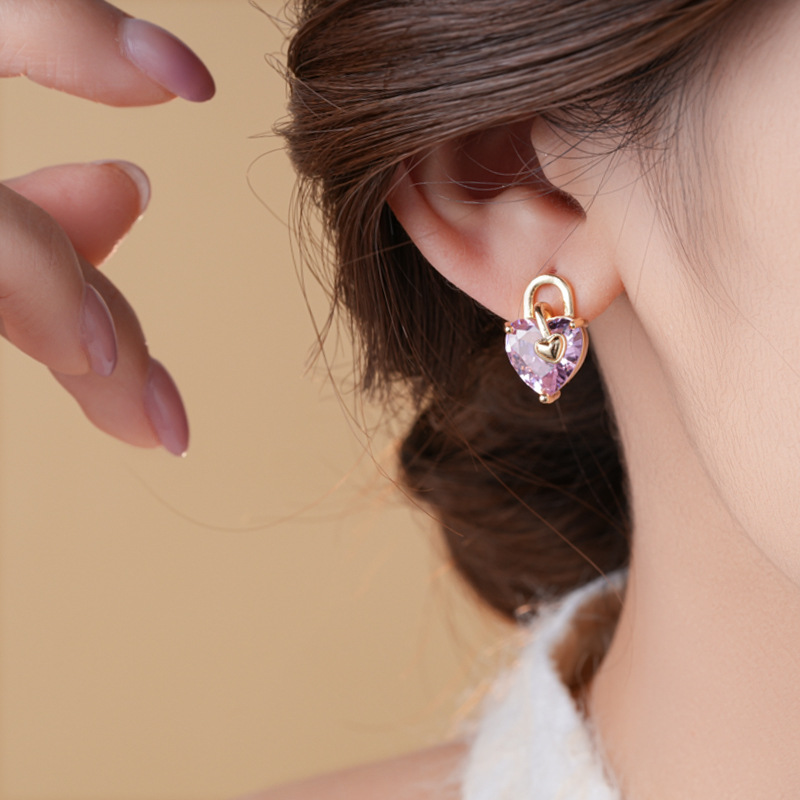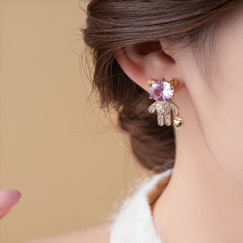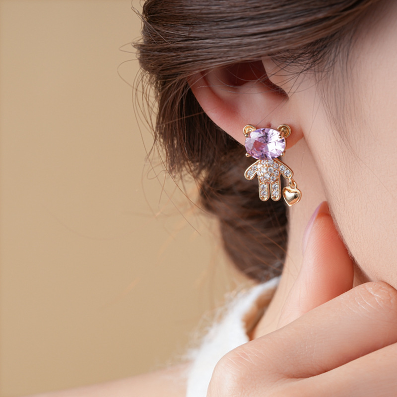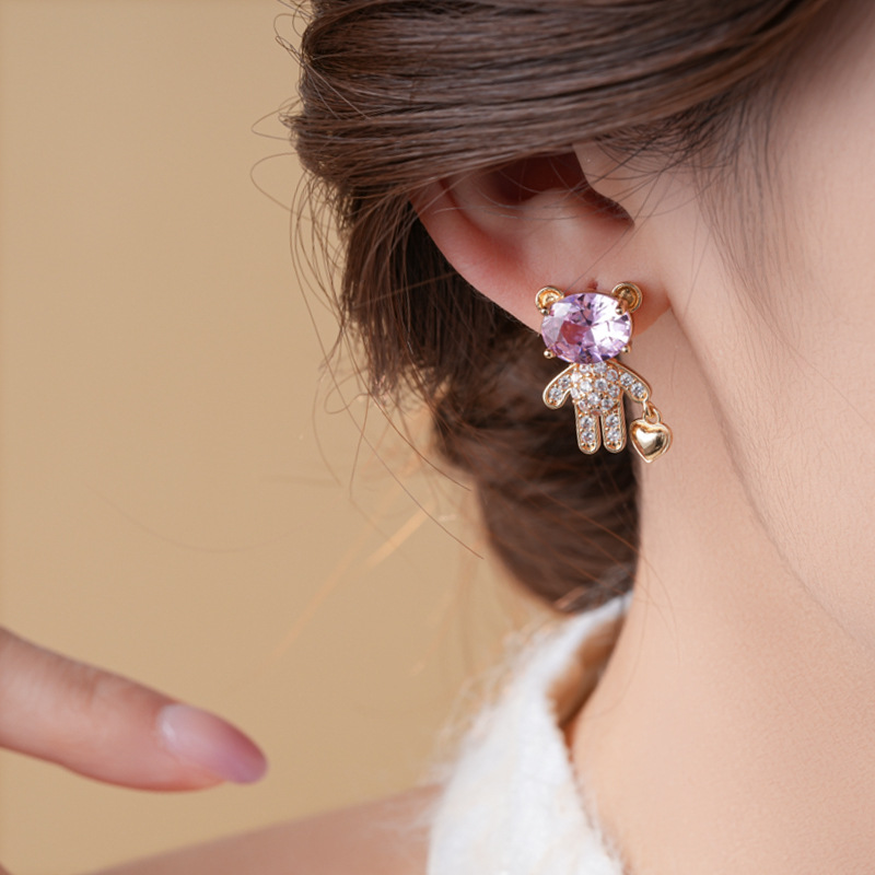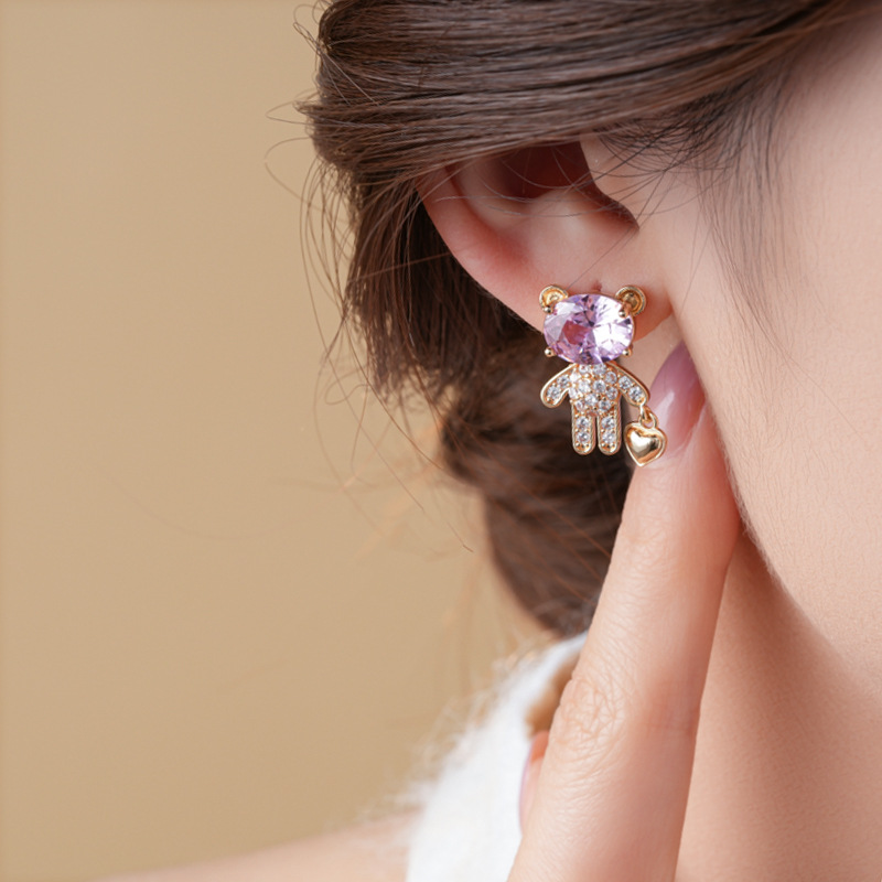 银针不对称锆石小熊爱心耳环时尚百搭可爱耳钉轻奢高级感耳饰批发