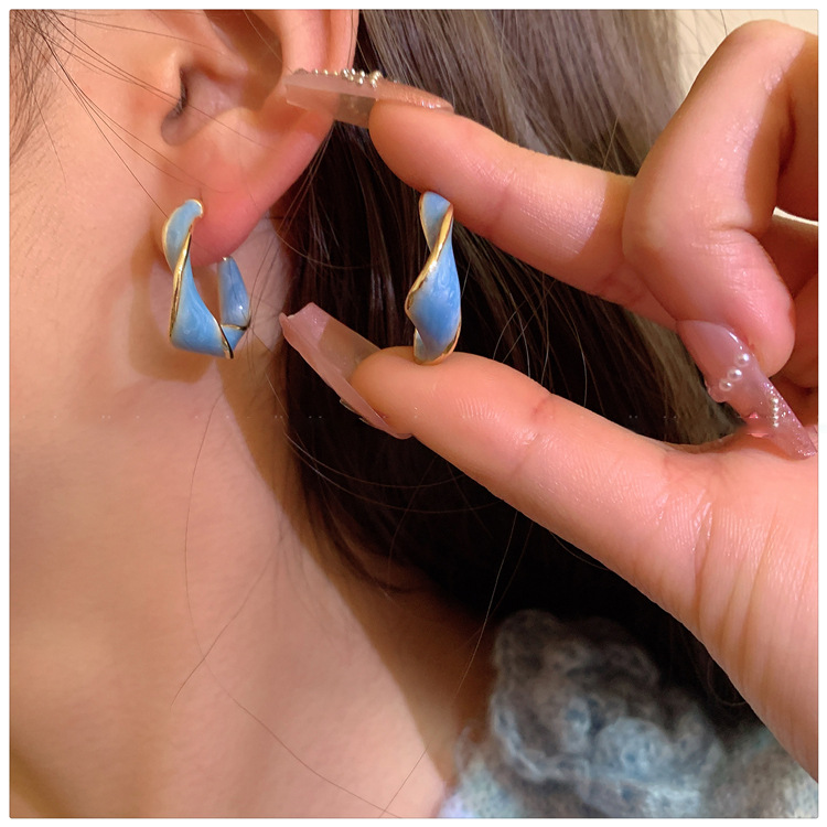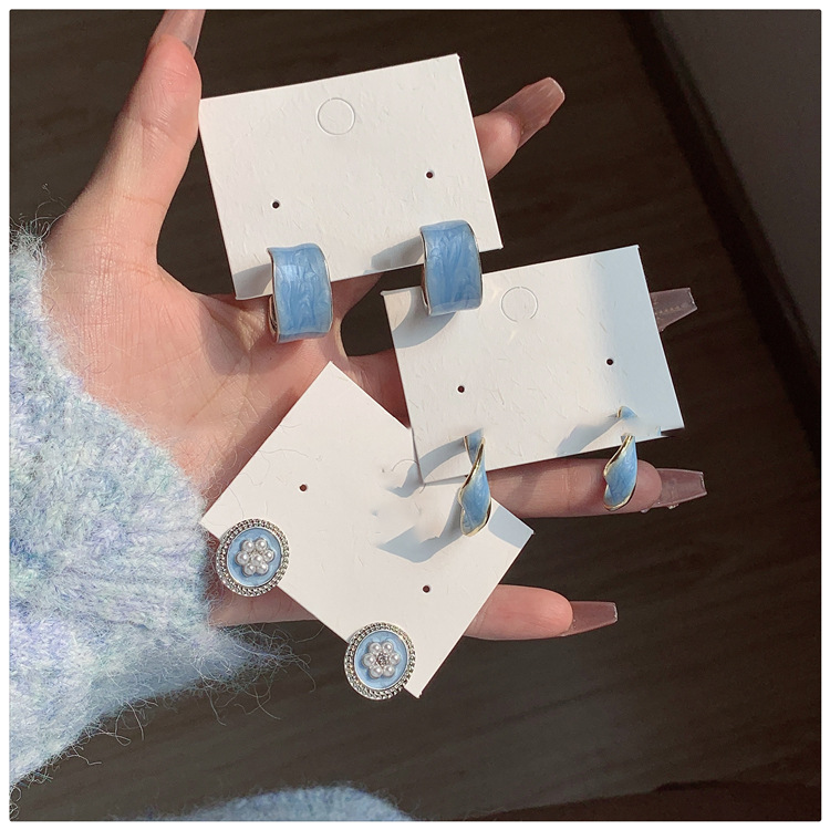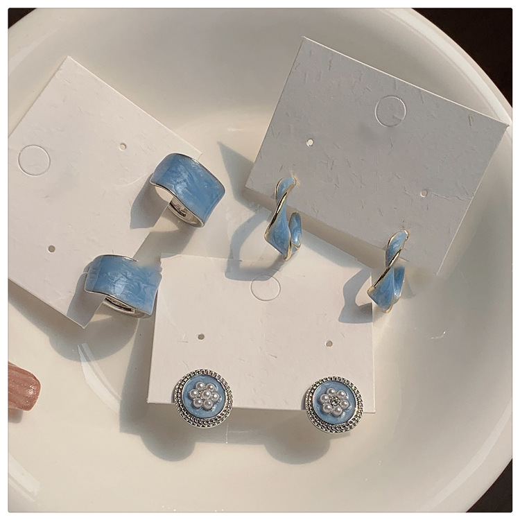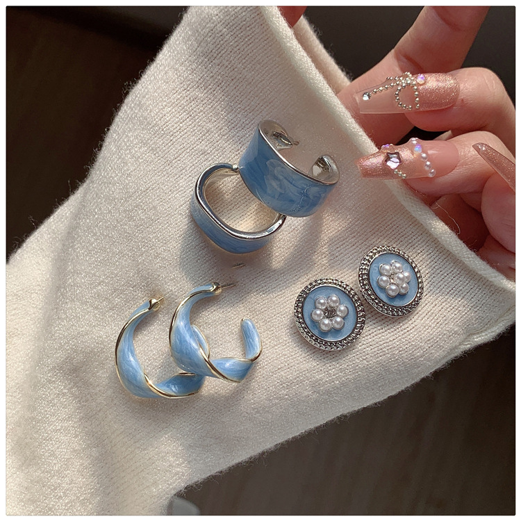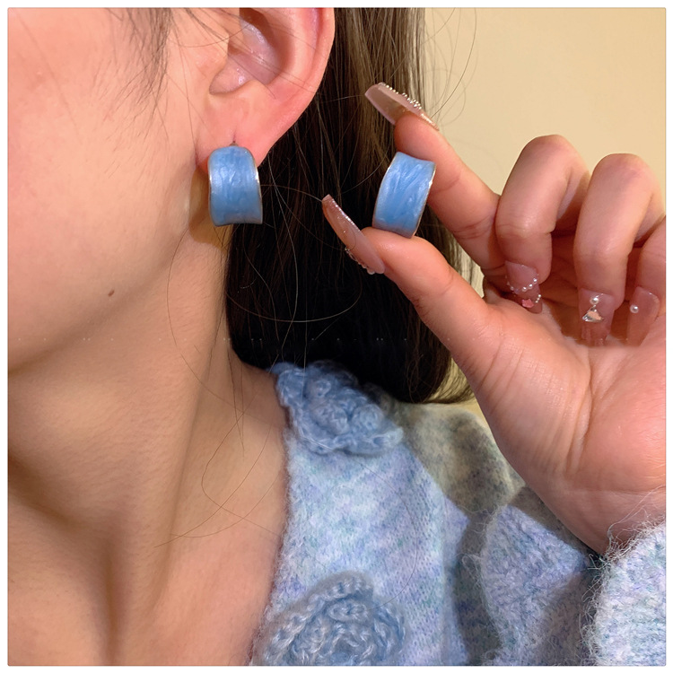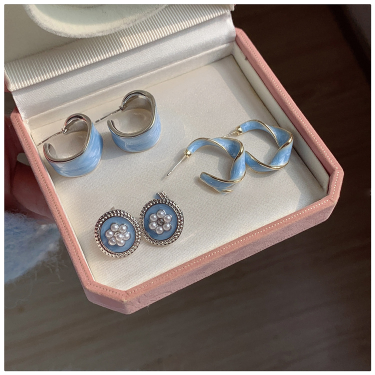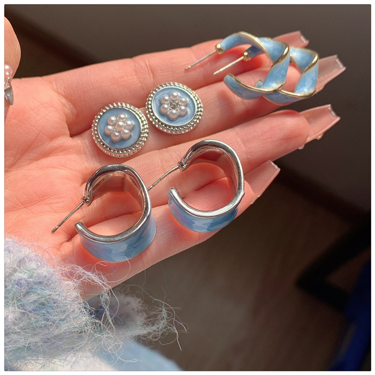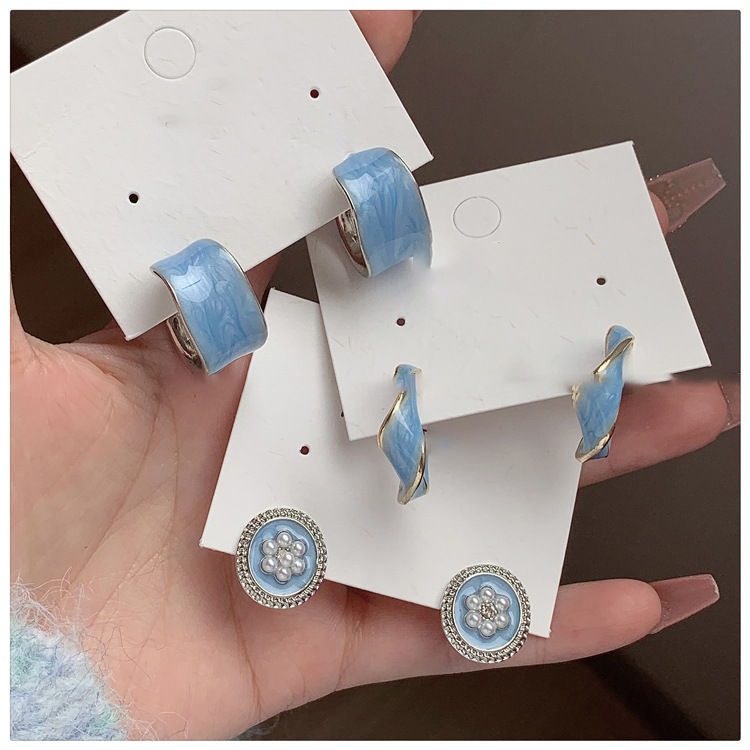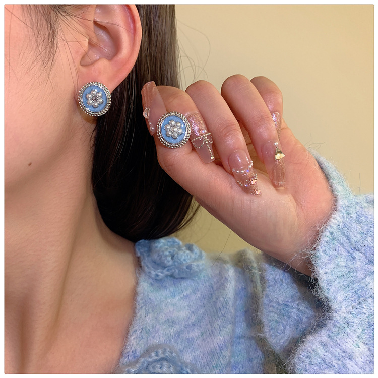 银针镶钻蓝色圆形C形珍珠耳环 时尚简约耳钉轻奢高级感百搭耳饰女