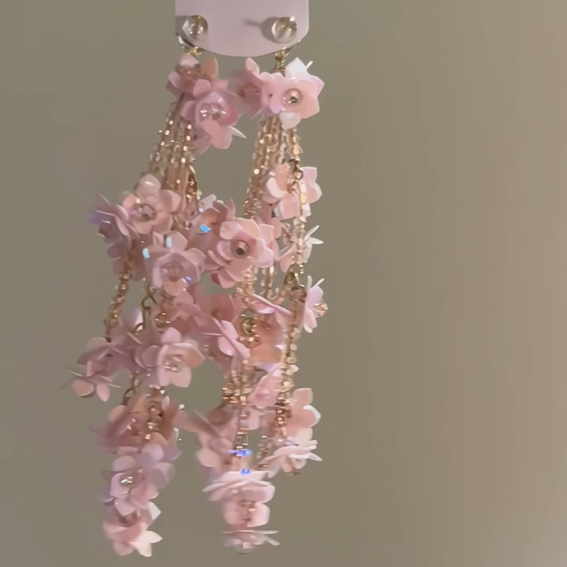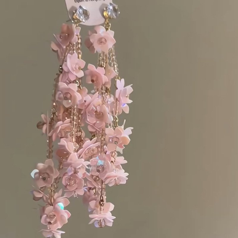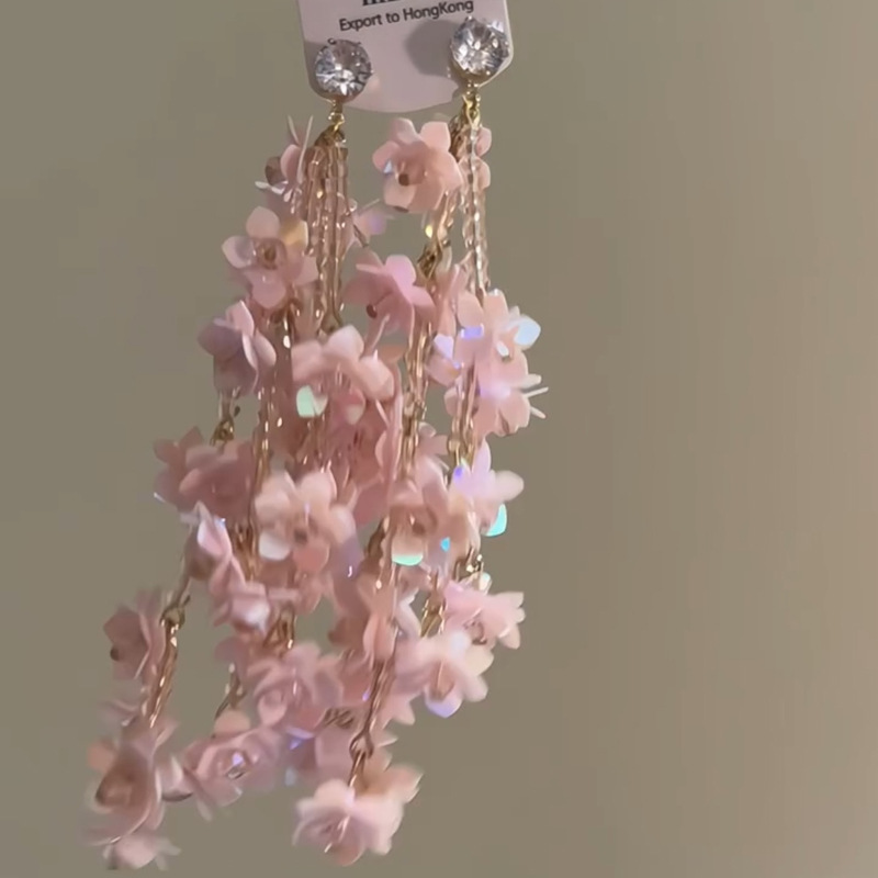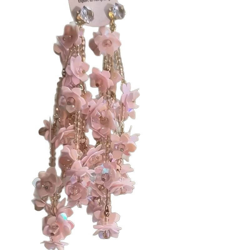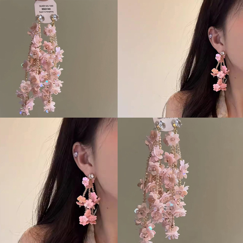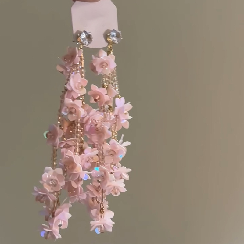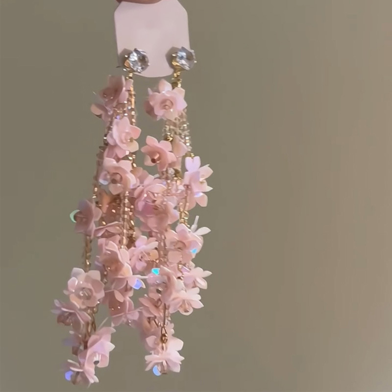 银针锆石玻璃亮片花朵流苏耳环时尚长款耳钉轻奢高级感气质耳饰女