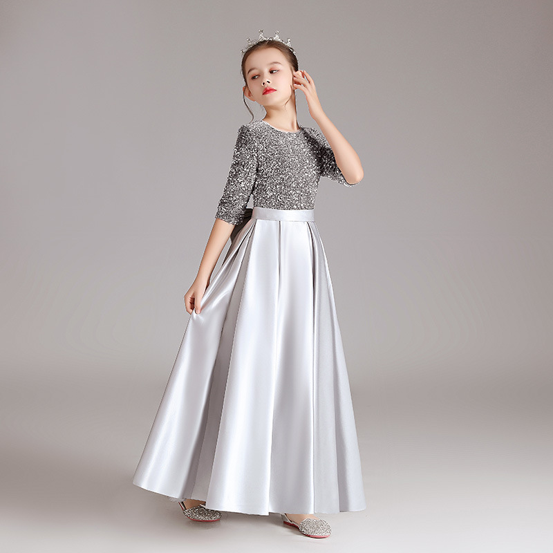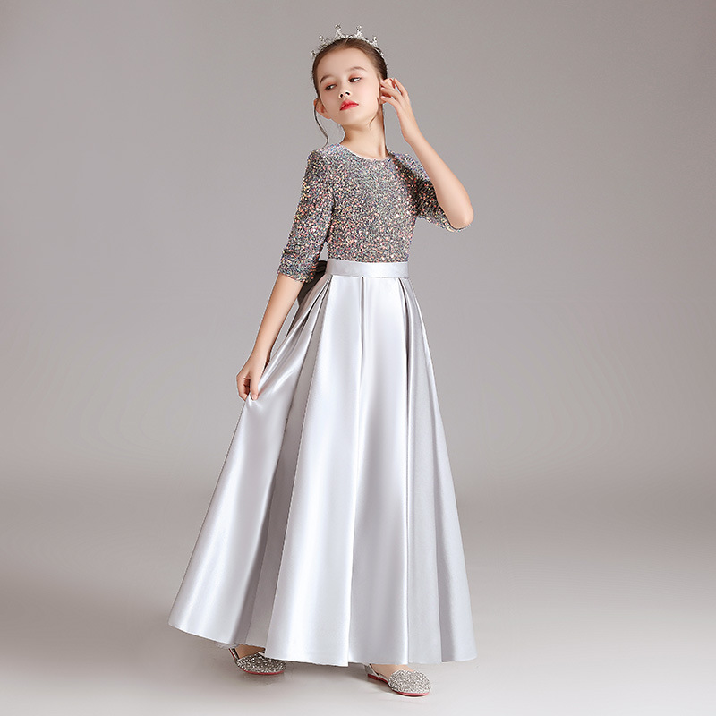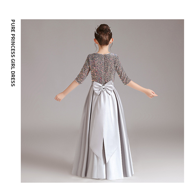 女童钢琴幻彩亮片灰色礼服演出服公主裙小学生合唱表演服中袖气质