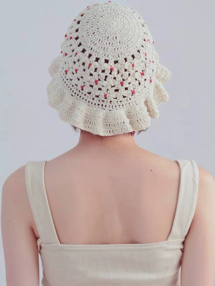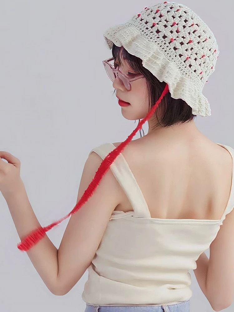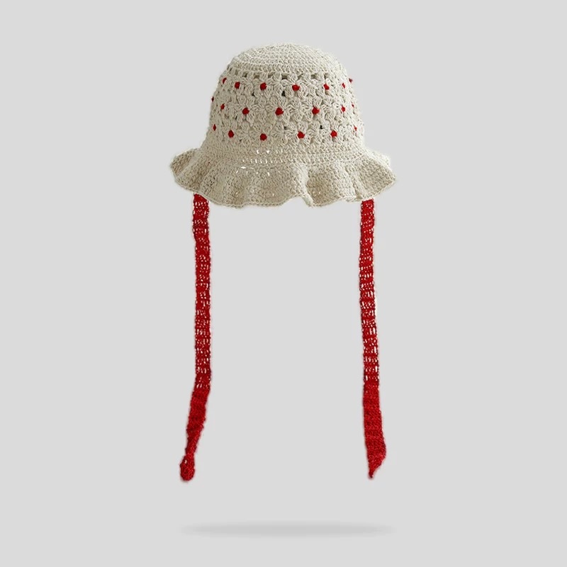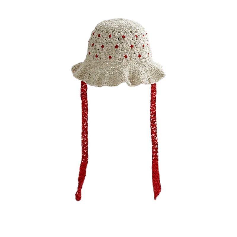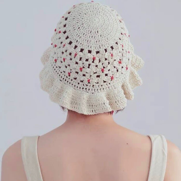 时髦复古手工钩织撞色渔夫帽女凹造型盆帽春夏季新款镂空绑带帽子