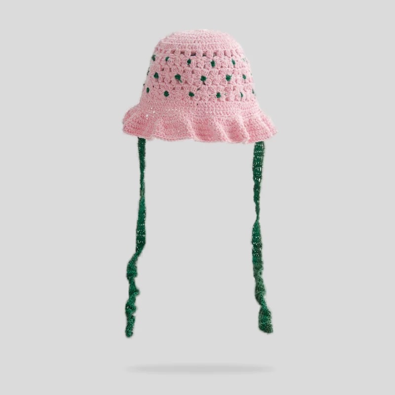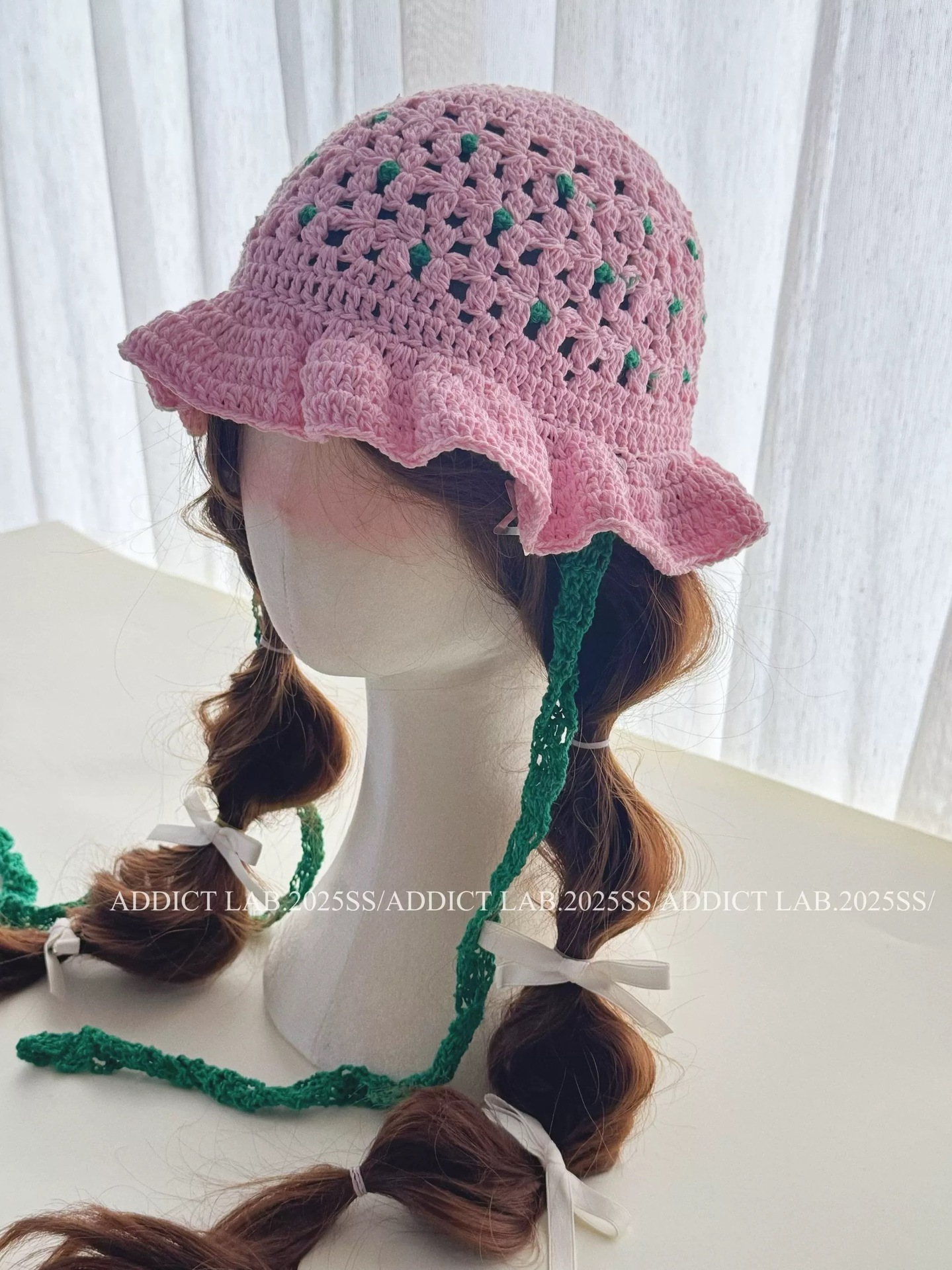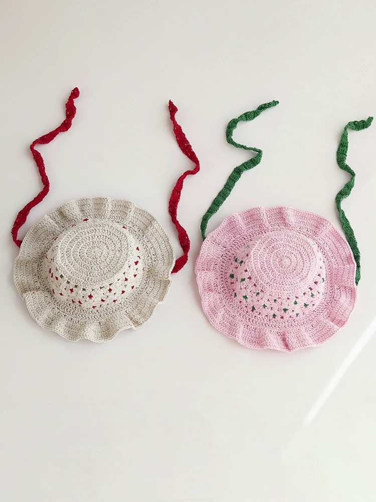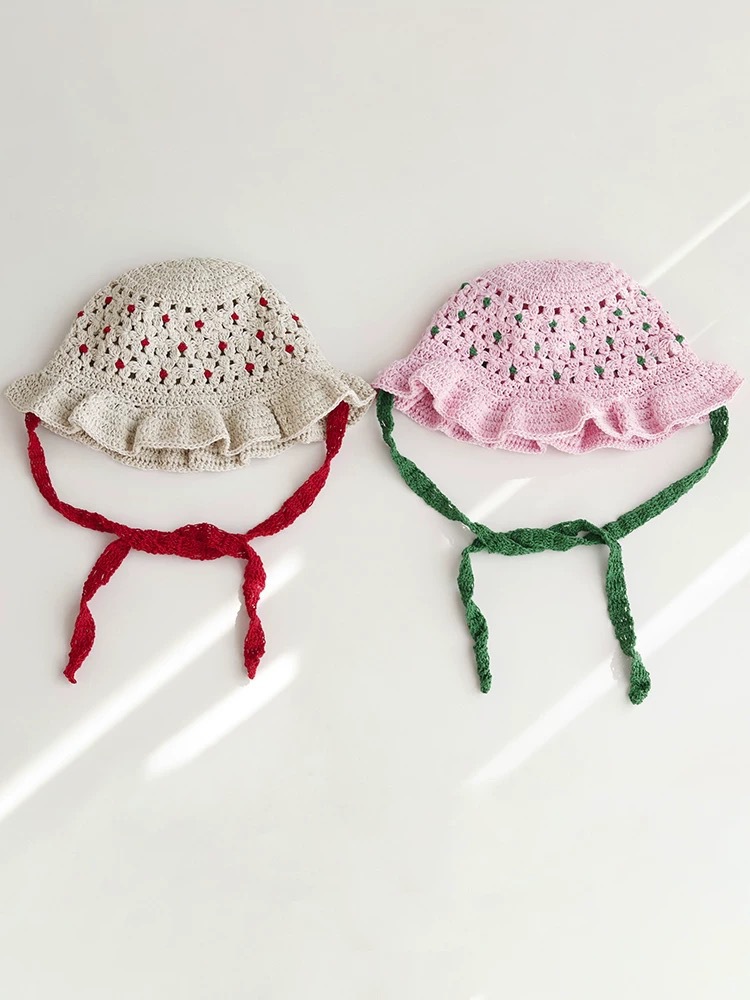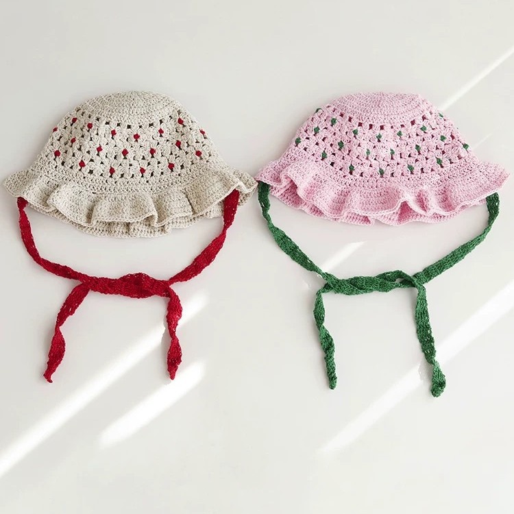 时髦复古手工钩织撞色渔夫帽女凹造型盆帽春夏季新款镂空绑带帽子