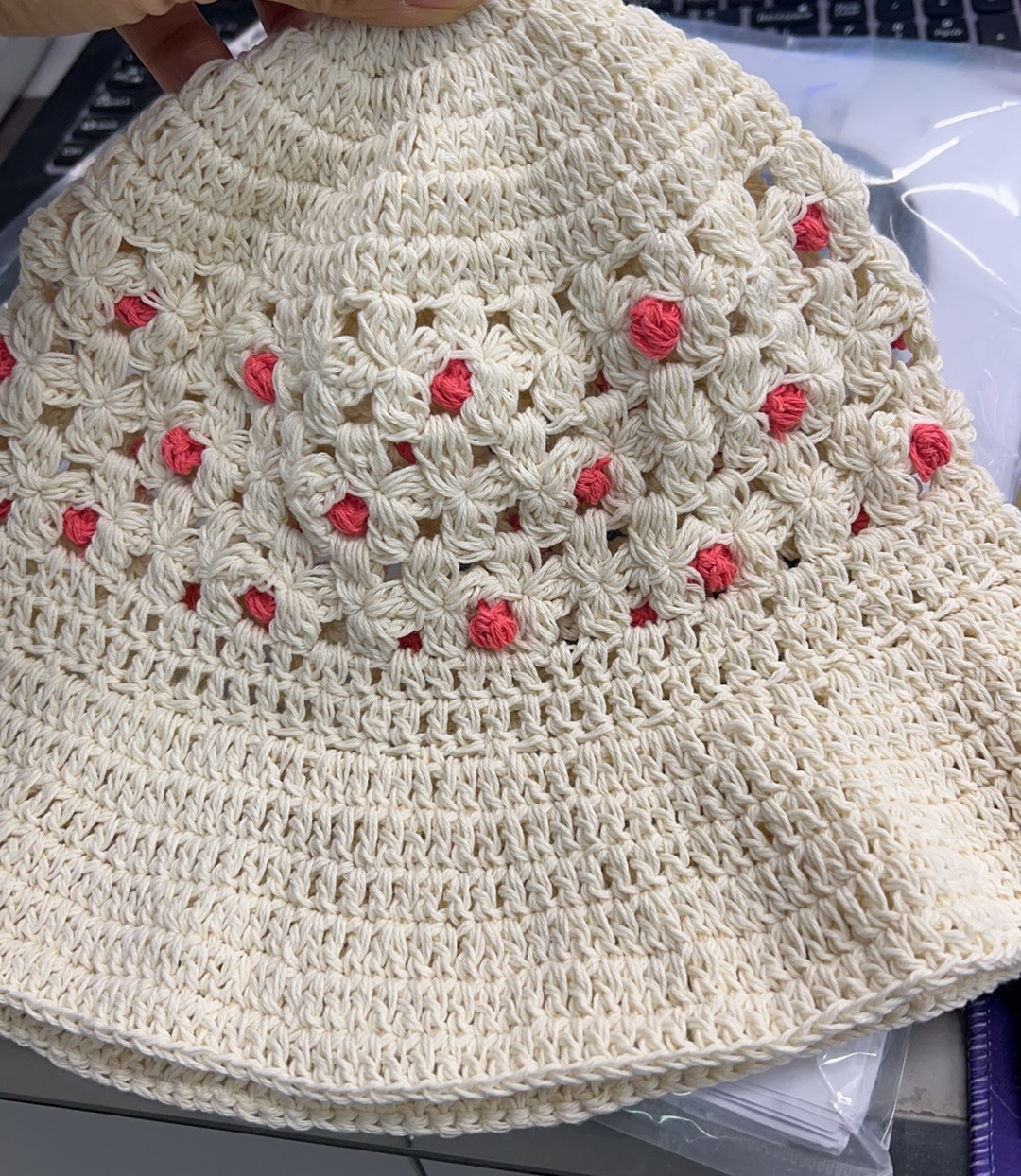 纯手工编织,有线头有大小偏差不属于质量问题,介意慎拍!帽口有一圈定型铝丝可以造型,不需要的可以自己抽掉。