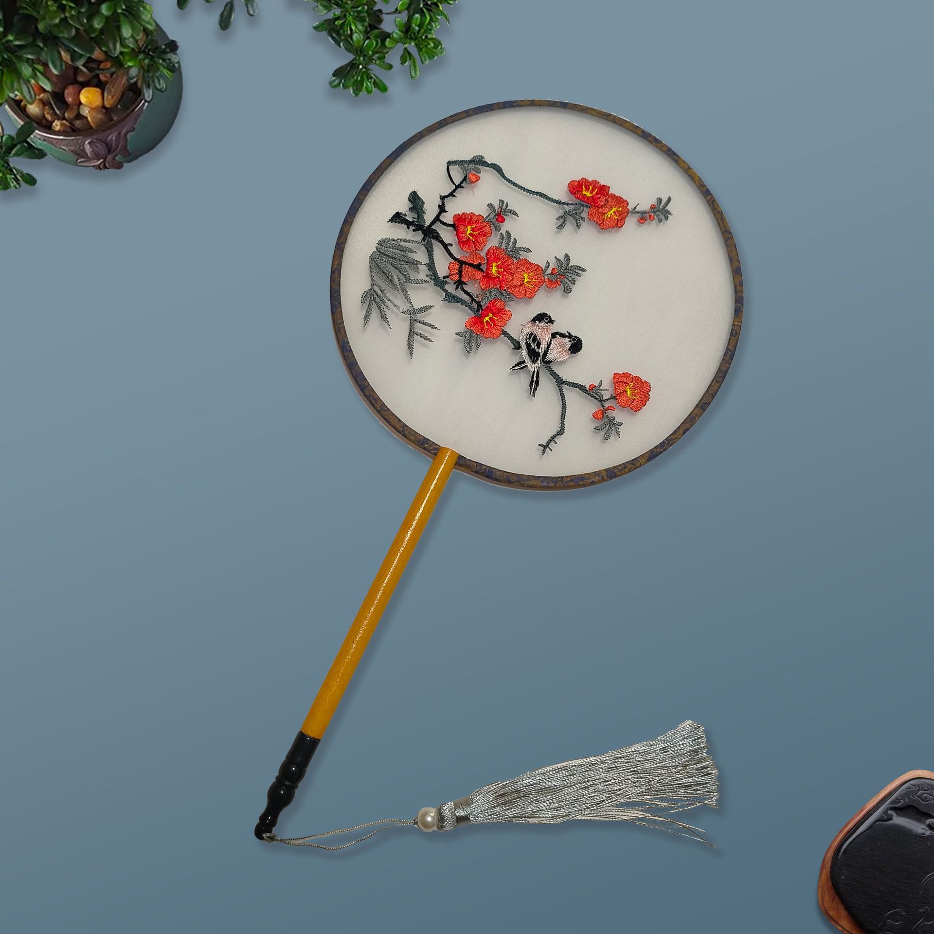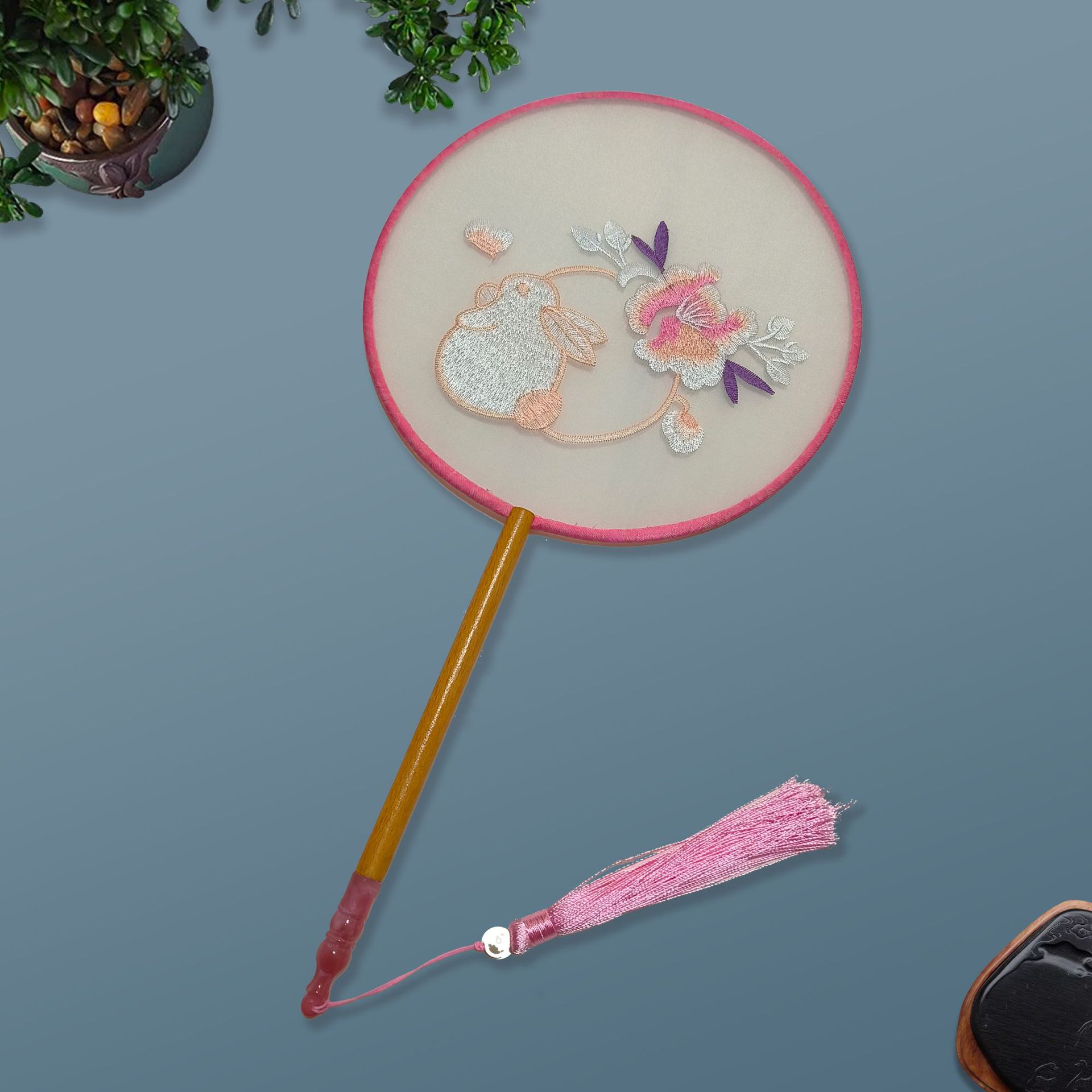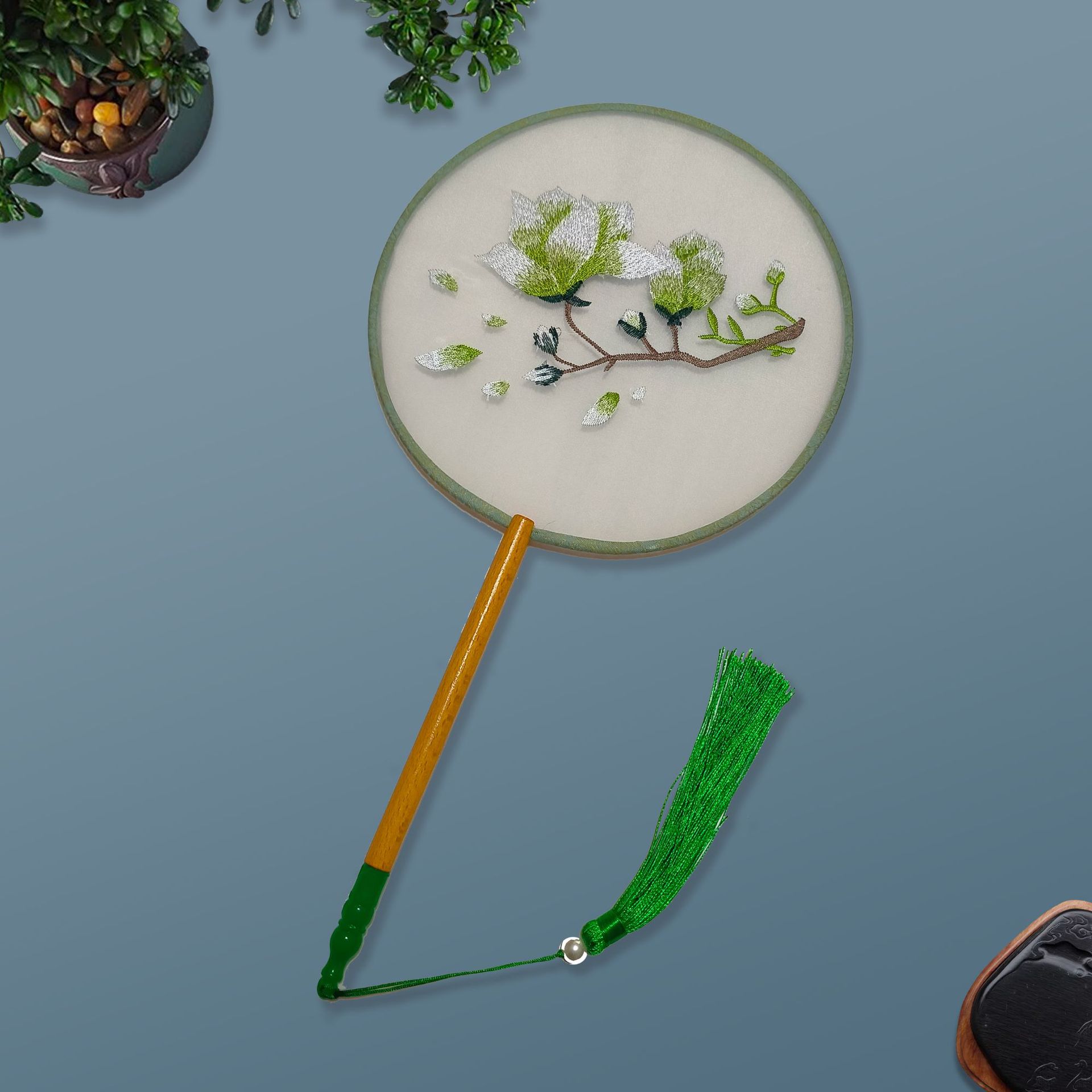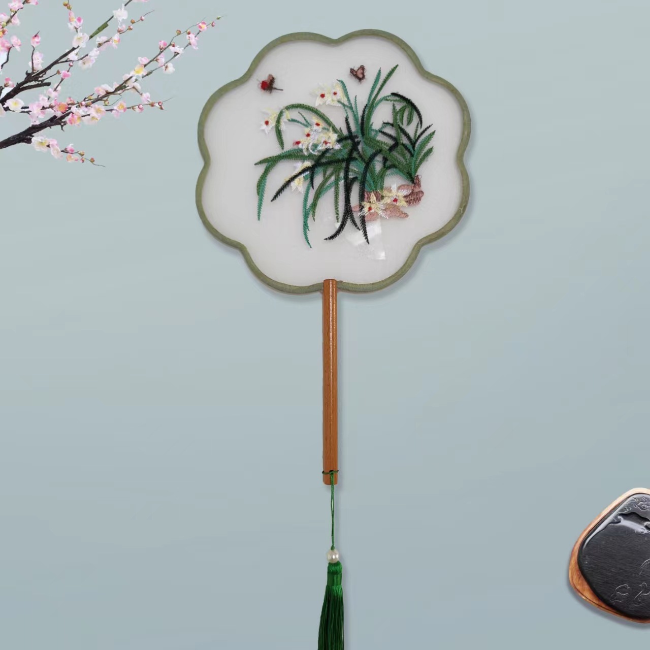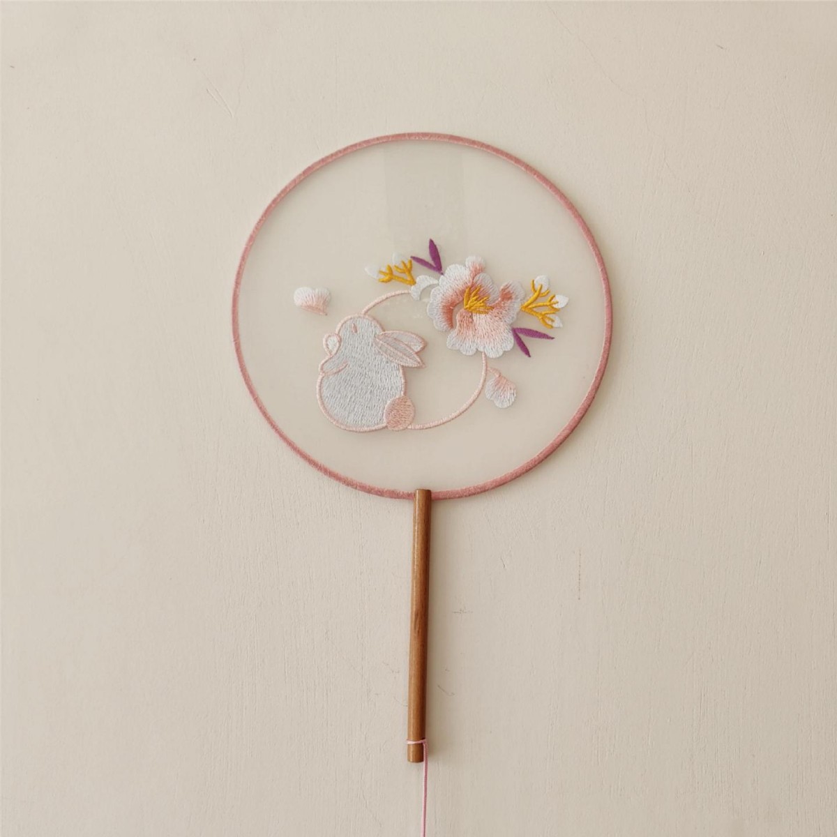 单面刺绣古风团扇 中国风苏绣长柄舞蹈扇子 新娘古装汉服旗袍圆扇