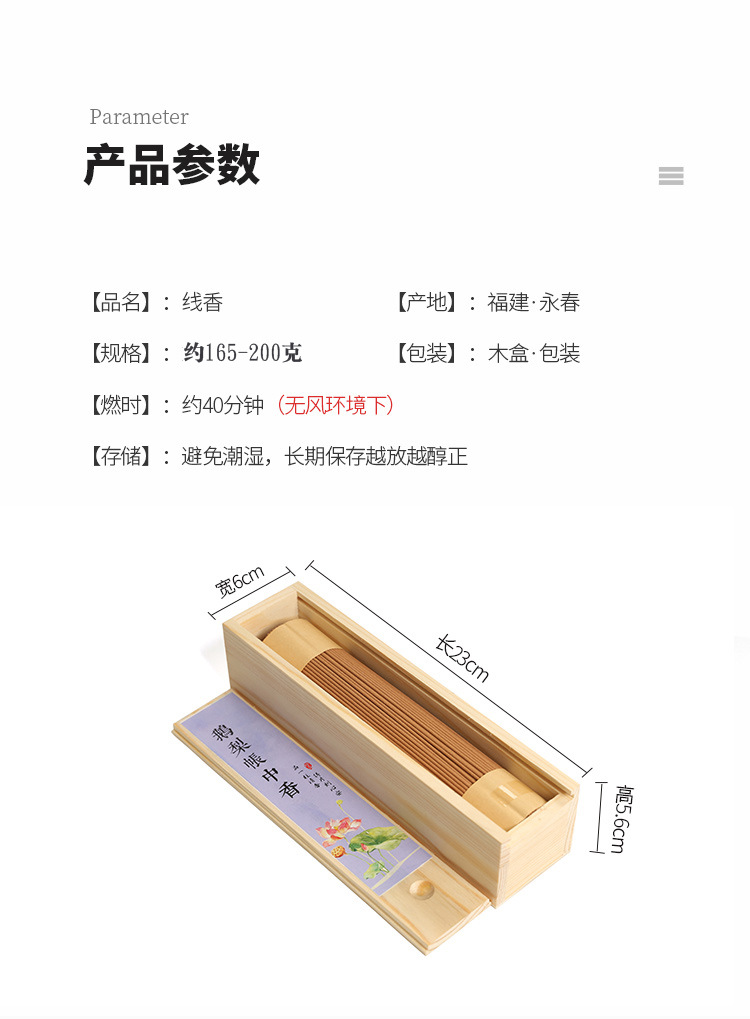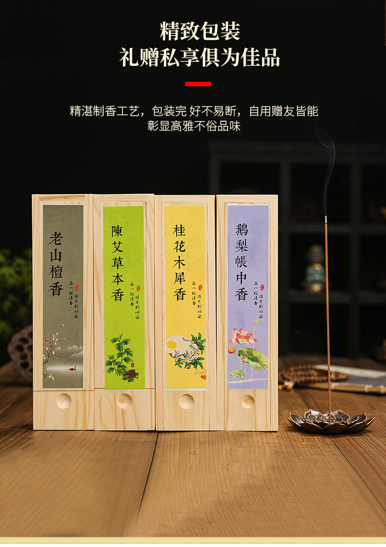 | (cedar fragrance + lavender + raccoon flower + aixiang) about 200 pieces in wood box((雪松香+薰衣草+枙子花+艾香)木盒装约200支) | USD $1.85 | 99999 box available |