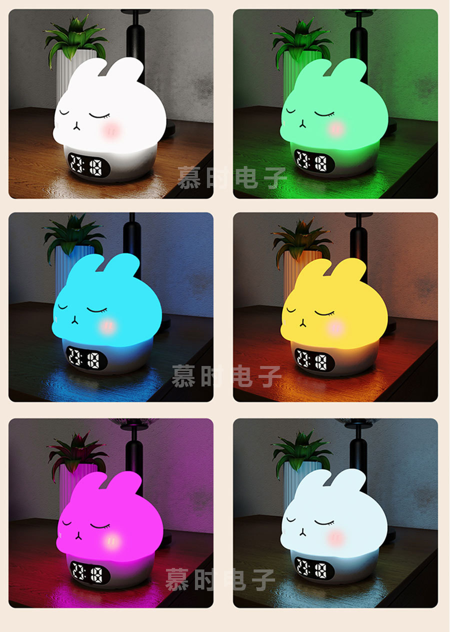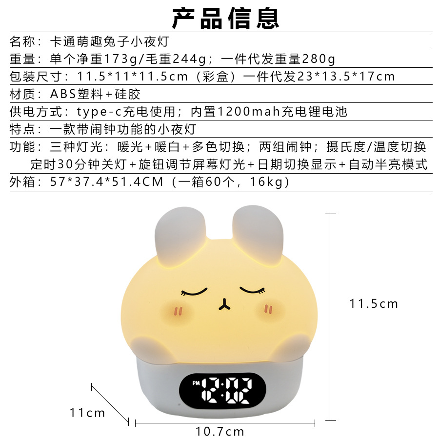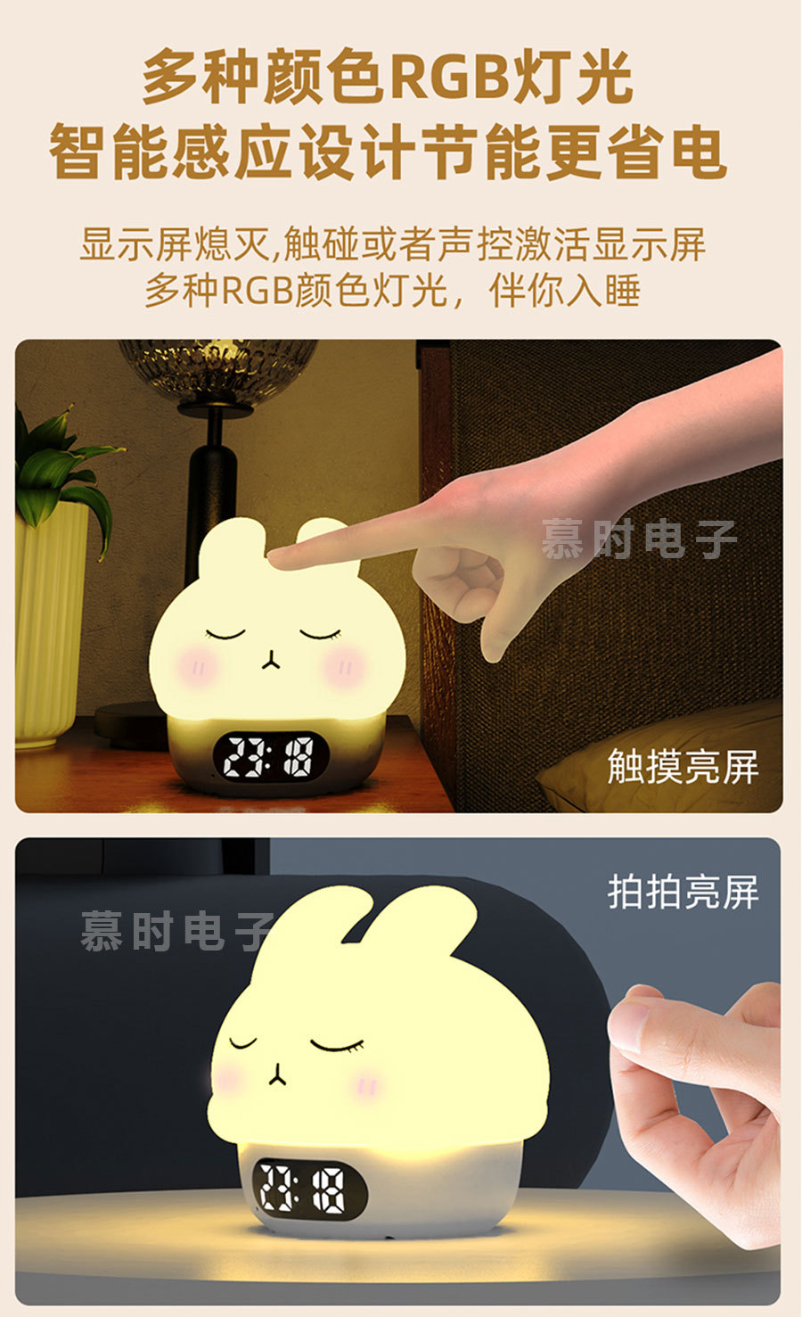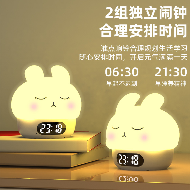 新款卡通硅胶兔子USB充电七彩创意护眼夜灯儿童卧室闹钟拍拍灯
