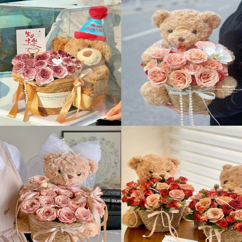 栗子熊抱抱花篮抱抱桶机织草编花盆花店节日爆款花篮网红热卖花篮