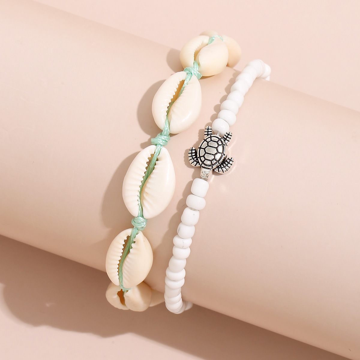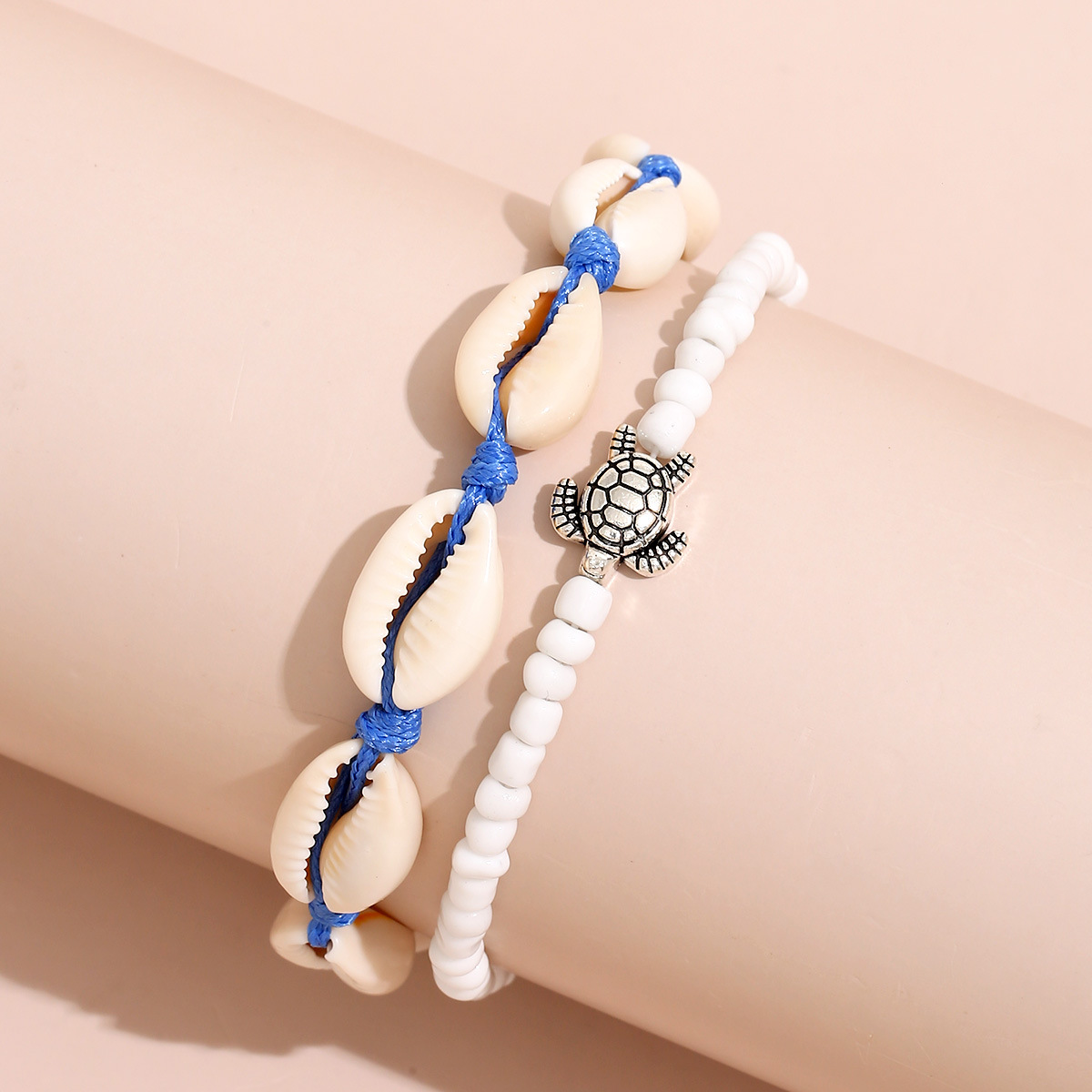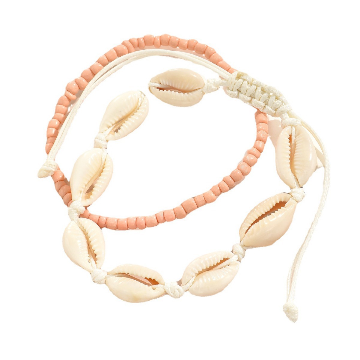 跨境脚链新款 波西米亚风贝壳编织打结脚链两件套手工串米珠脚饰
