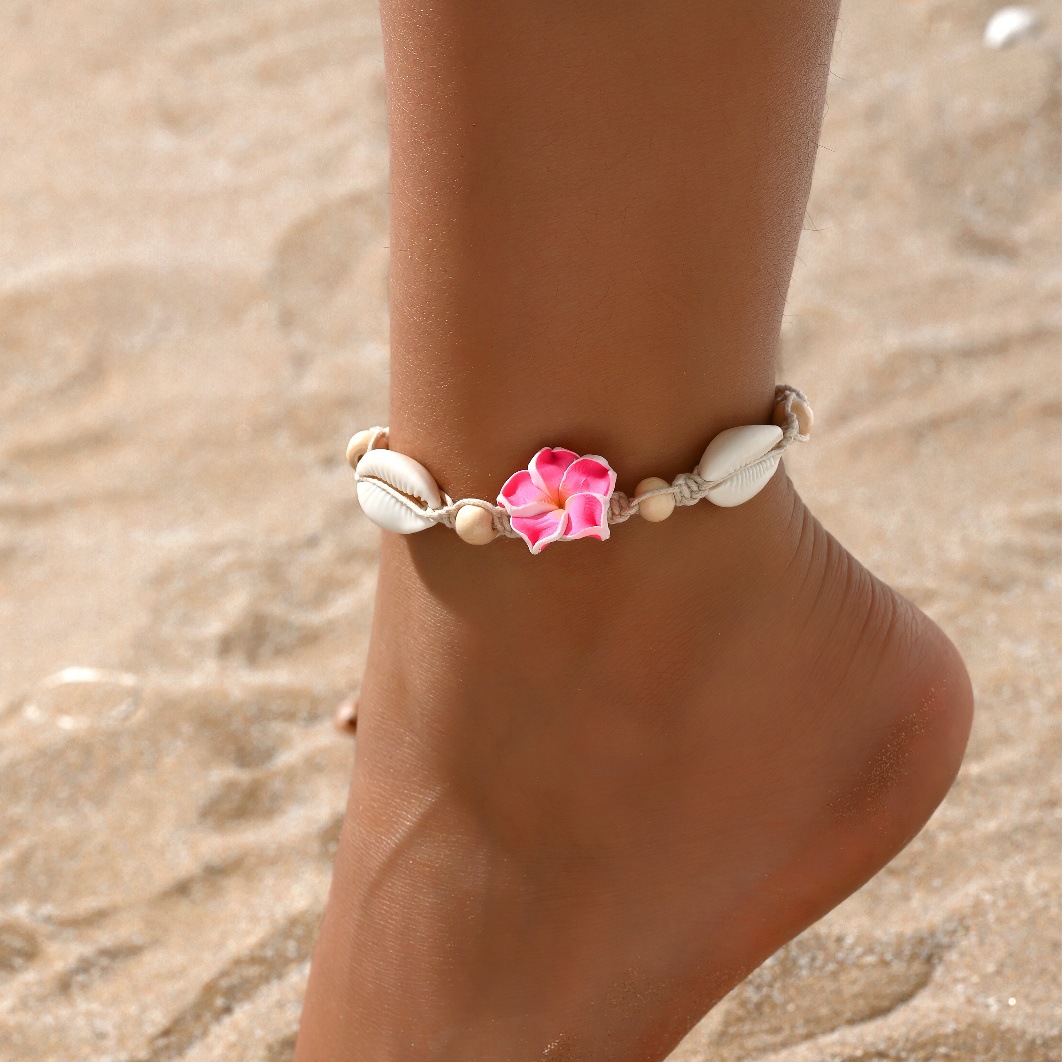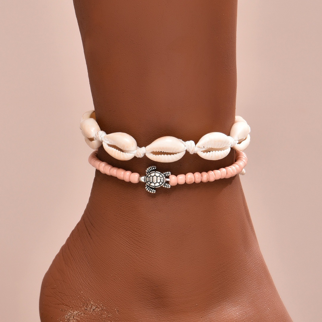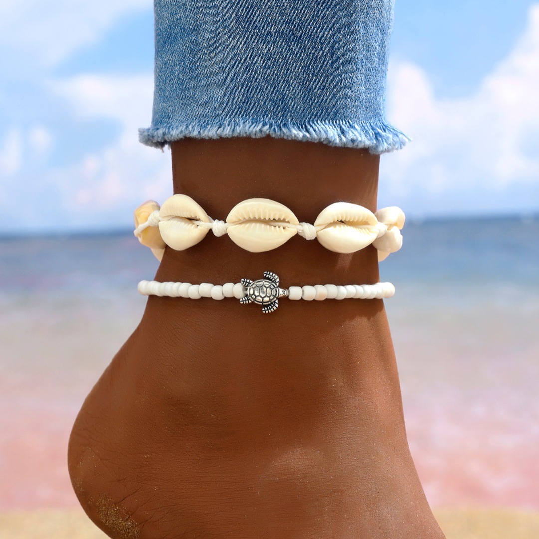 跨境脚链新款 波西米亚风贝壳编织打结脚链两件套手工串米珠脚饰