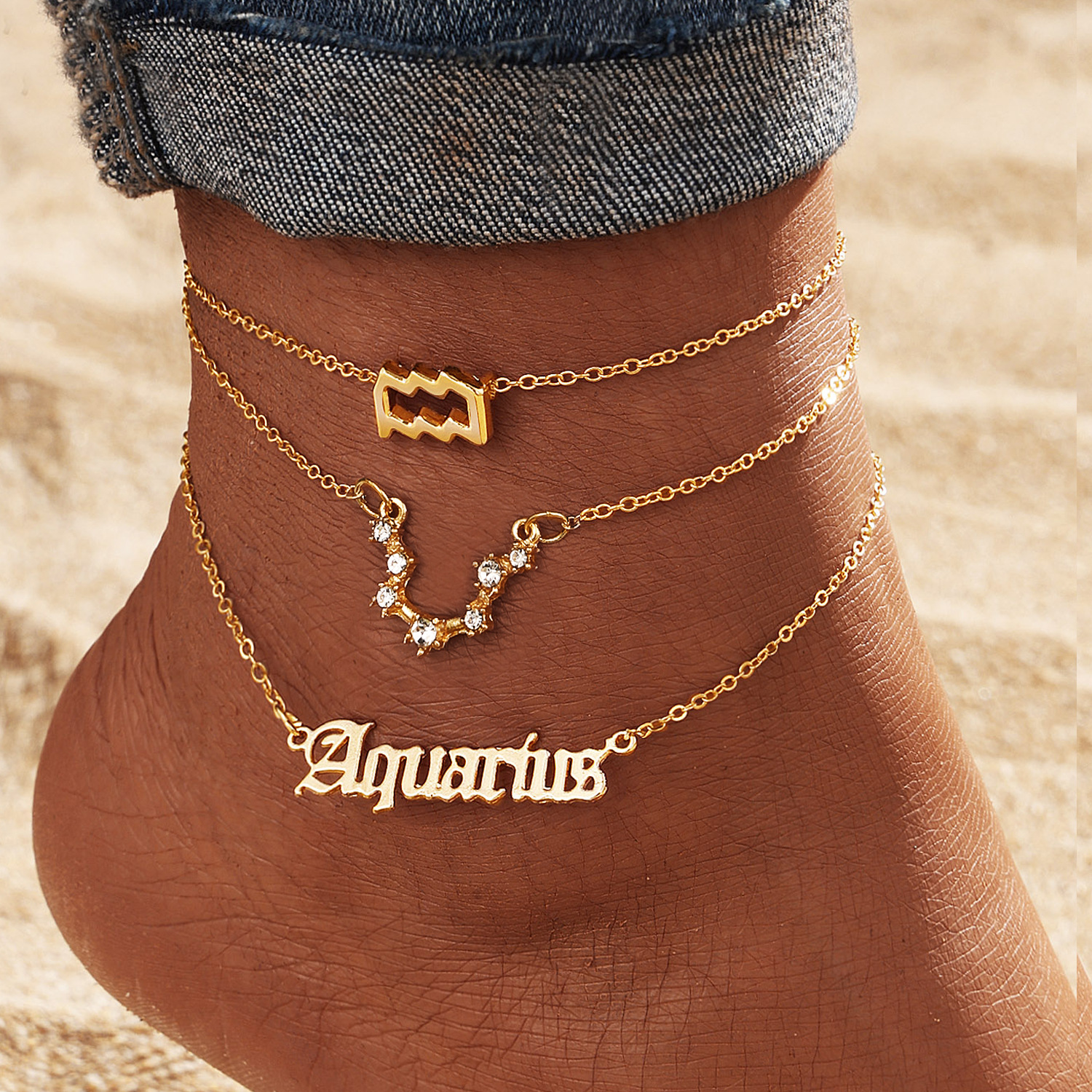 欧美12星座合金脚链女多层十二星宿金色镶钻脚饰3件套高级感饰品