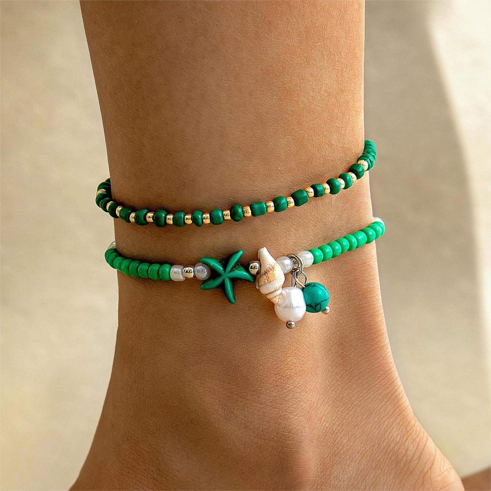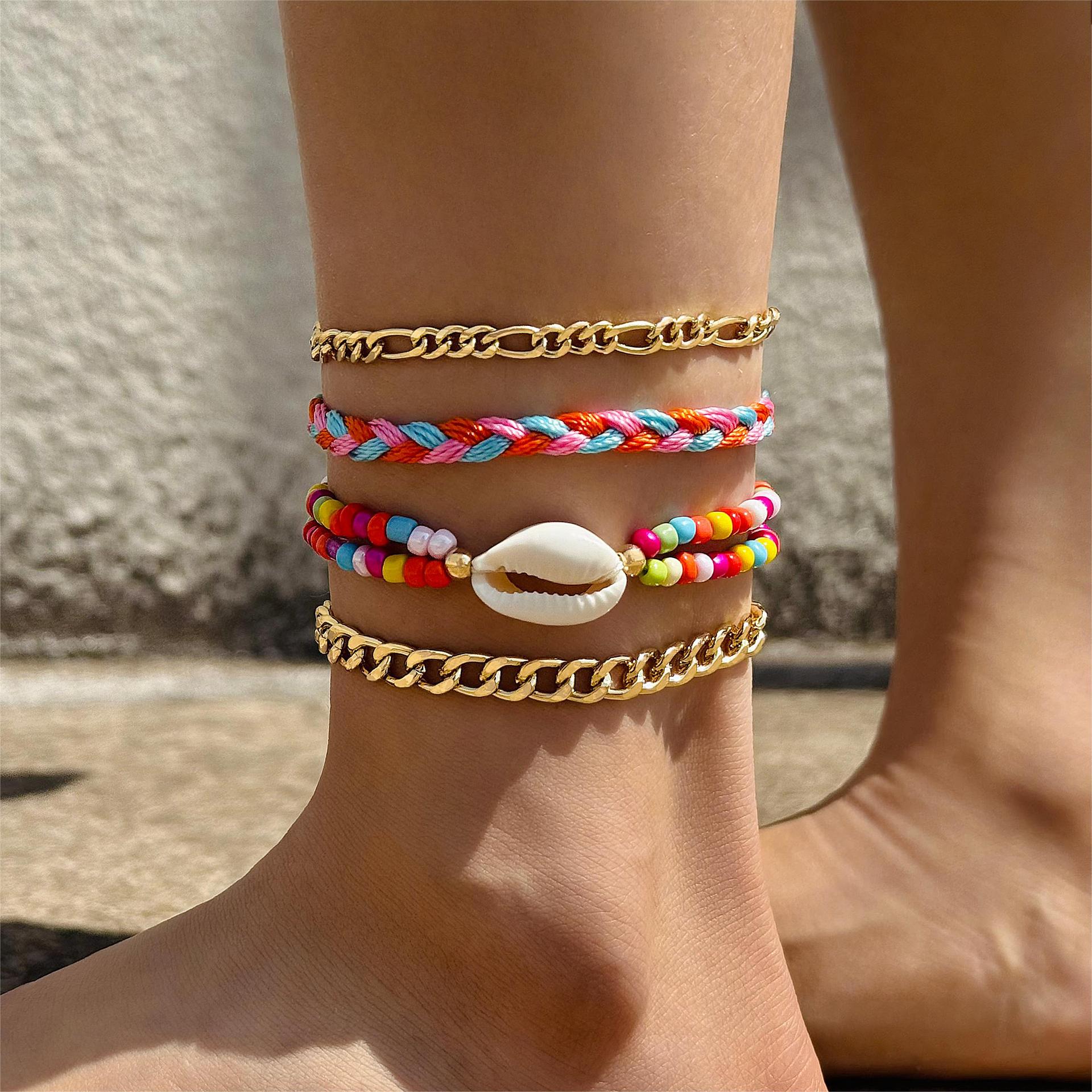 速卖通跨境沙滩风脚饰 贝壳编织多层脚链 滴油贝壳圆片四层脚链