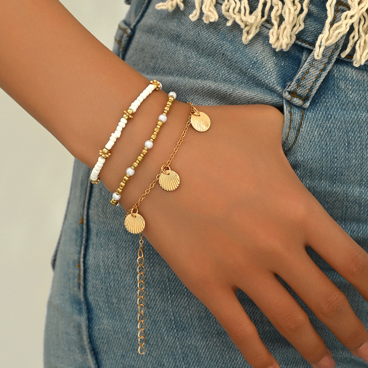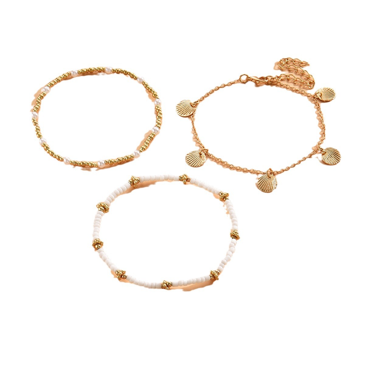 跨境欧美简约设计合金贝壳吊坠米珠脚链复古百搭个性多层度假脚饰