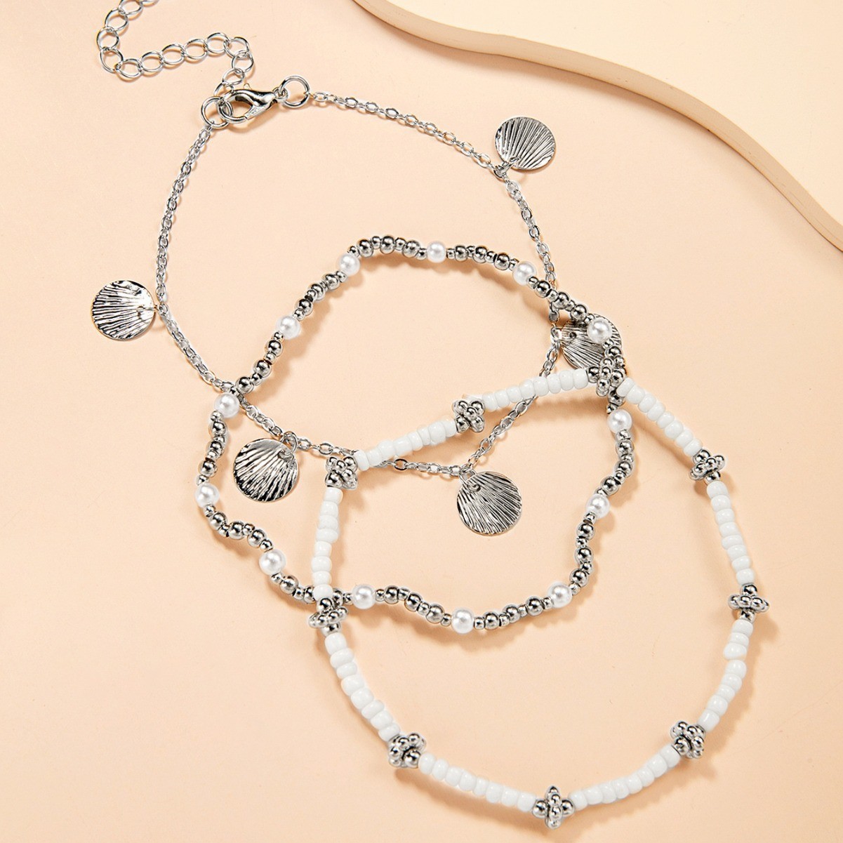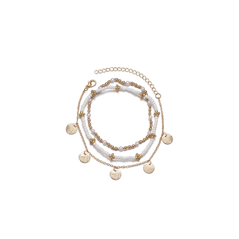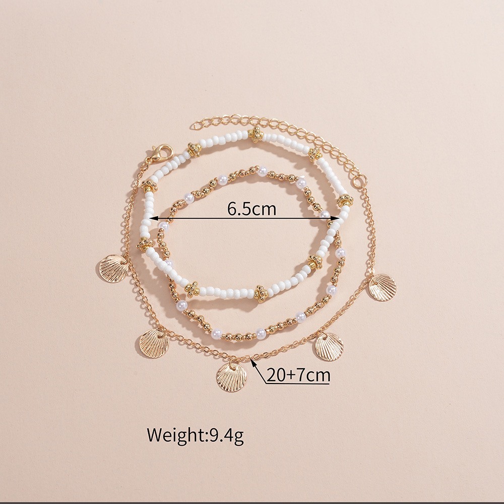 波西米亚度假风合金扇贝吊坠珍珠米珠弹力脚链3件套男女通用