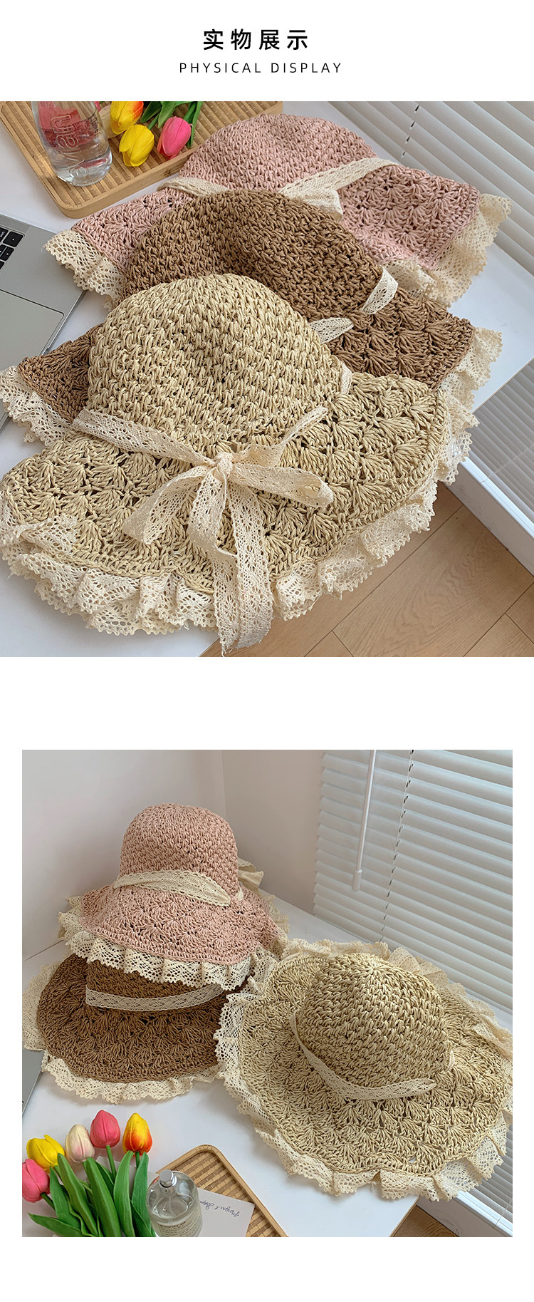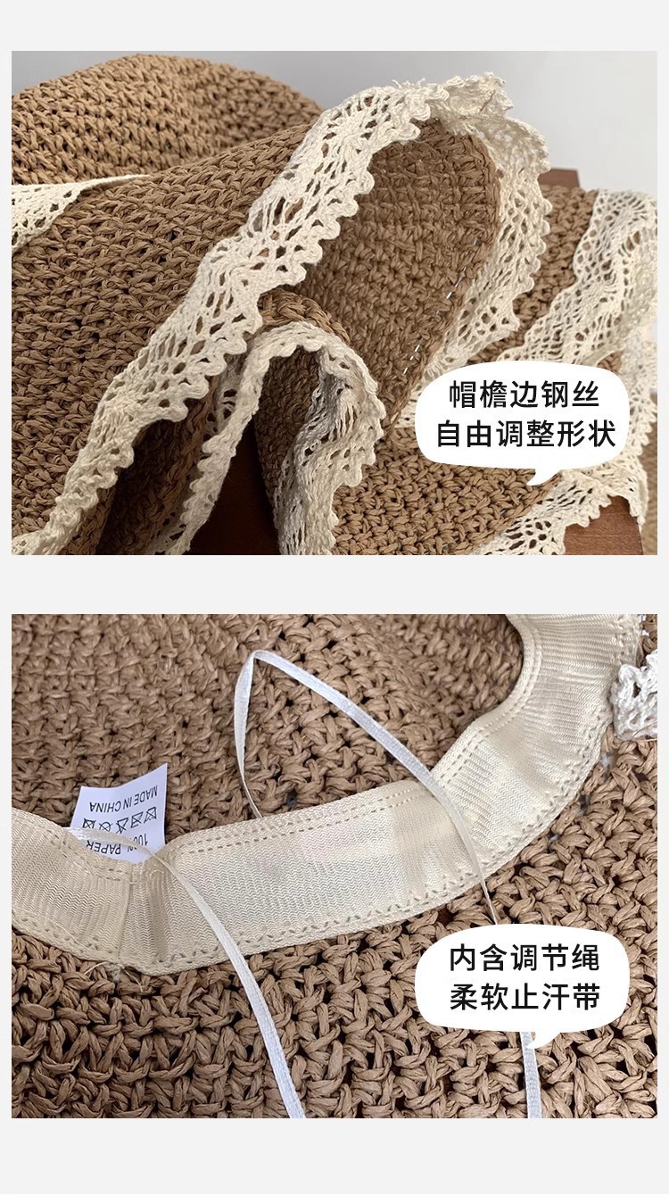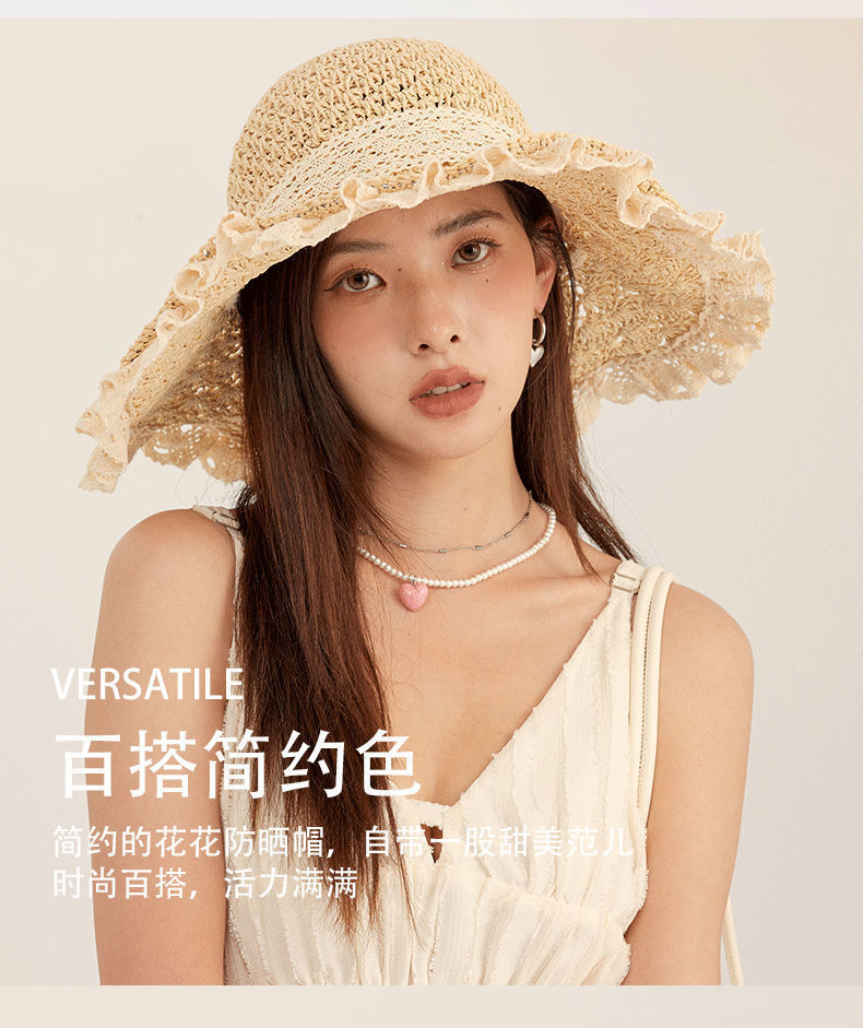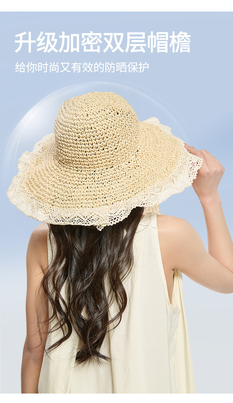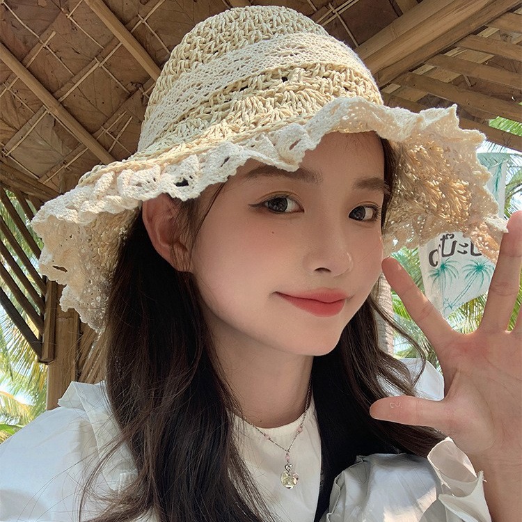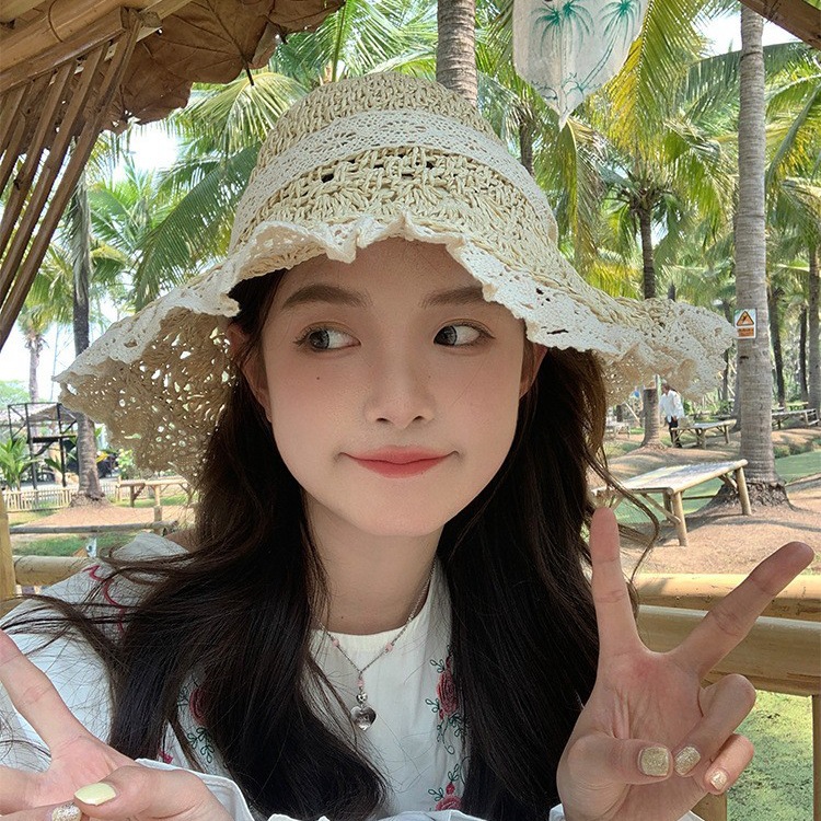 夏季出游防晒手工草编帽女沙滩海边户外太阳帽蕾丝边钩针遮阳帽子