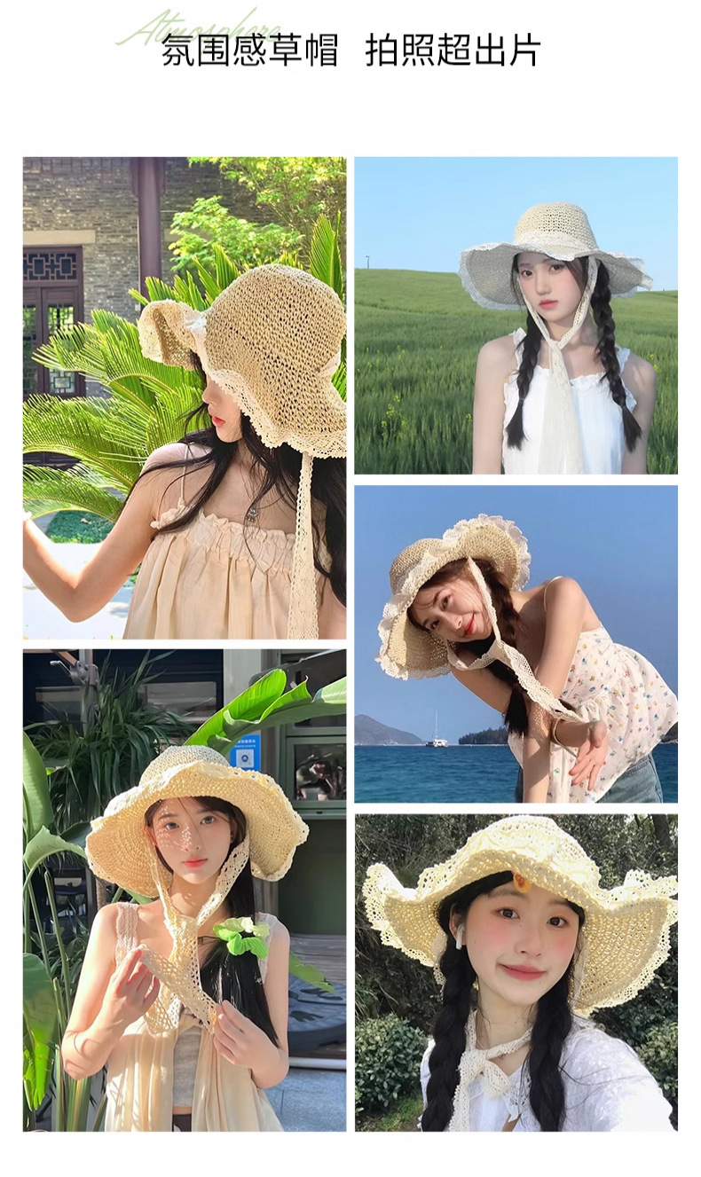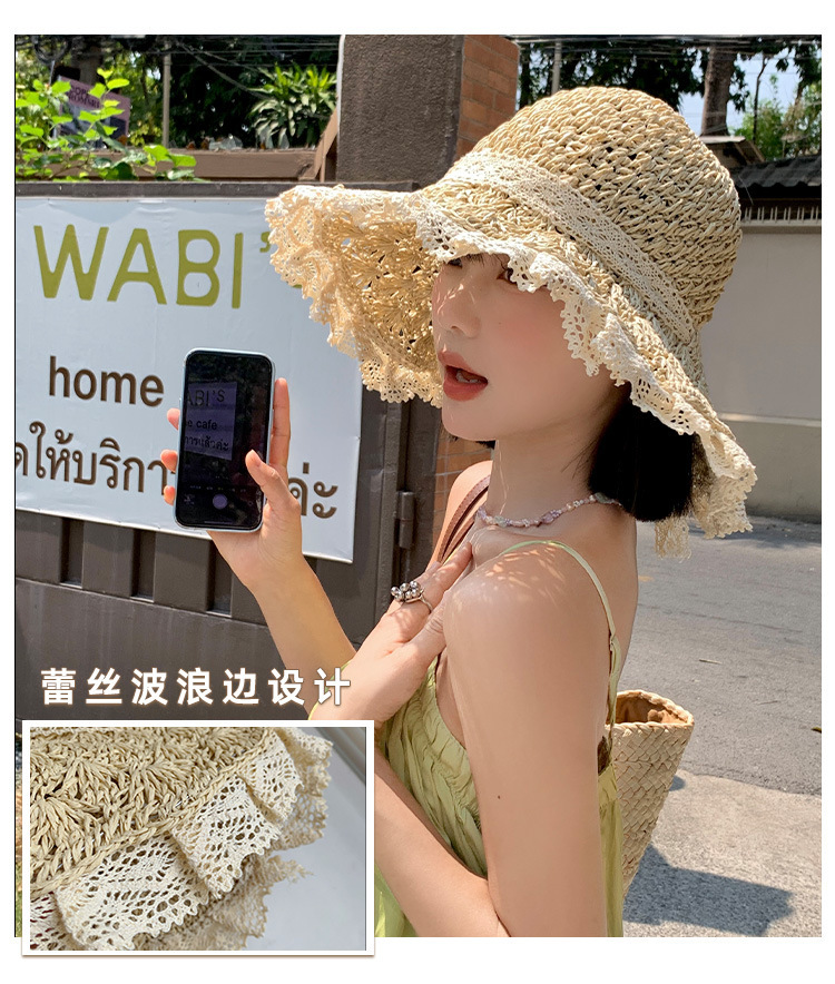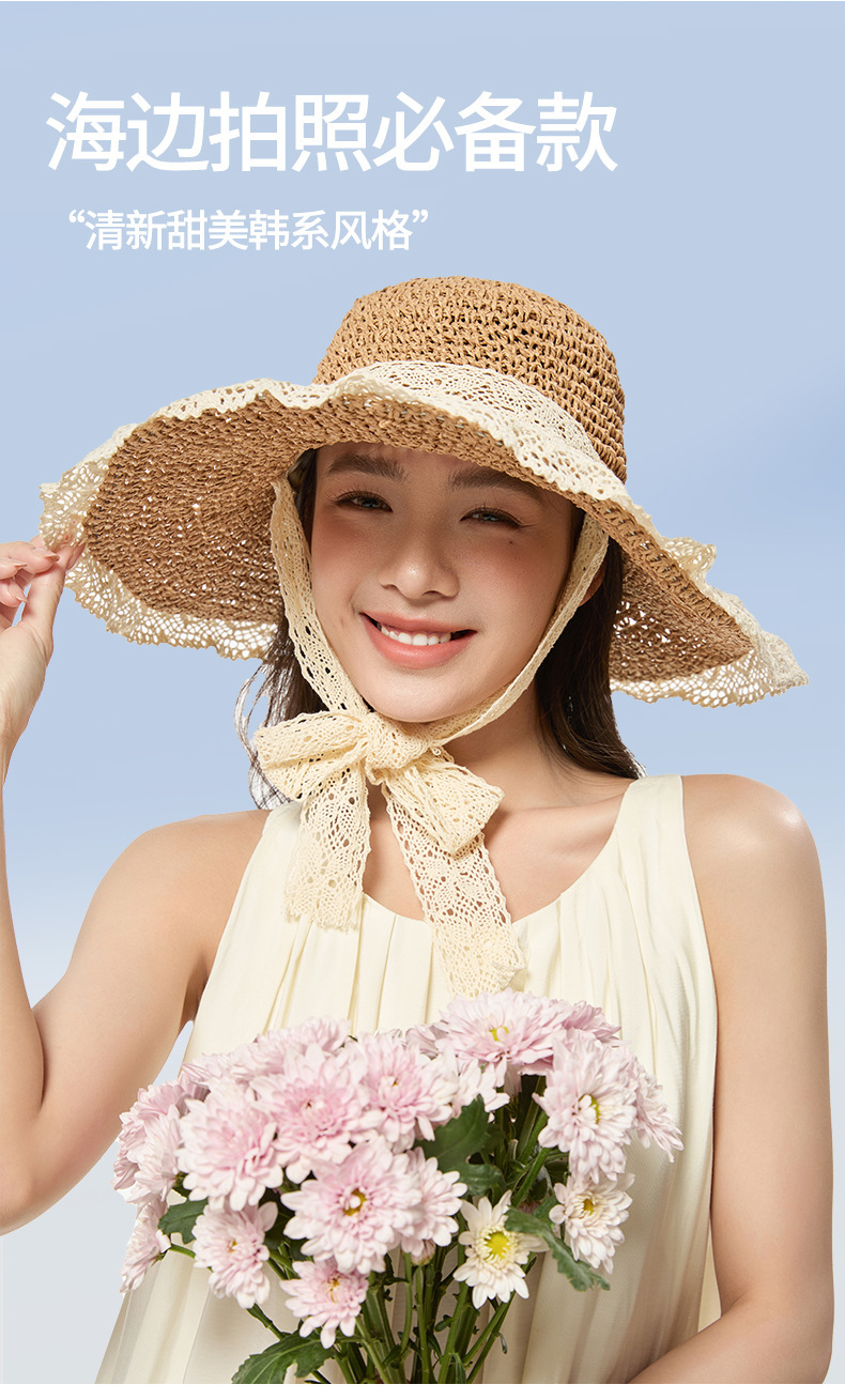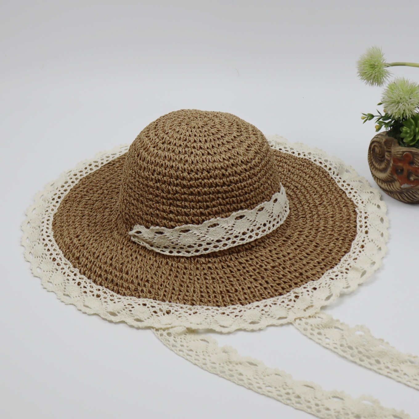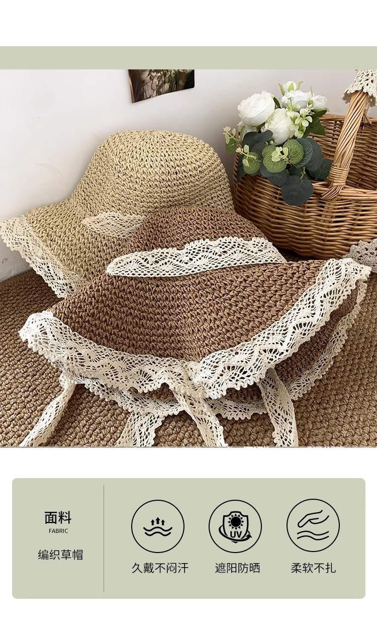 夏季出游防晒手工草编帽女沙滩海边户外太阳帽蕾丝边钩针遮阳帽子