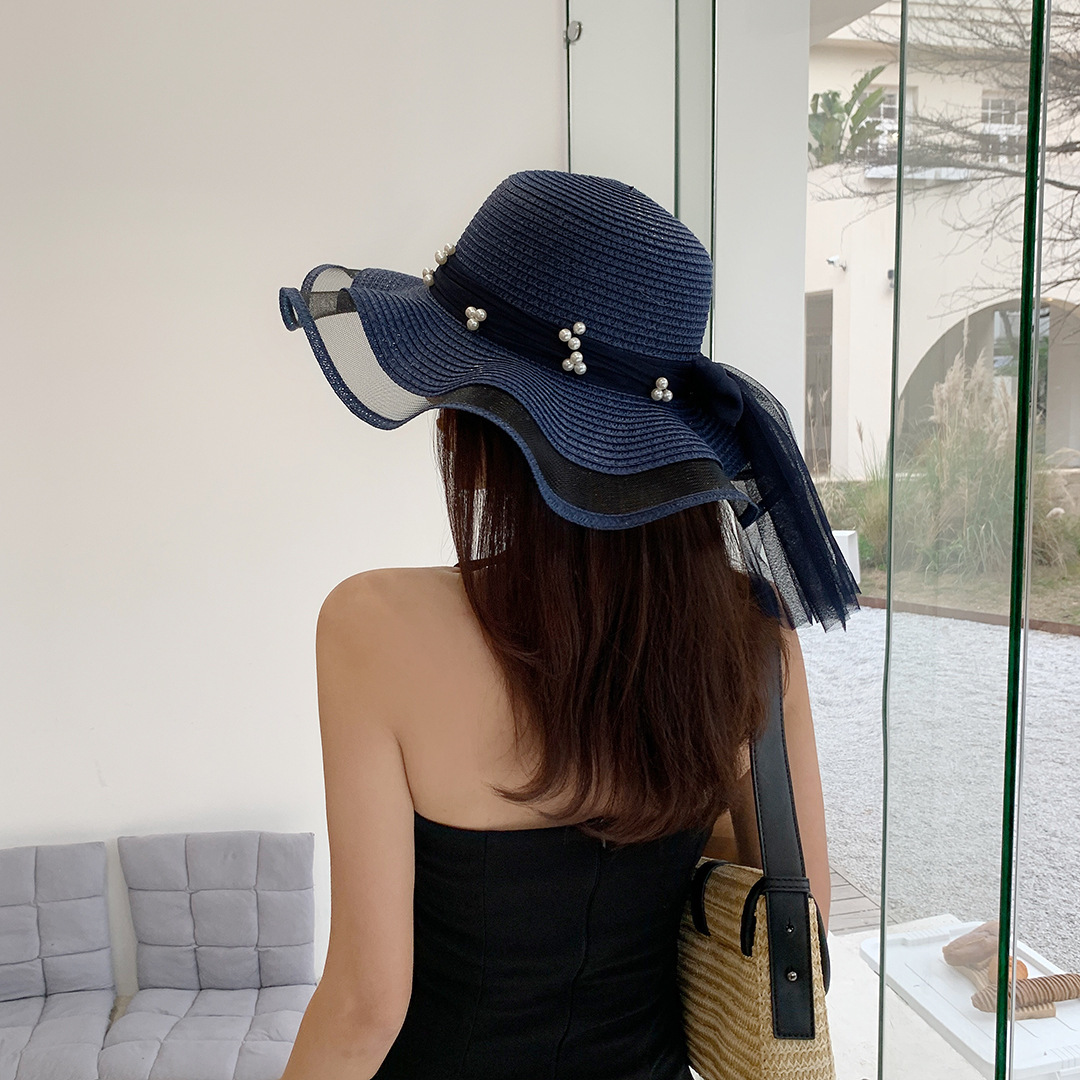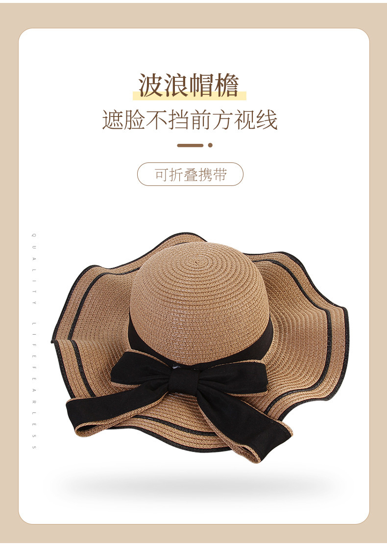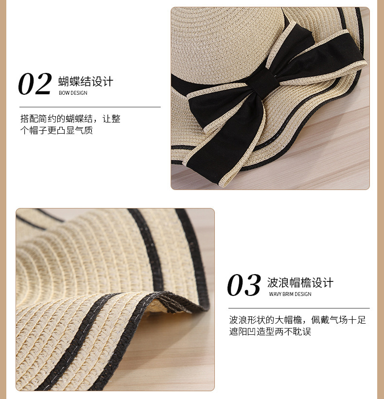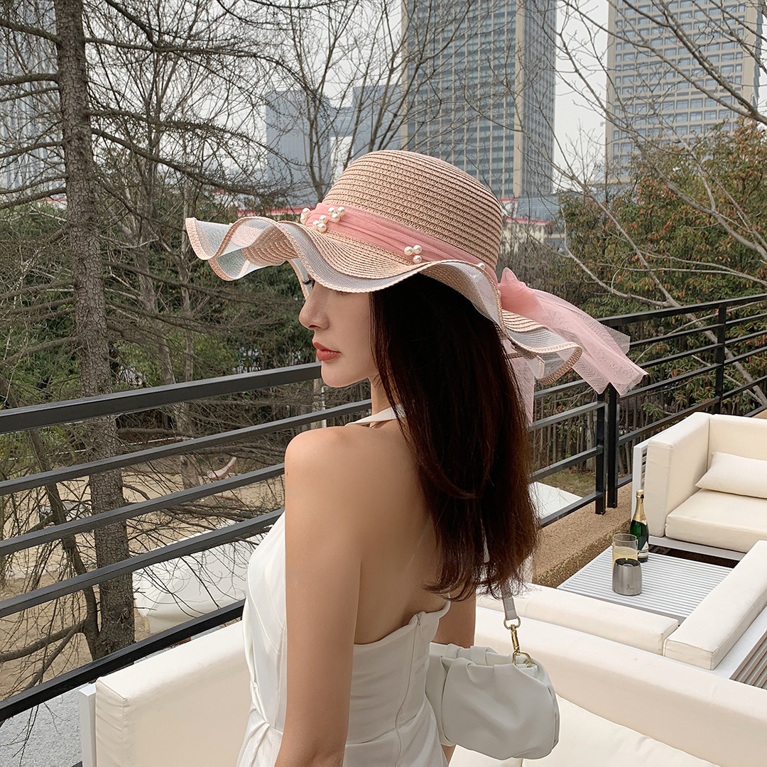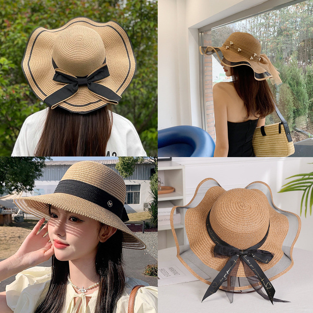 蝴蝶结草帽大全女夏季户外沙滩帽大檐飘带遮阳帽珍珠飘带防晒帽