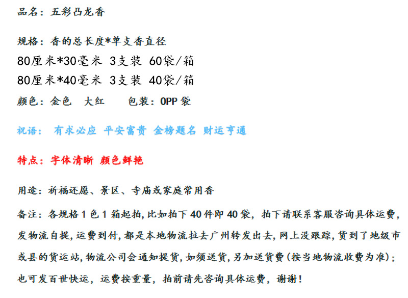 佛香五彩凸龙香60-80厘米3支装精品凸字香高香棒香寺庙香拜佛香