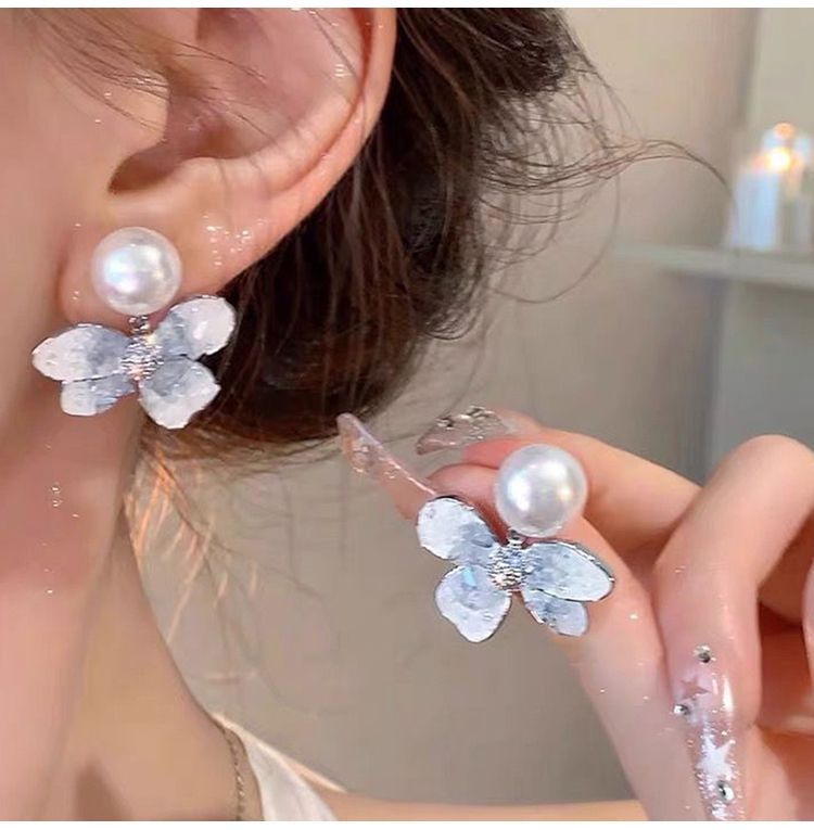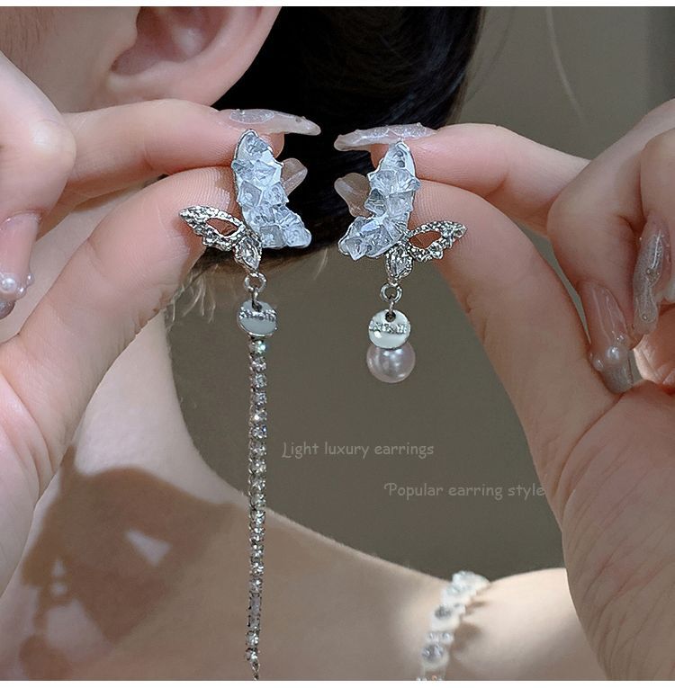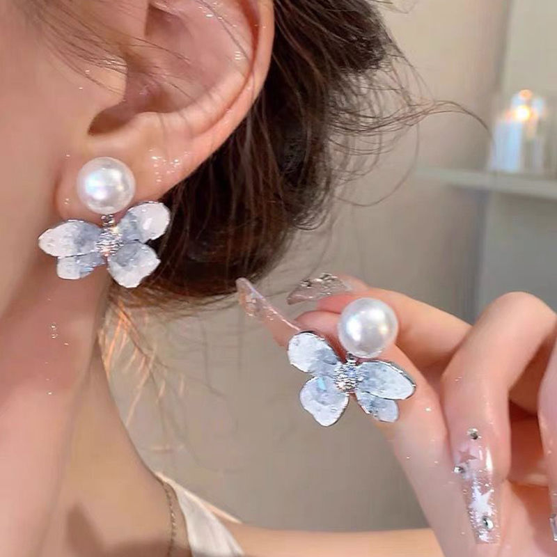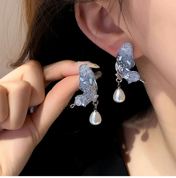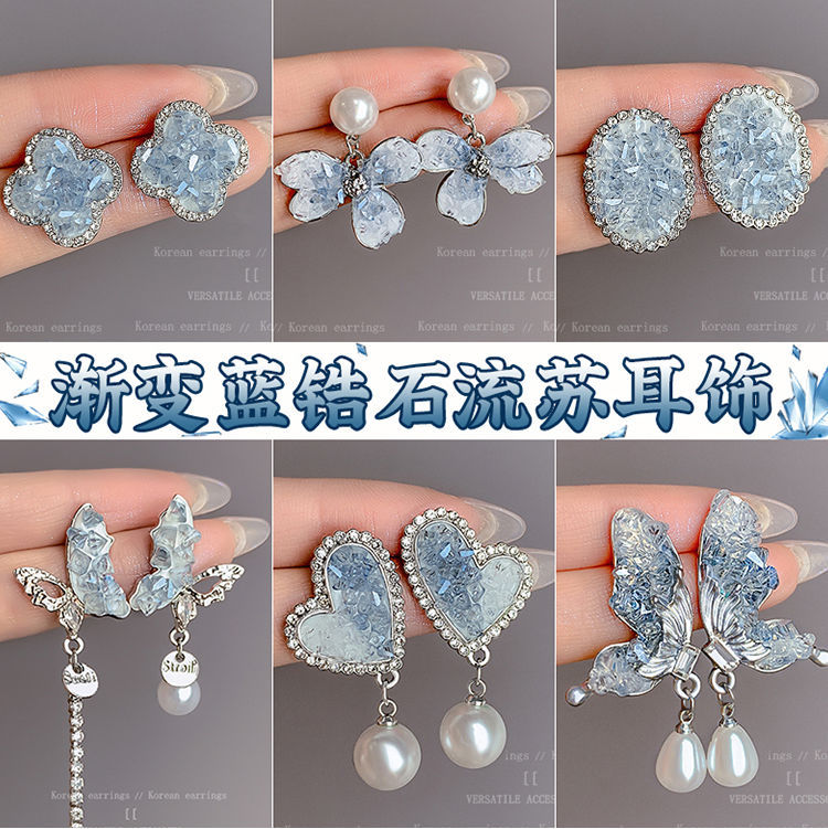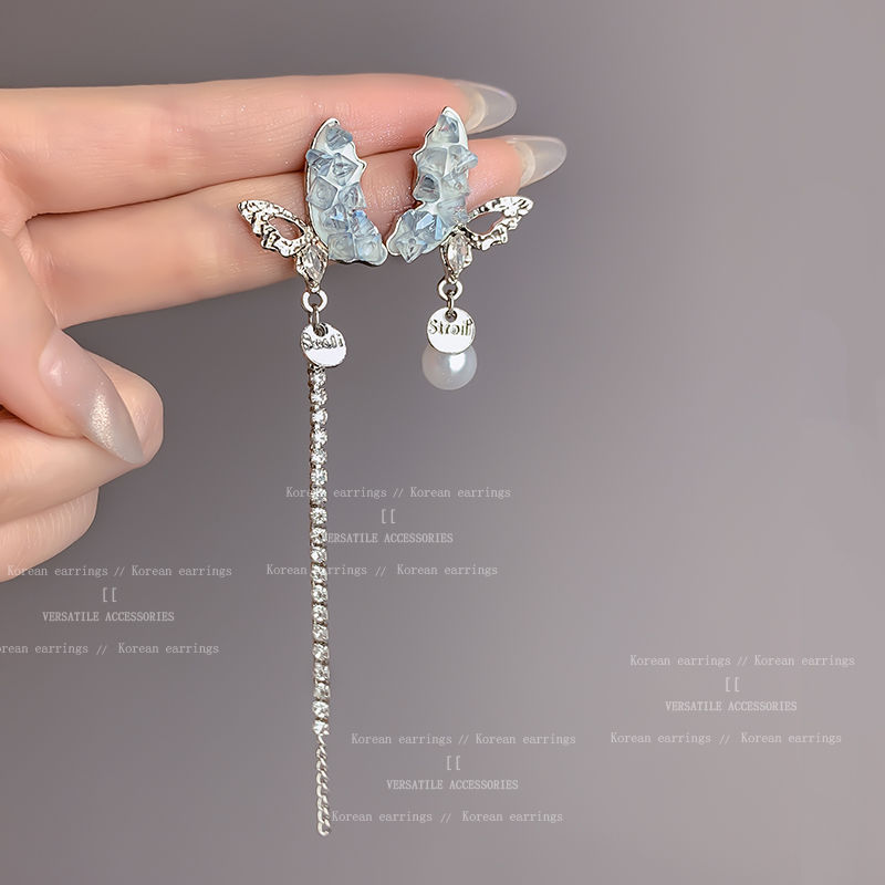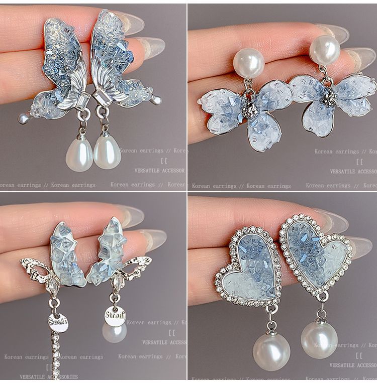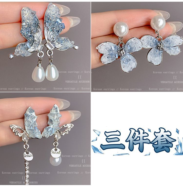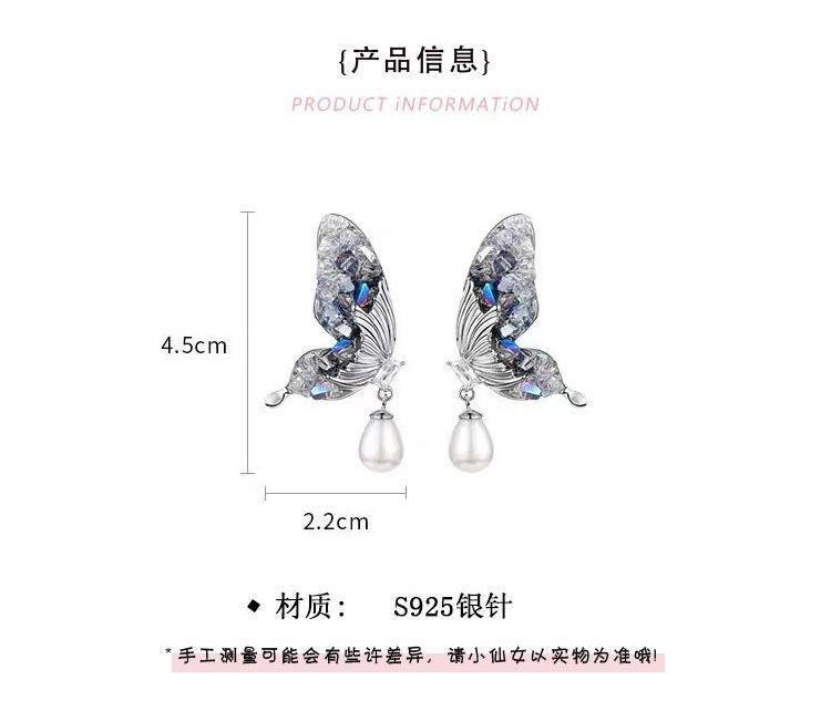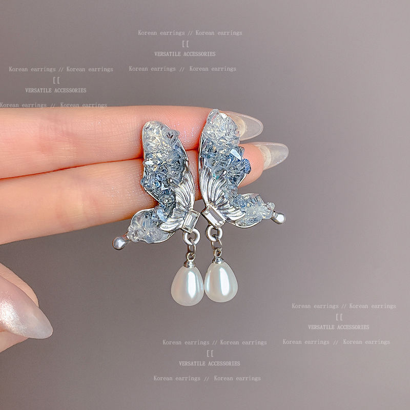 超仙蓝色蝴蝶珍珠耳钉女高级感气质碎钻耳环小众设计感显脸小耳饰