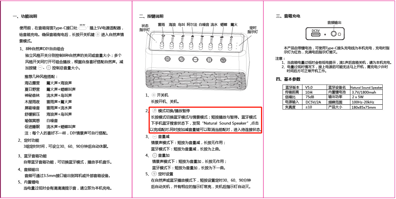 长按♫模式切换蓝牙模式与情景模式;短按播放与暂停。蓝牙模式下手机蓝牙搜索状态下,发现“Natural Sound Speaker”,点击以完成配对.同时按加减音量键可以取消当前配对,进入待连接状态
