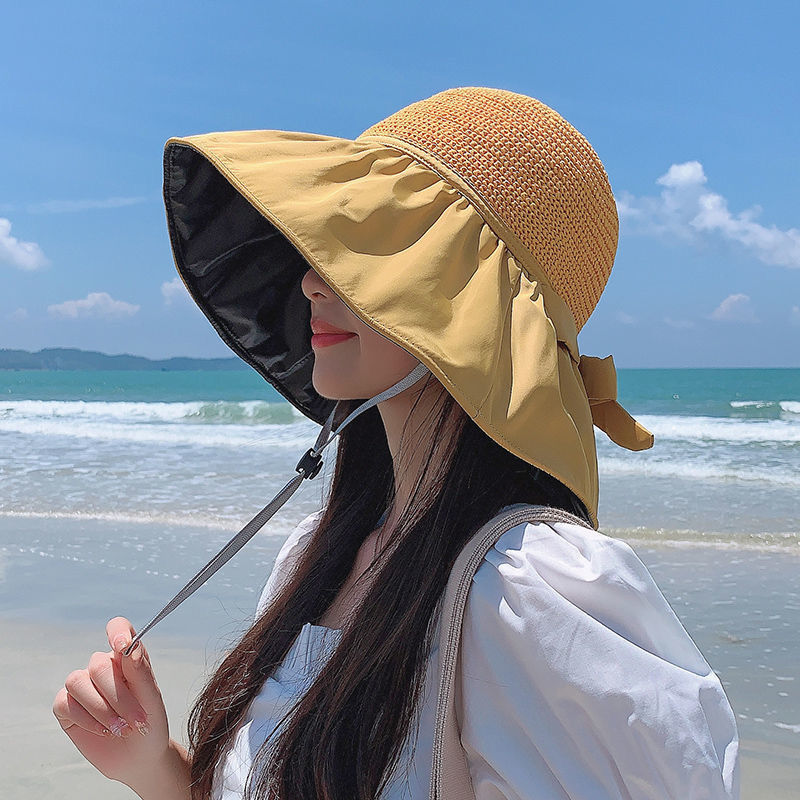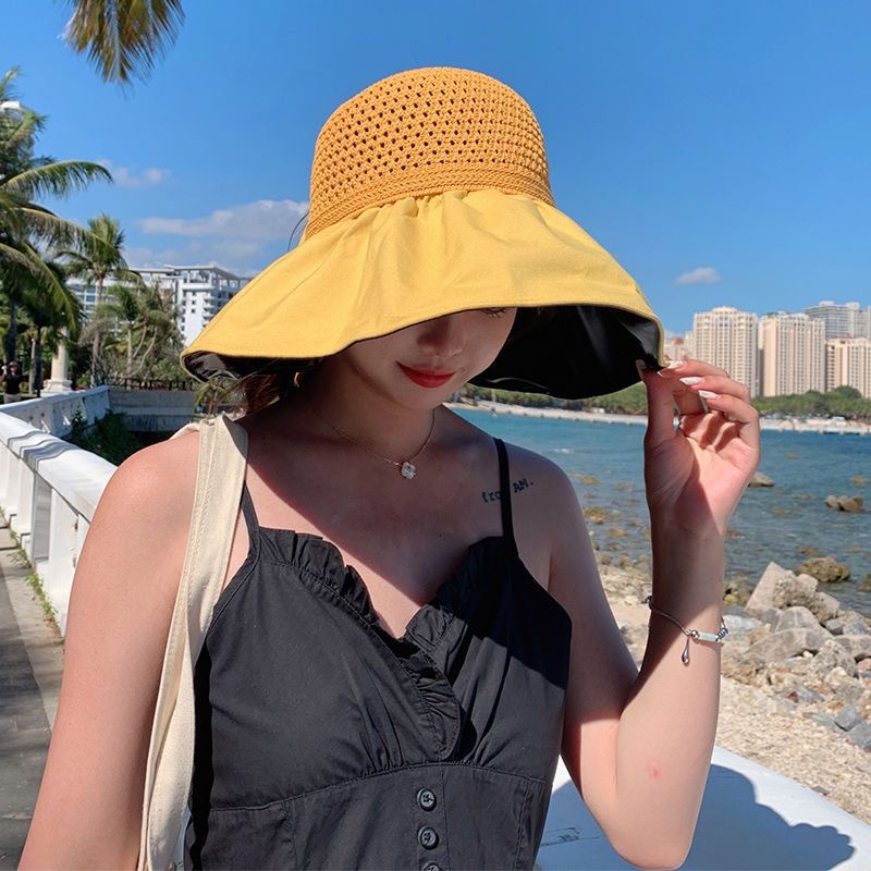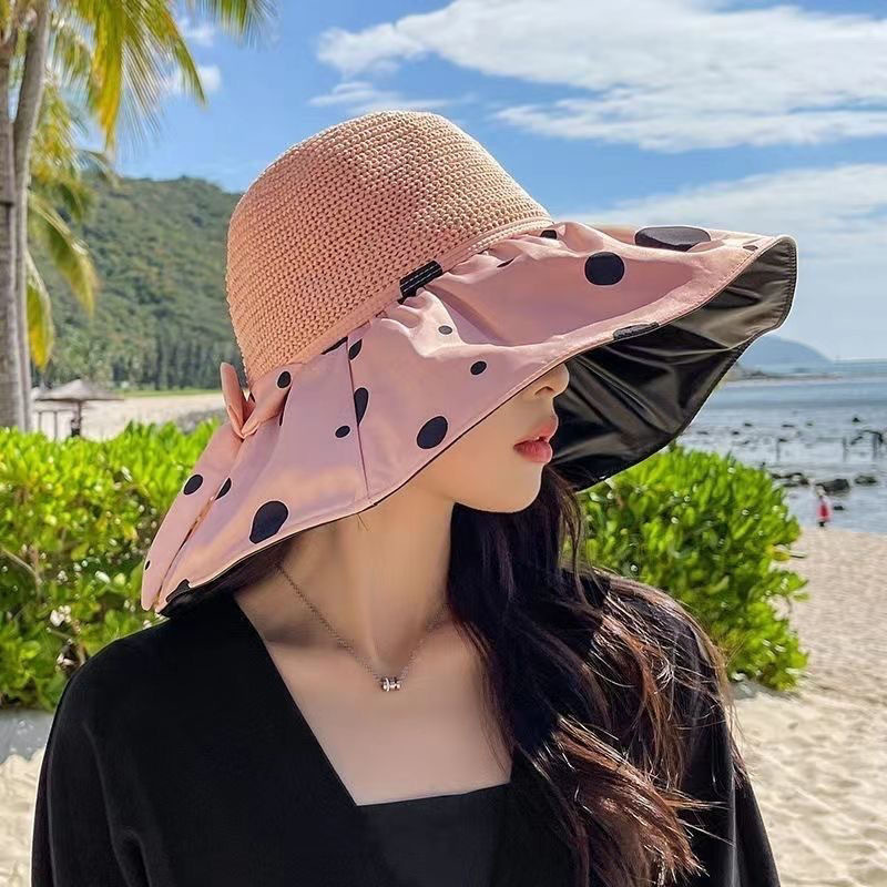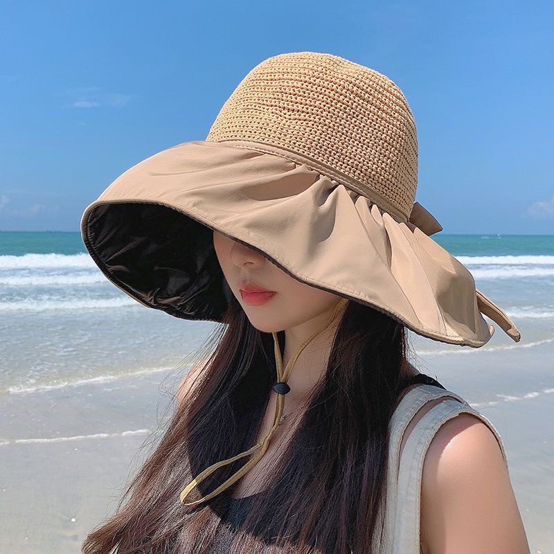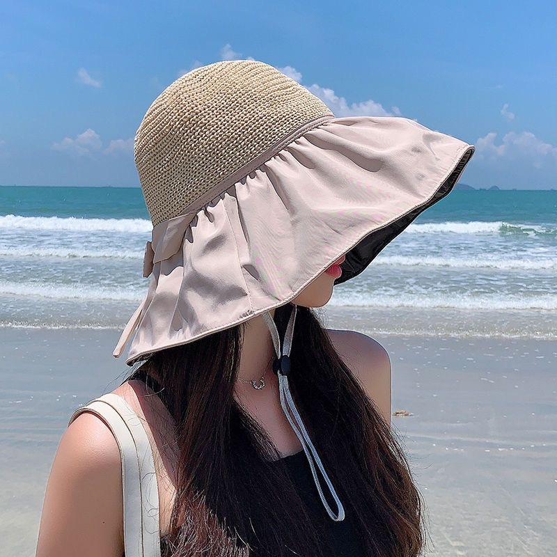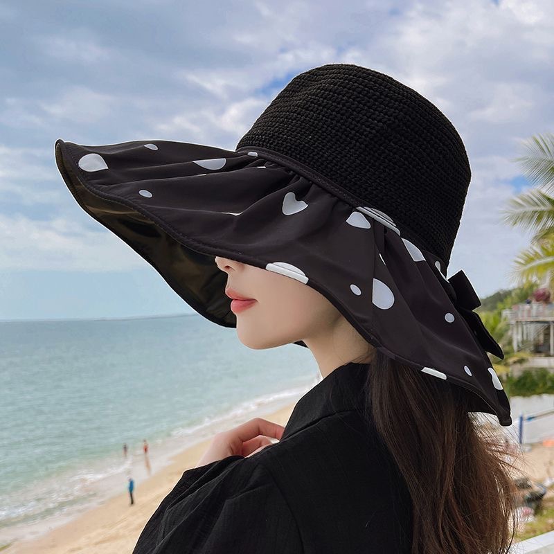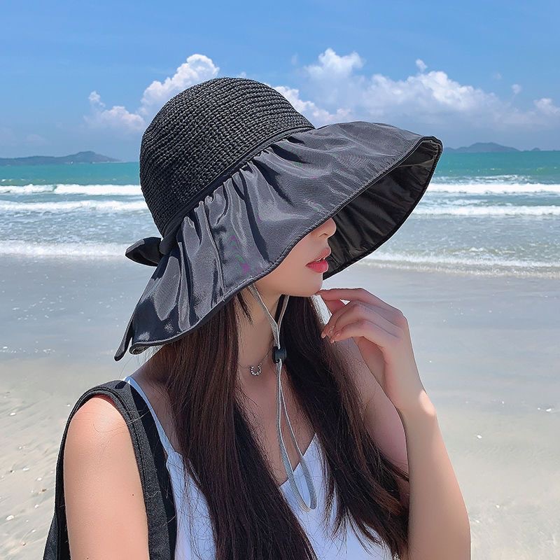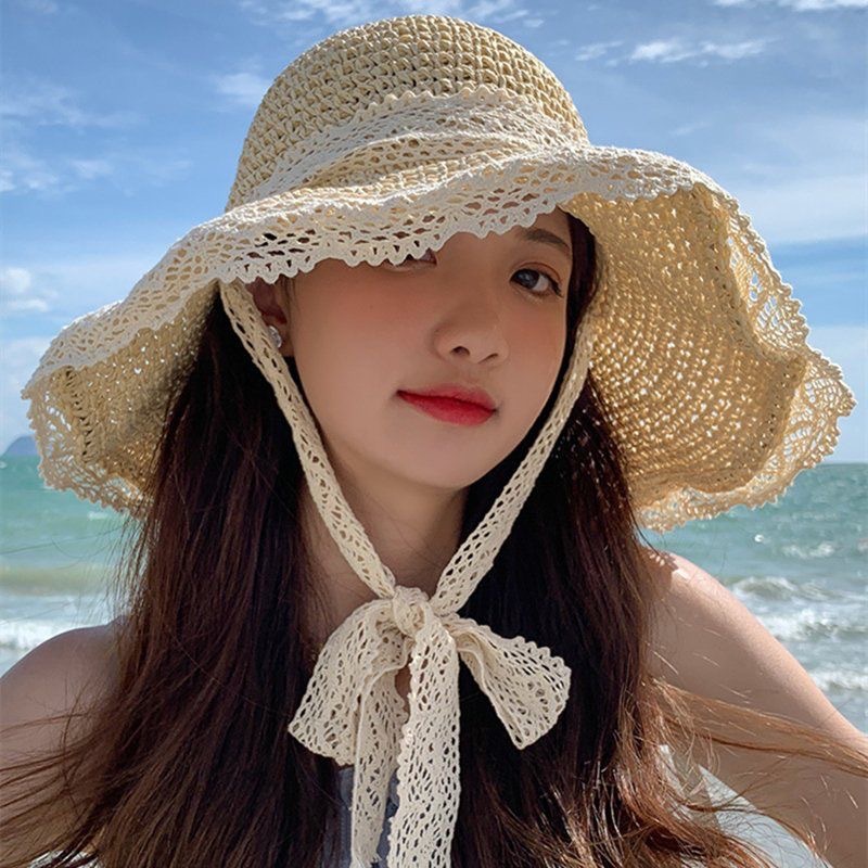 夏季蕾丝花边沙滩防晒帽女海边出游大帽檐遮阳帽防紫外线镂空草帽