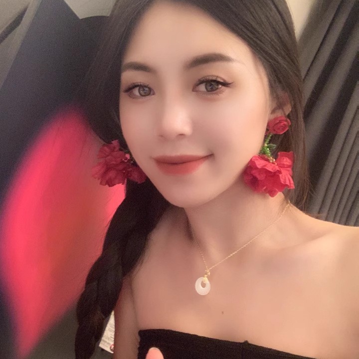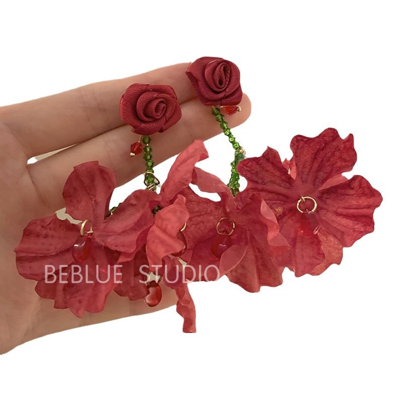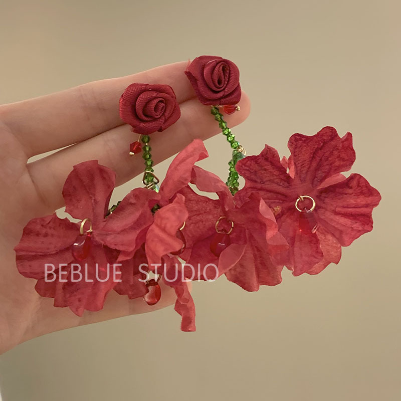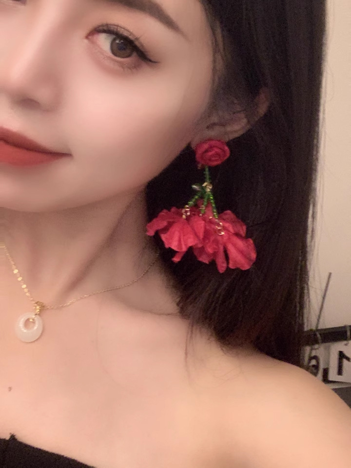 灼烧浪漫复古安可拉红色玫瑰花瓣流苏耳环女耳钉夸张新娘耳饰品