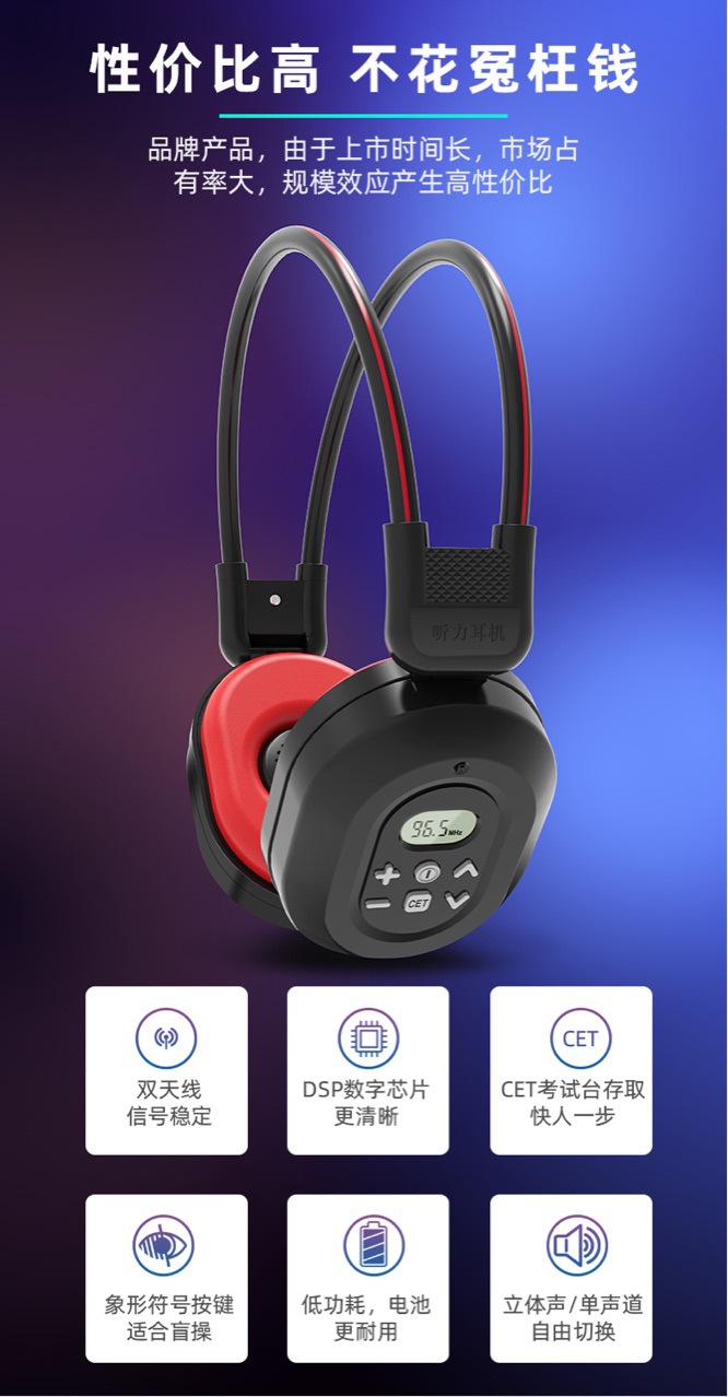艾本C-200A四级听力耳机英语考试四六级A级B级专八无线调频收音机