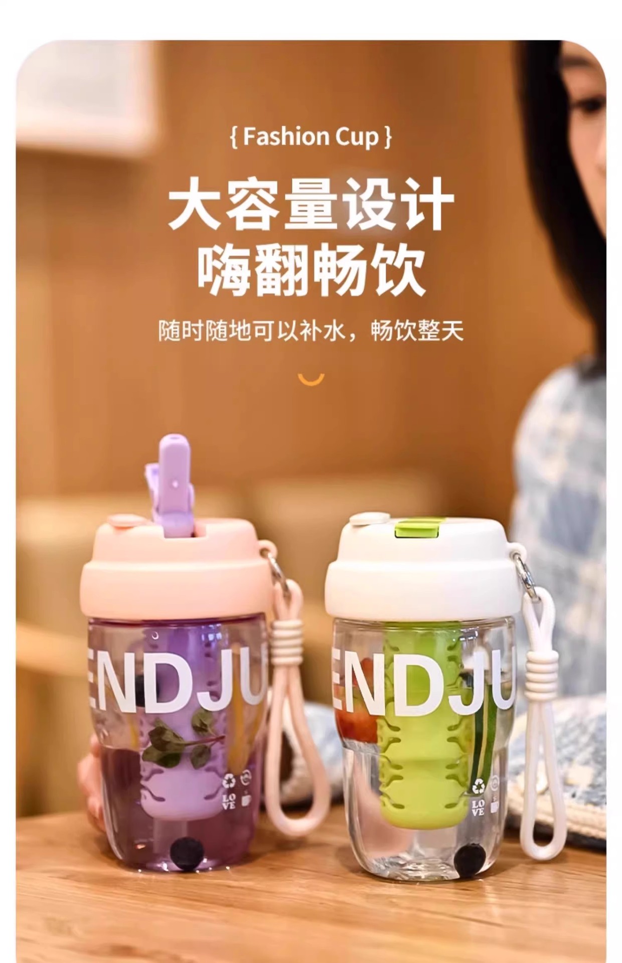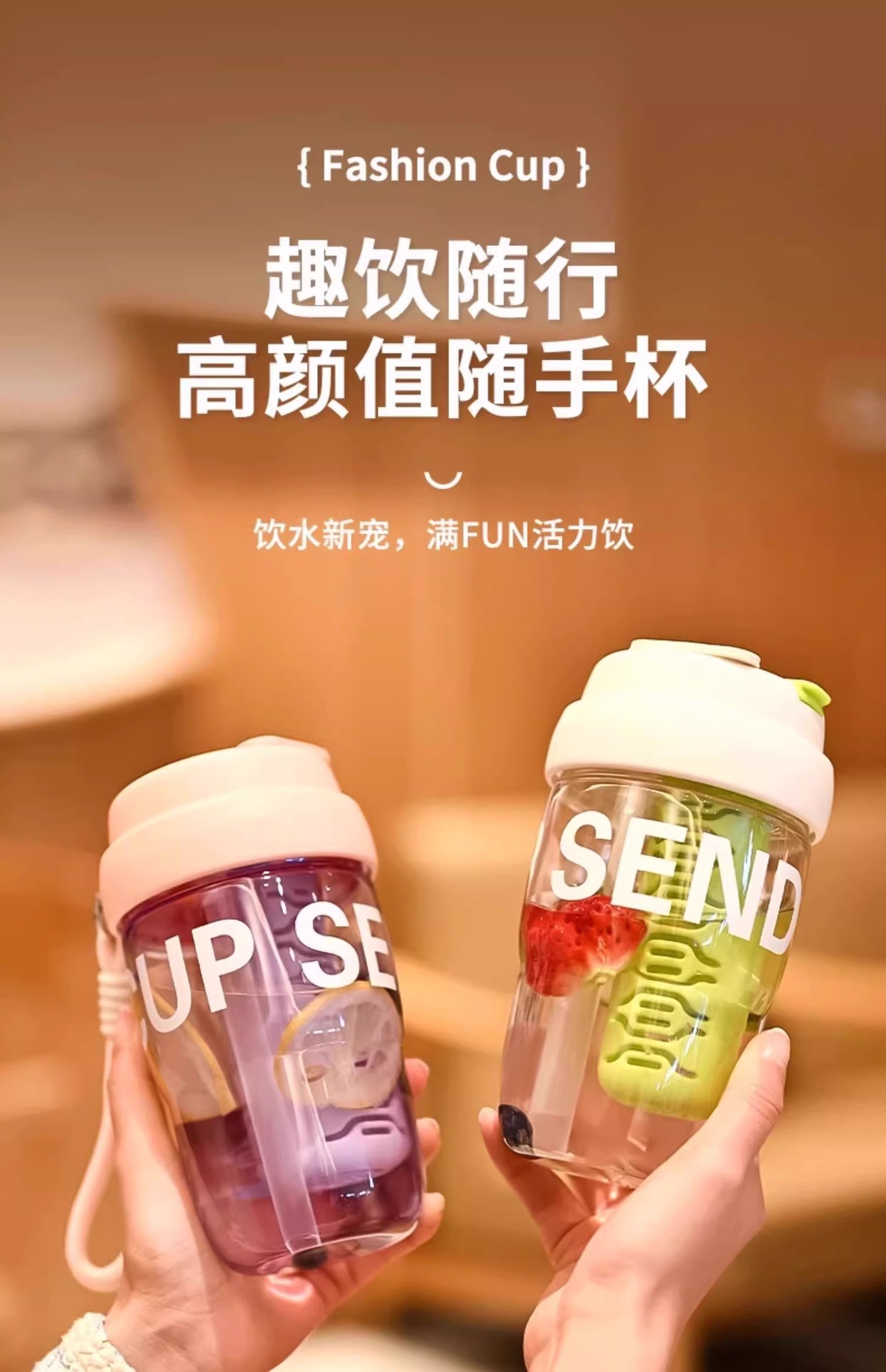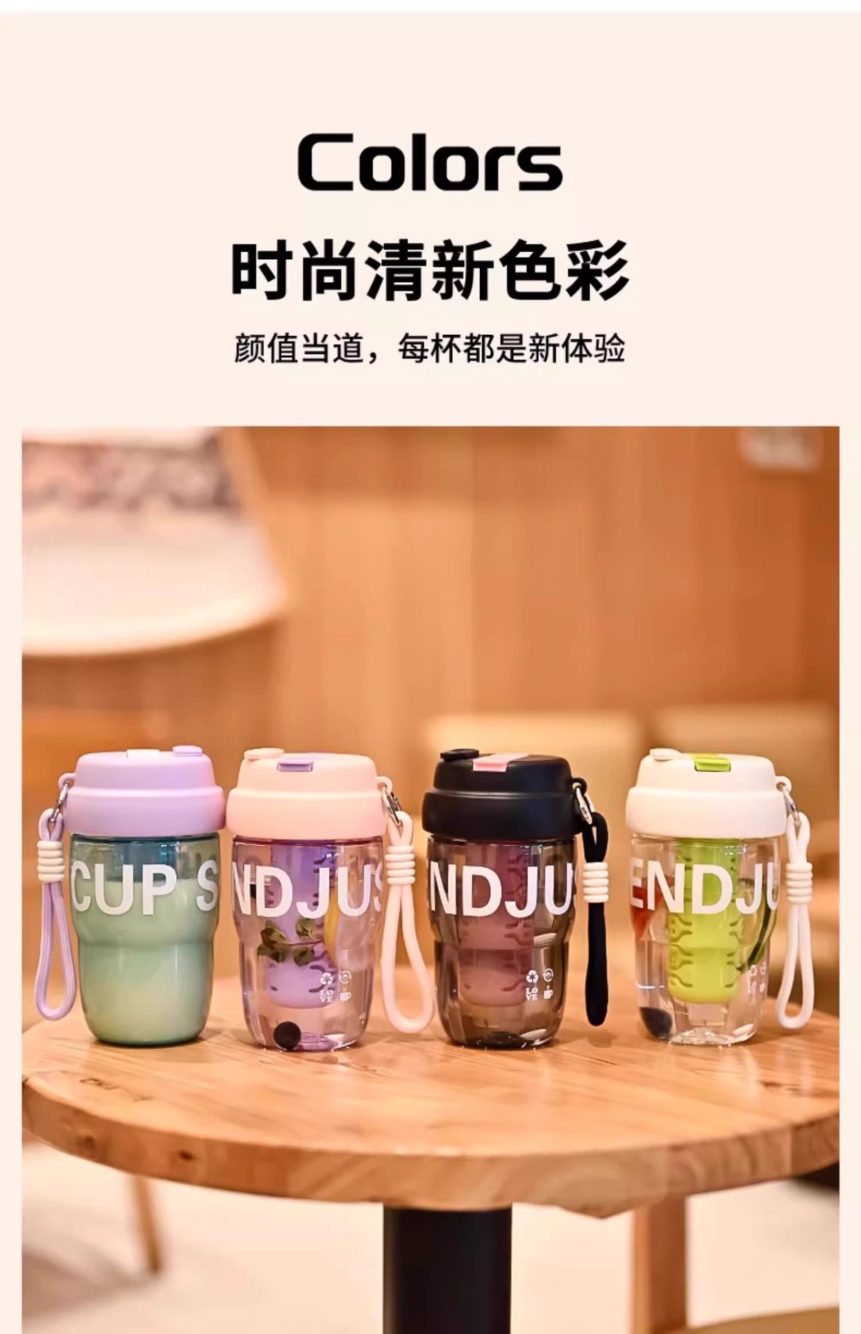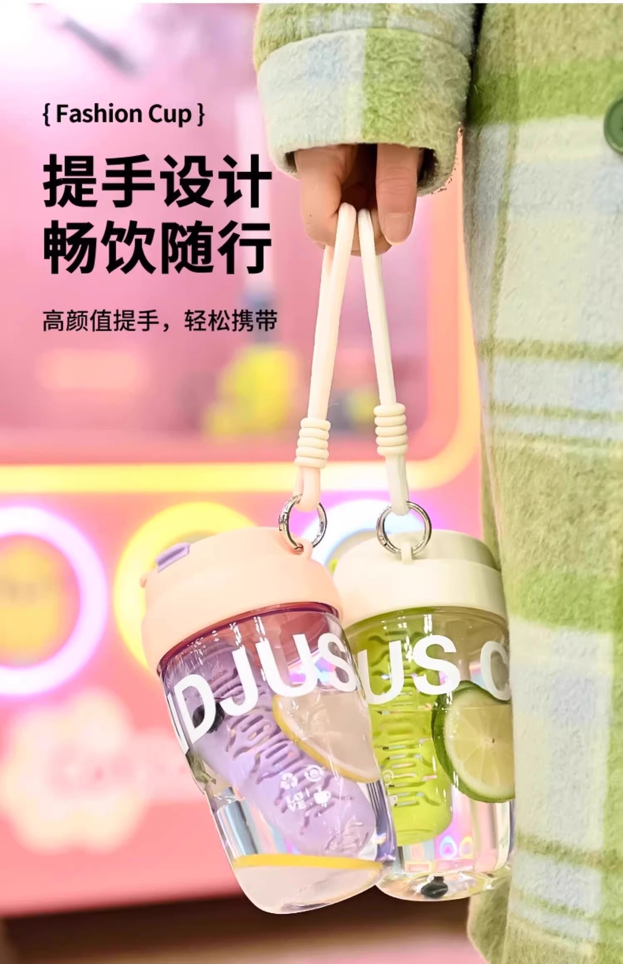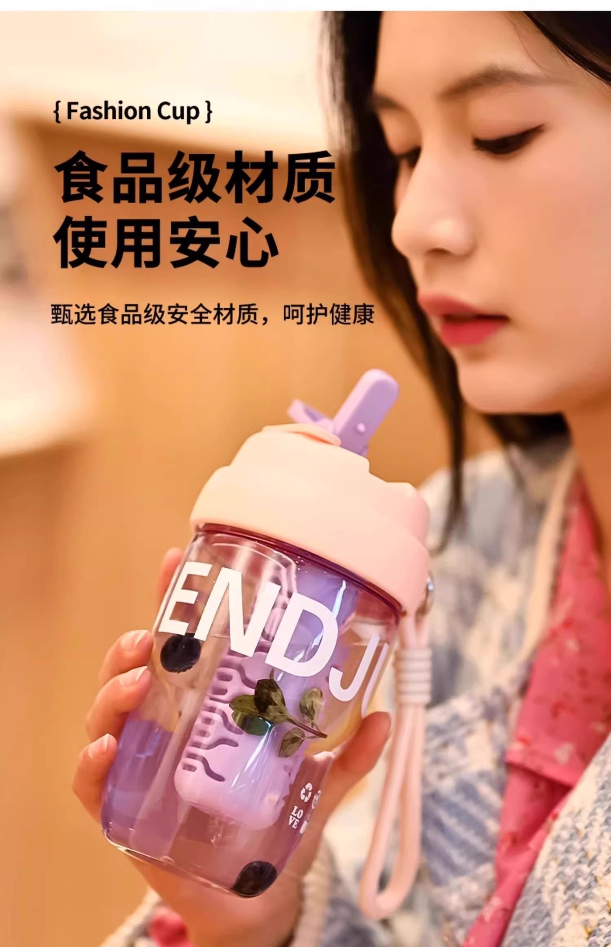 高颜值带吸管水杯户外运动耐摔塑料杯网红韩版学生便携双饮随行杯