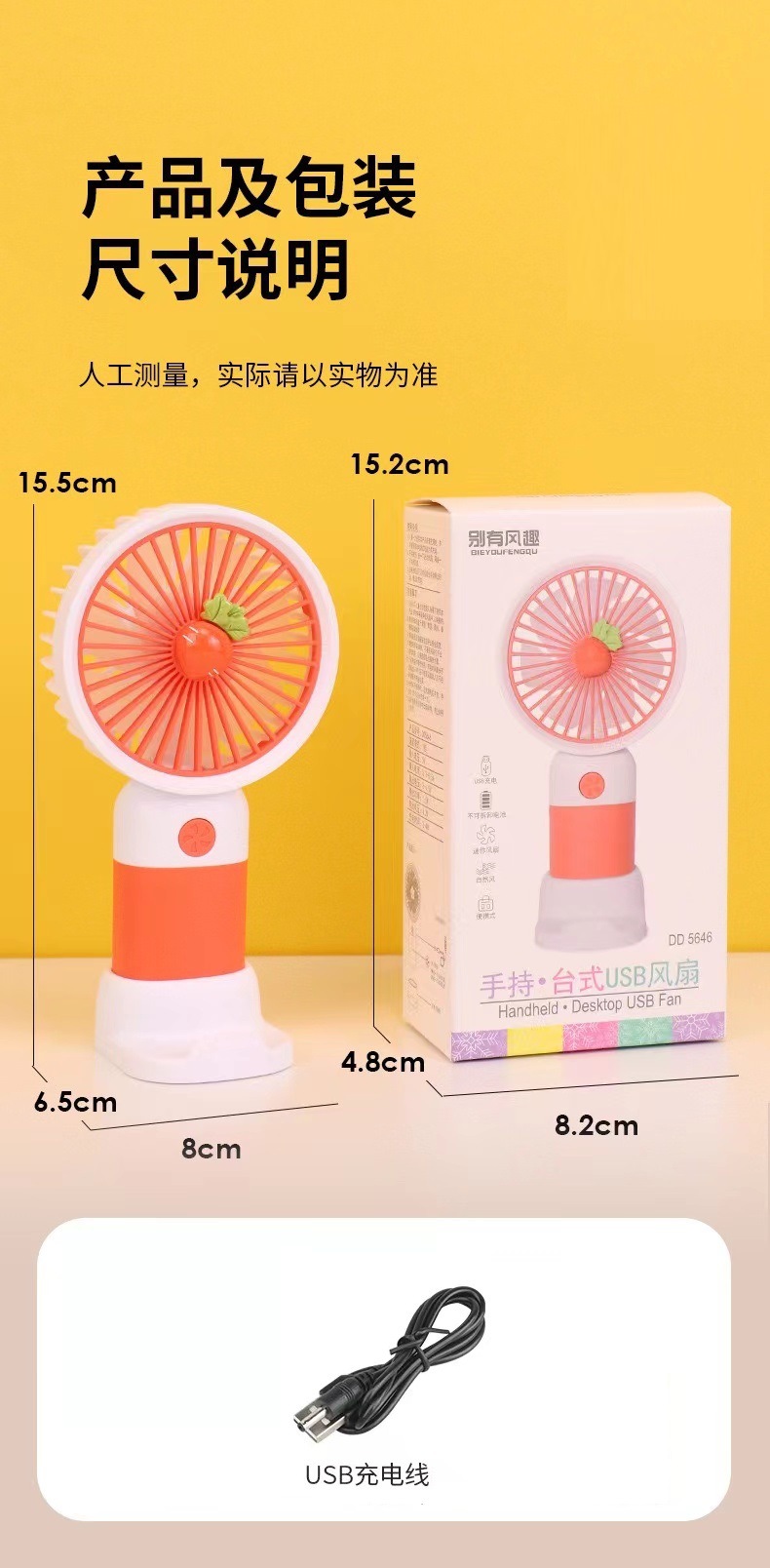 跨境热卖可爱高颜值小风扇带支架usb充电大风力1档手持风扇电风扇