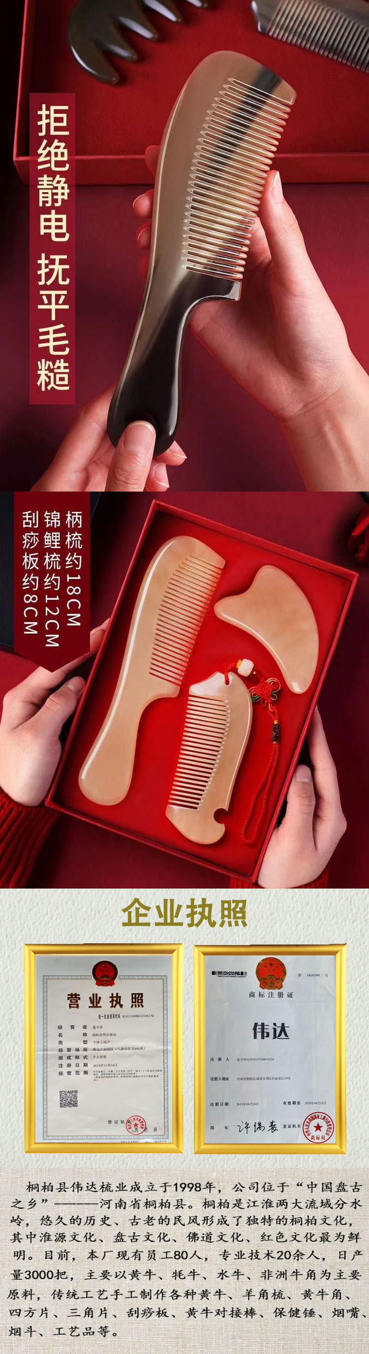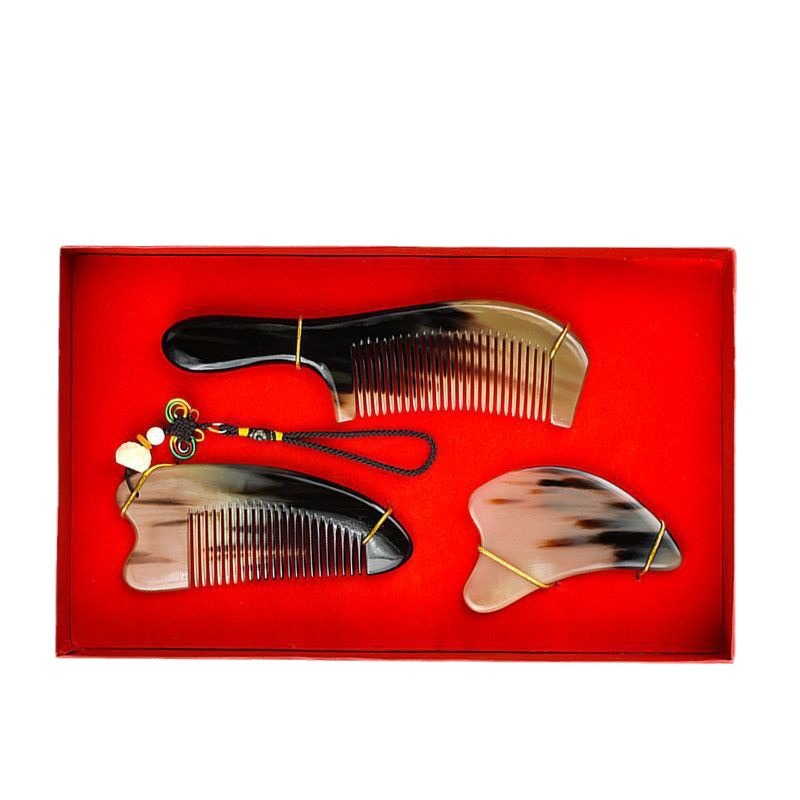 牦牛角三件套梳子结婚礼盒套装牛角梳子按摩刮痧梳女士专用