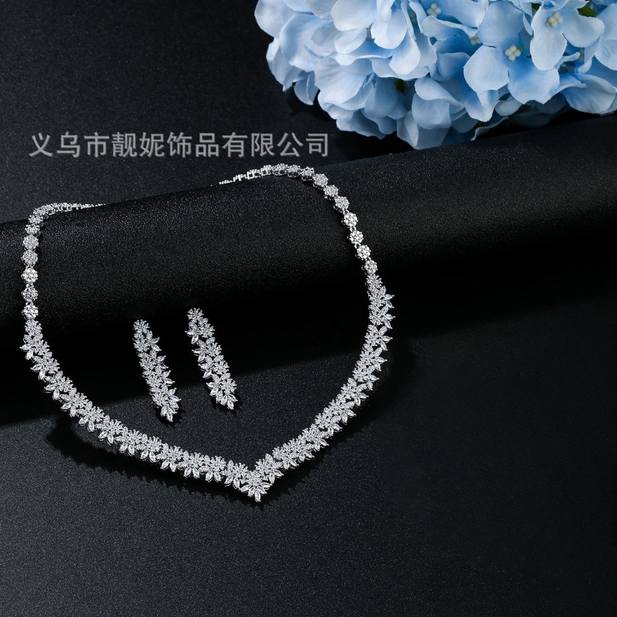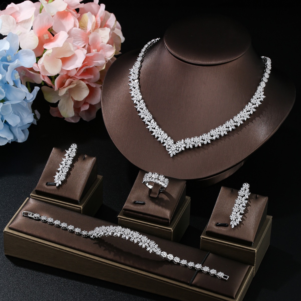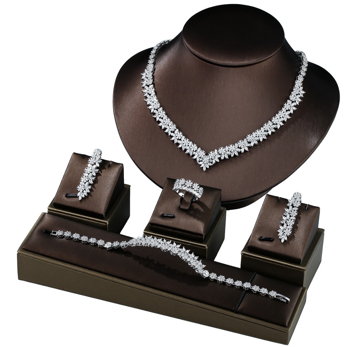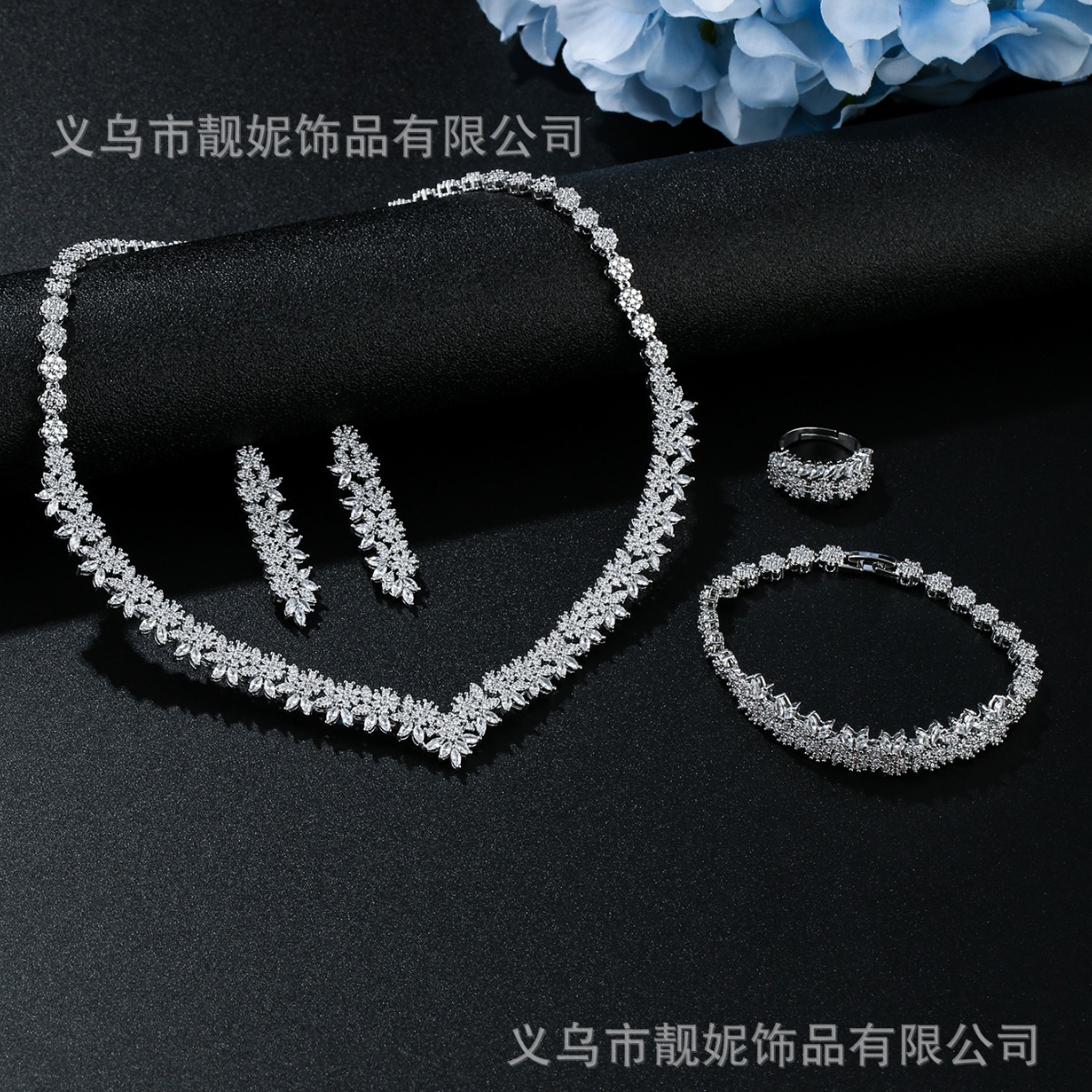 新款四件装新娘套装铜微镶锆石婚礼配饰项链耳环手链戒指