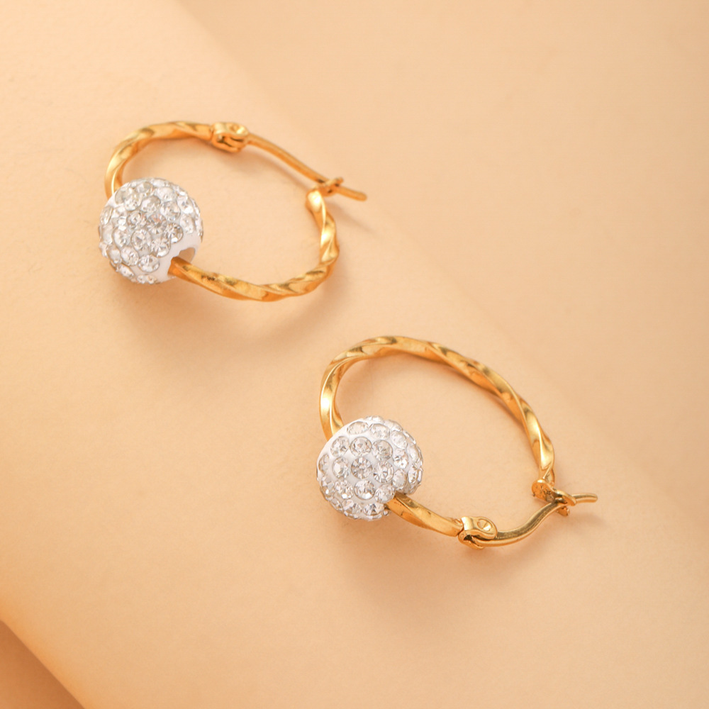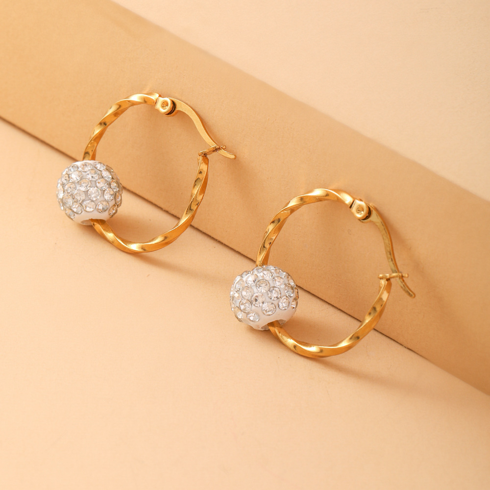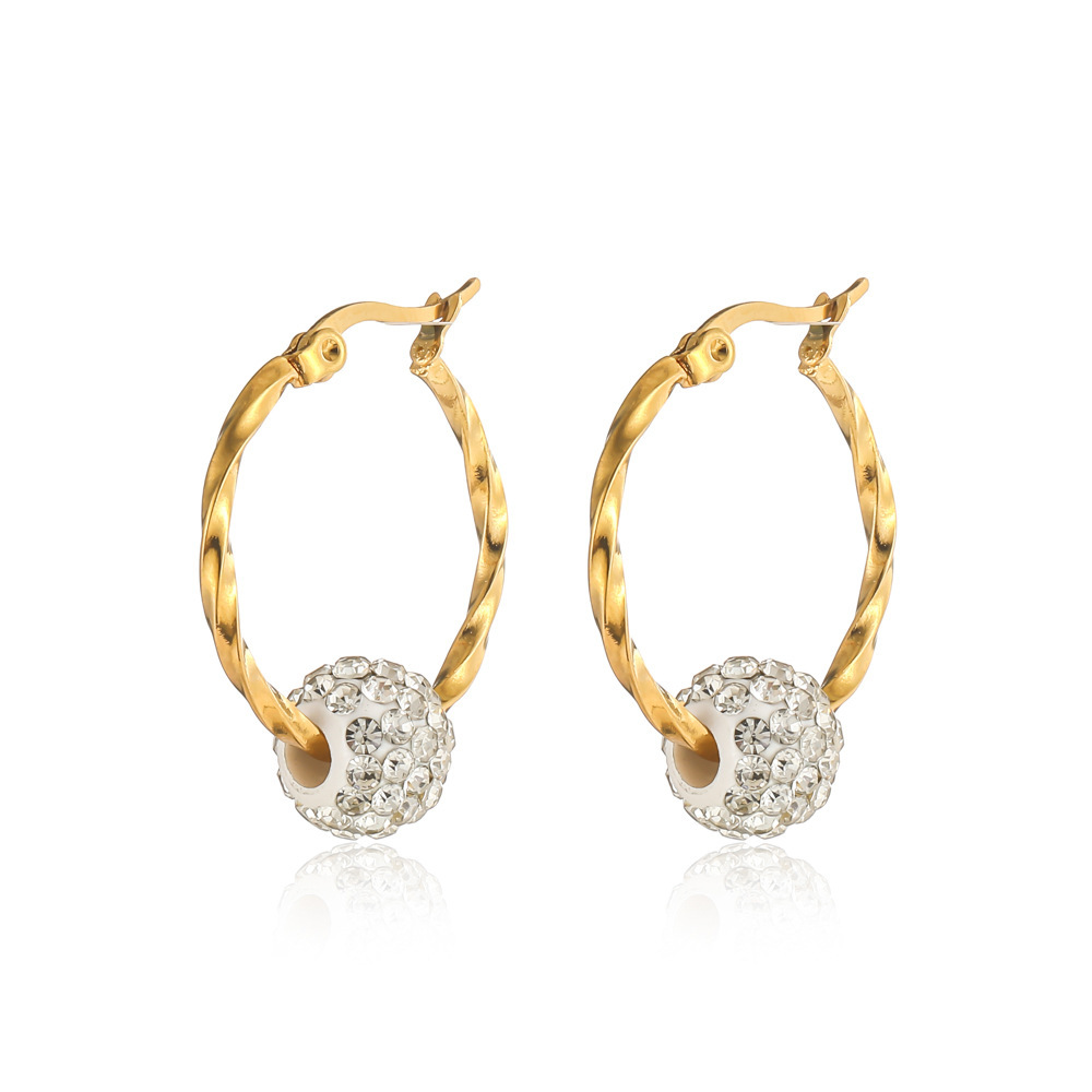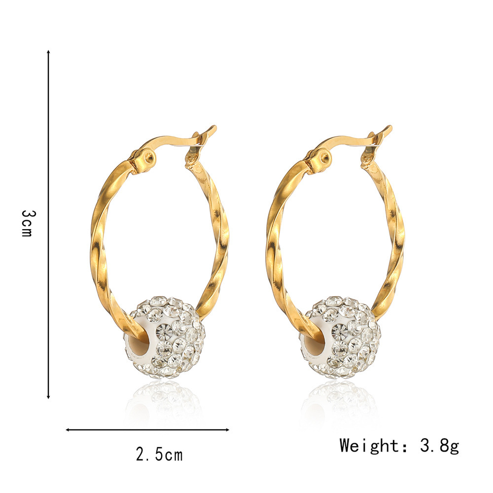 时尚简约陶泥水钻球不锈钢耳圈百搭优雅扭曲麻花镀金耳环钛钢耳环