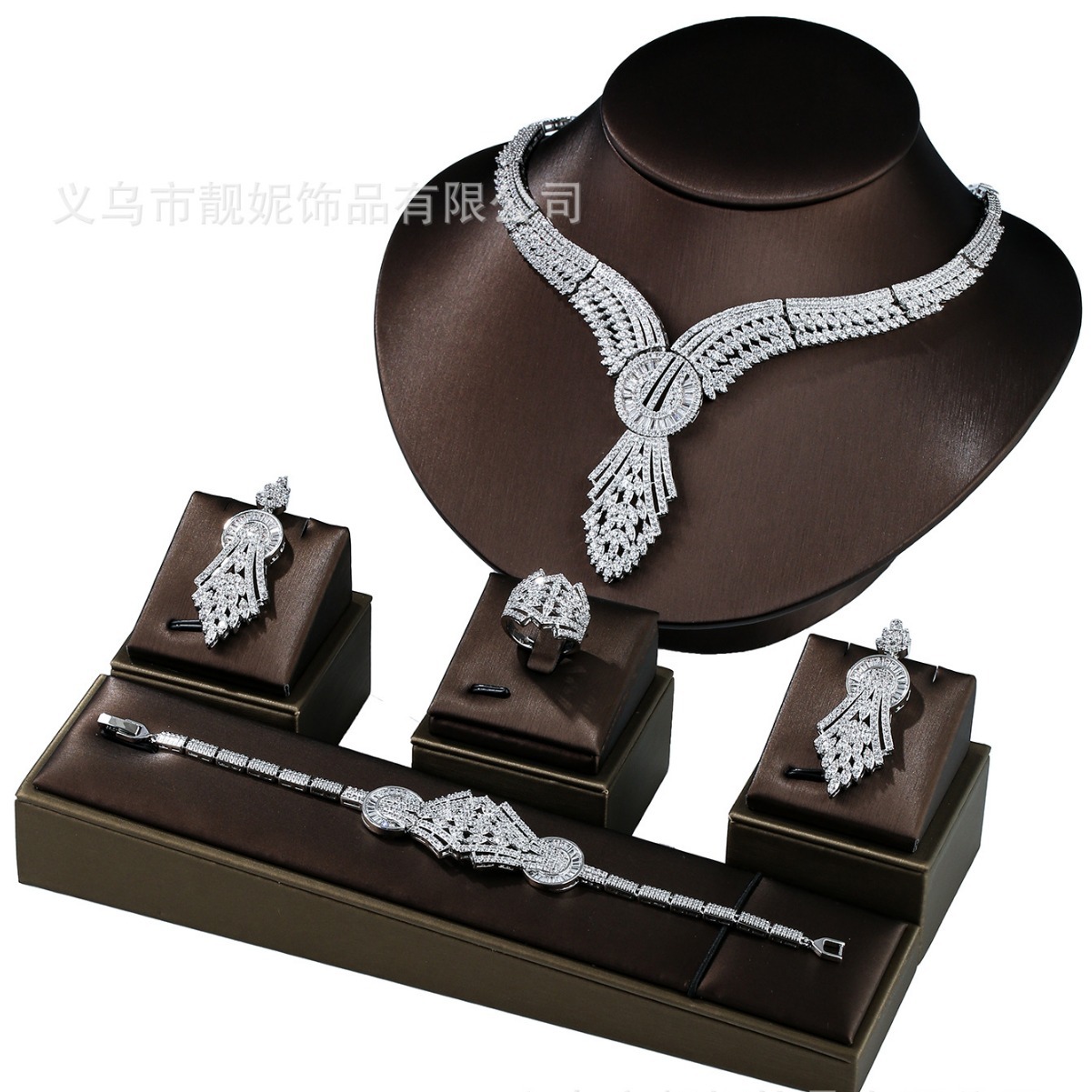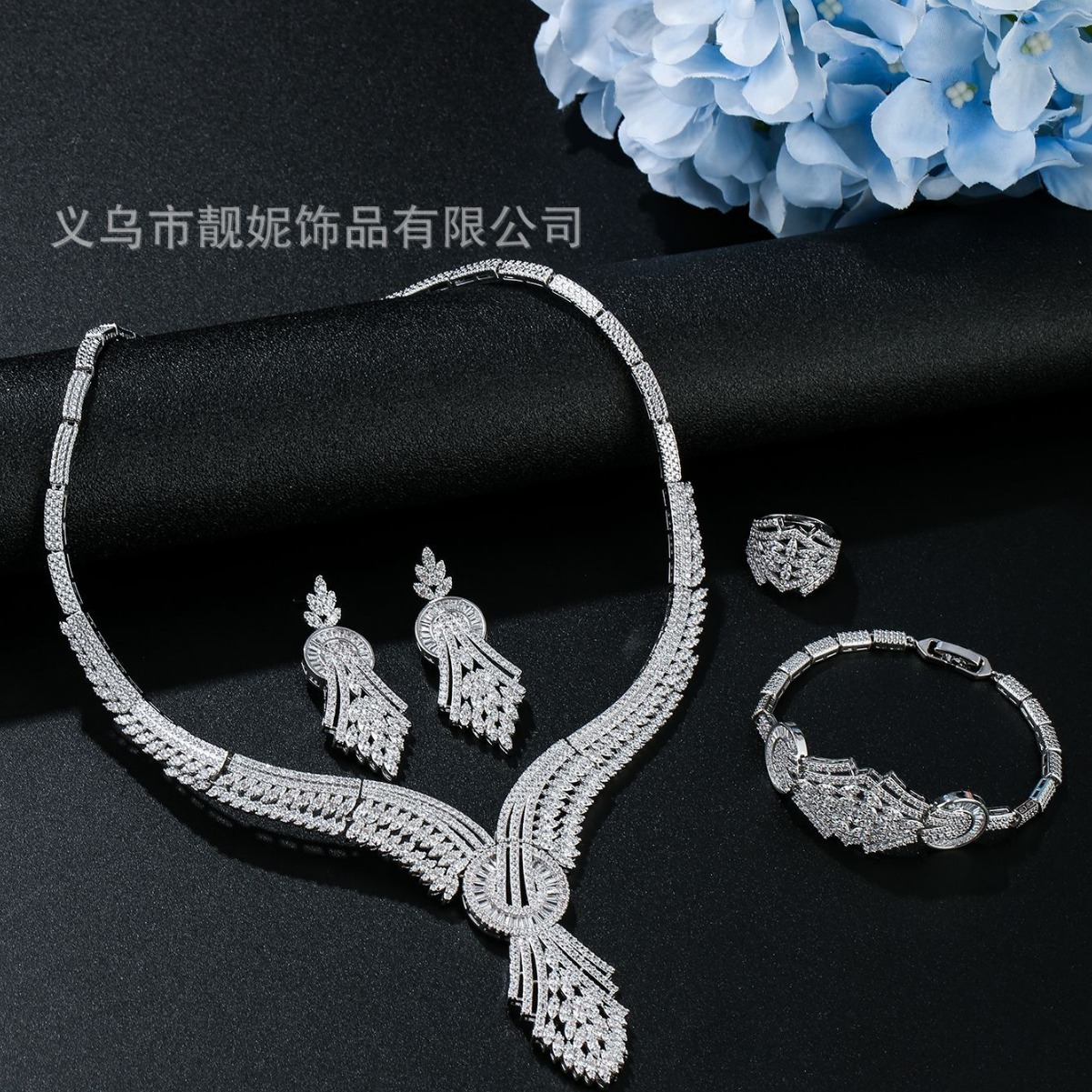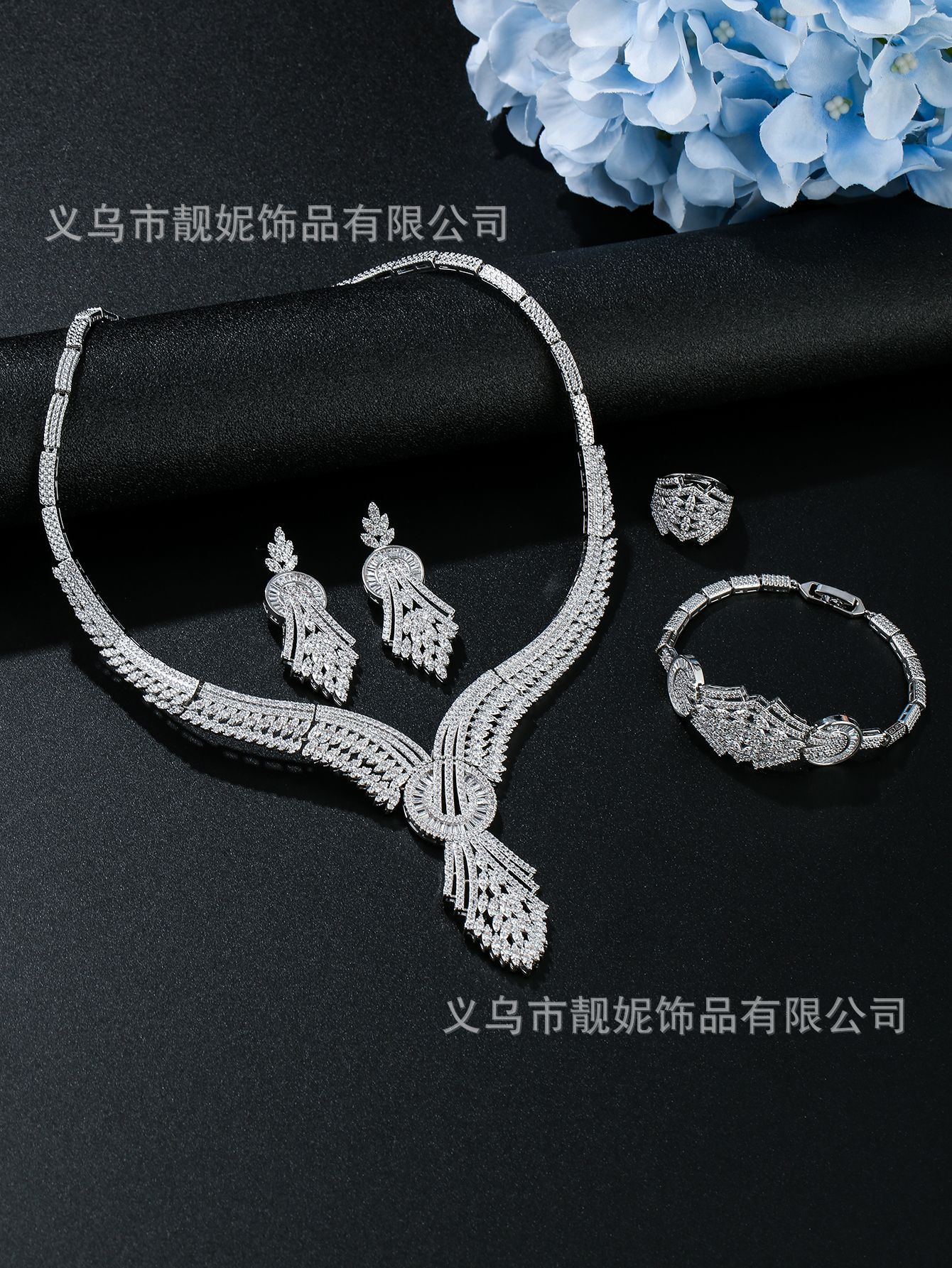 新款四件装新娘套装铜微镶锆石婚礼配饰项链耳环手链戒指